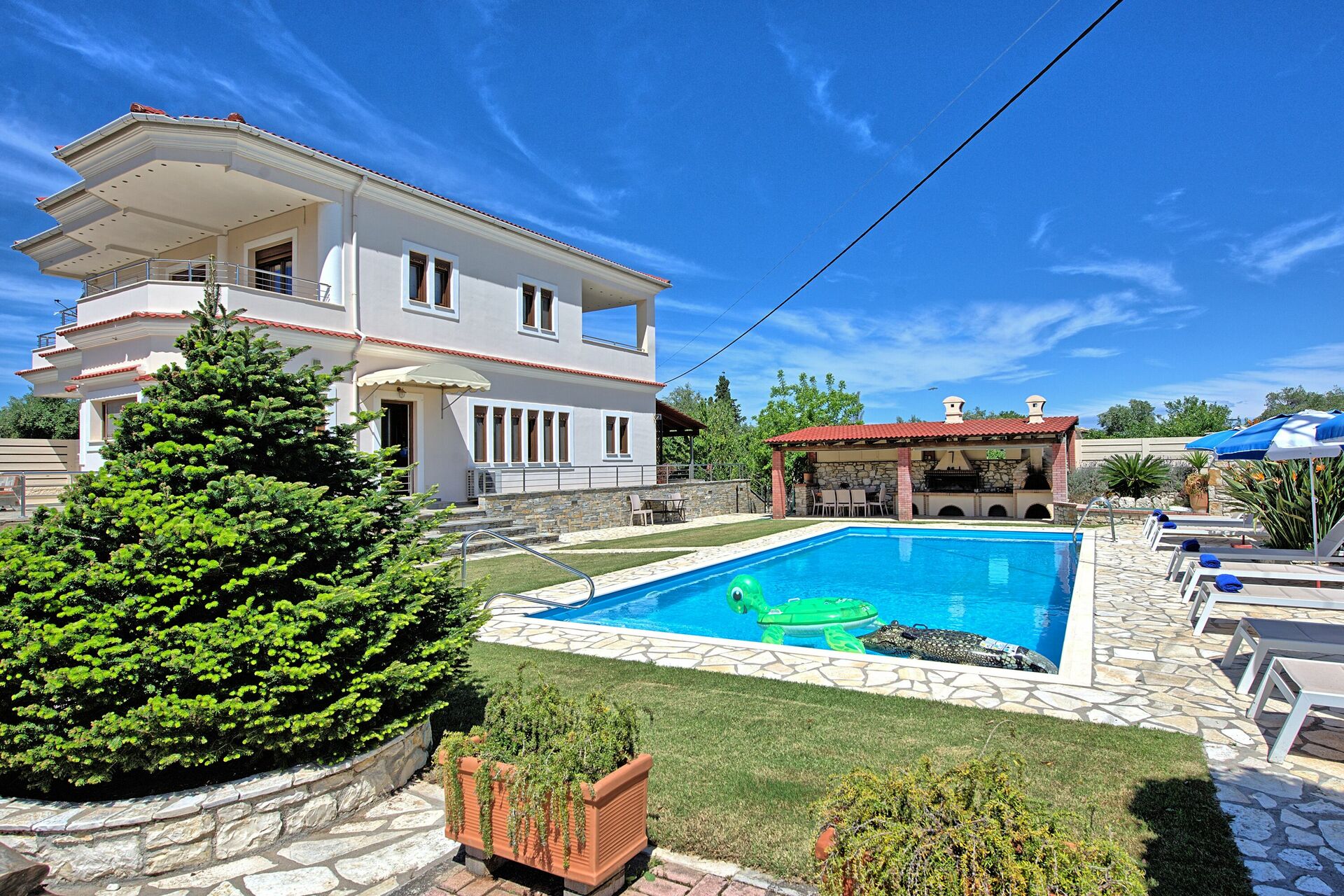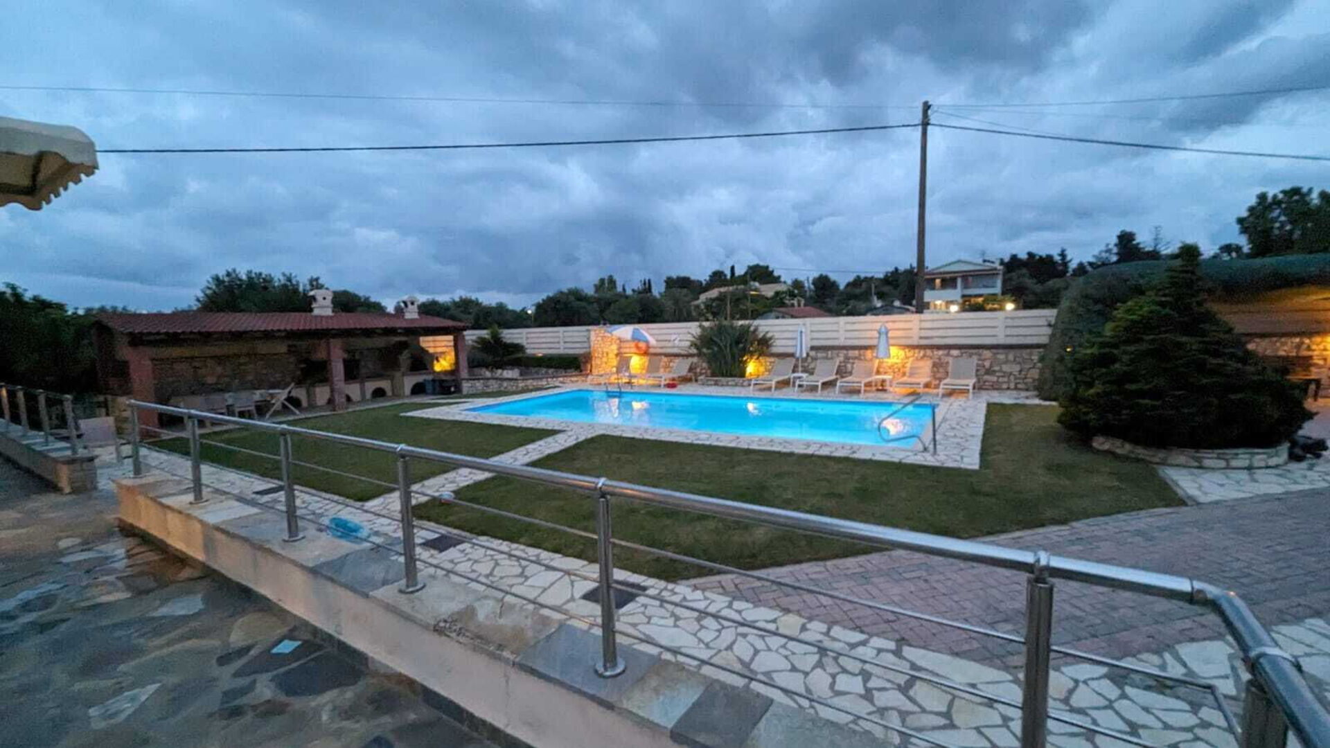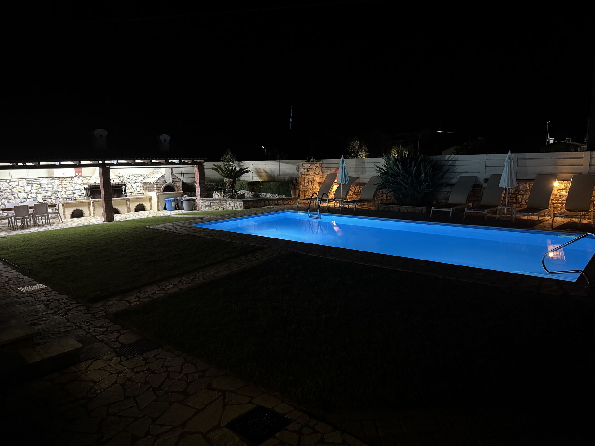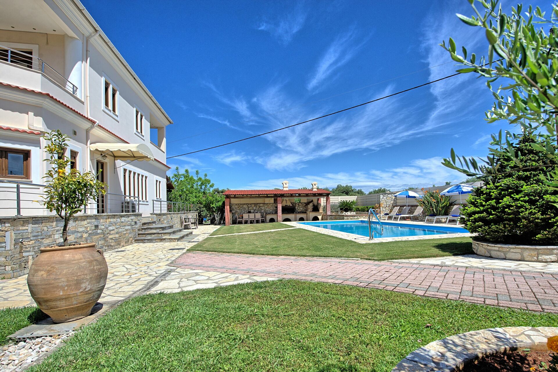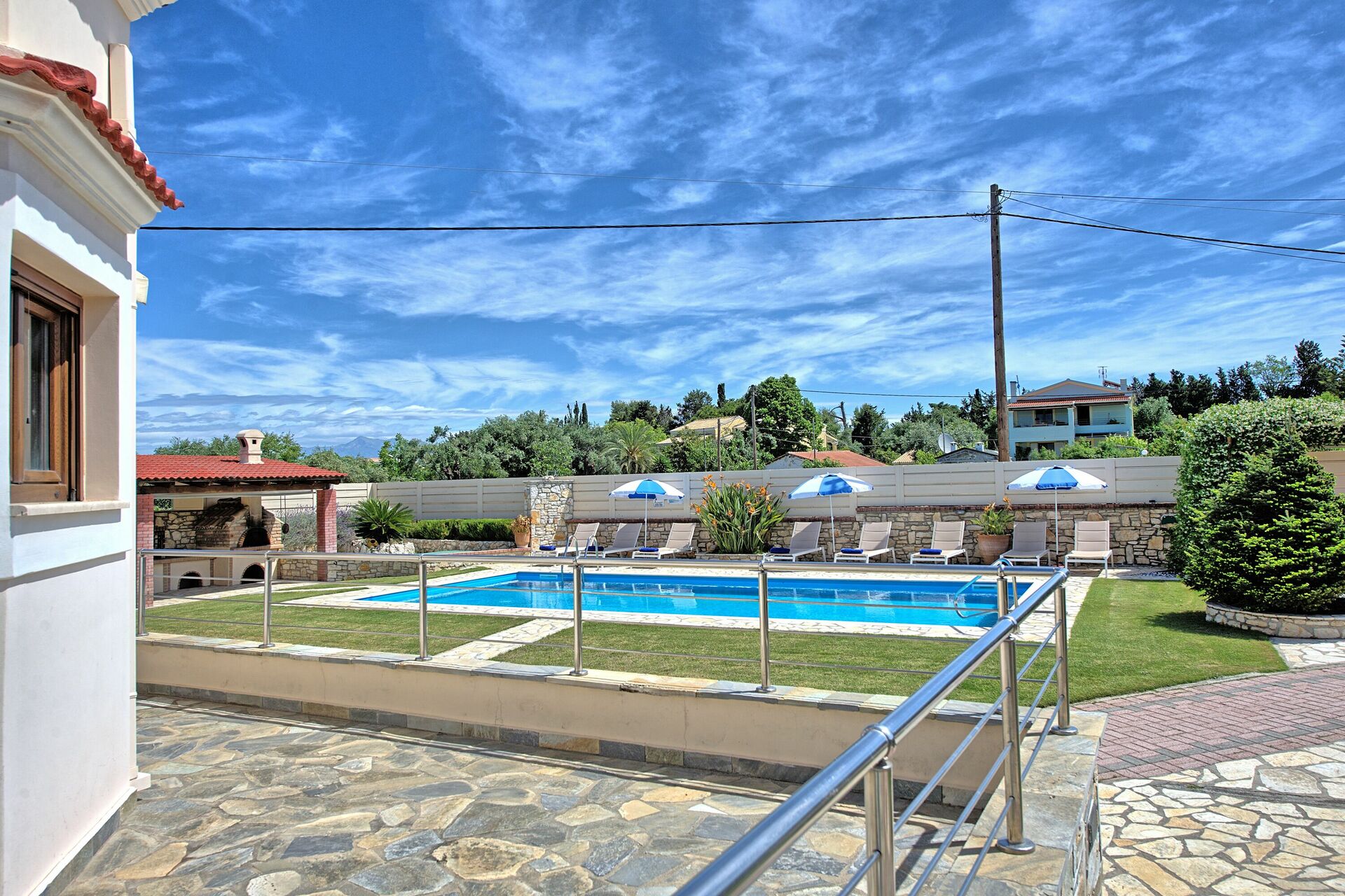 De buitenruimtes van de villa zijn volledig omheind. Het nieuw geïnstalleerde zwembad is 10m bij 5m (Romeinse trappen, diepte 1,5 m) en is omgeven door prachtig onderhouden tuinen met gazon. Comfortabele ligbedden voor alle gasten en parasols zijn aanwezig. De liefhebbers van dineren in de buitenlucht zullen echt verliefd worden op de enorme buitenkeuken, uitgerust met bakstenen barbecue en zelfs een houtoven! Tafel en stoelen om te genieten van lange maaltijden onder de Griekse hemel worden verzorgd door de barbecue en op het achterterras. Het terrein is 's nachts prachtig verlicht. Beveiligd parkeren voor 2 auto's is ook beschikbaar.