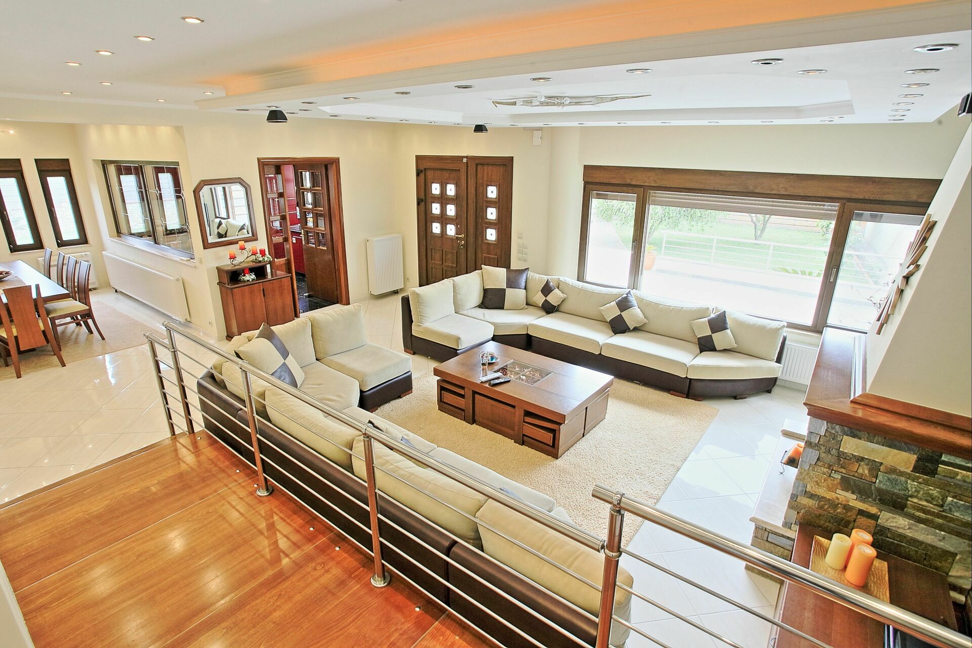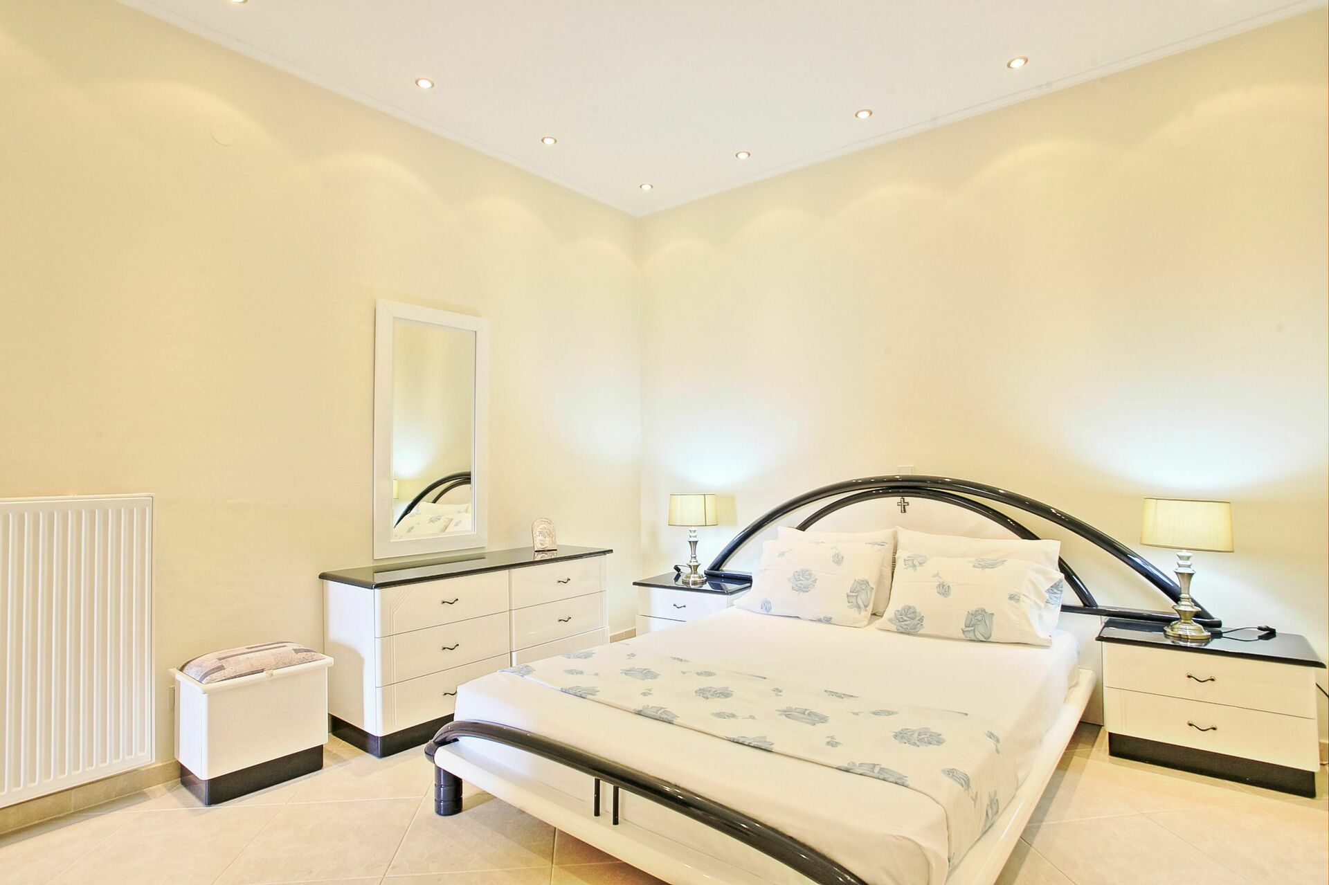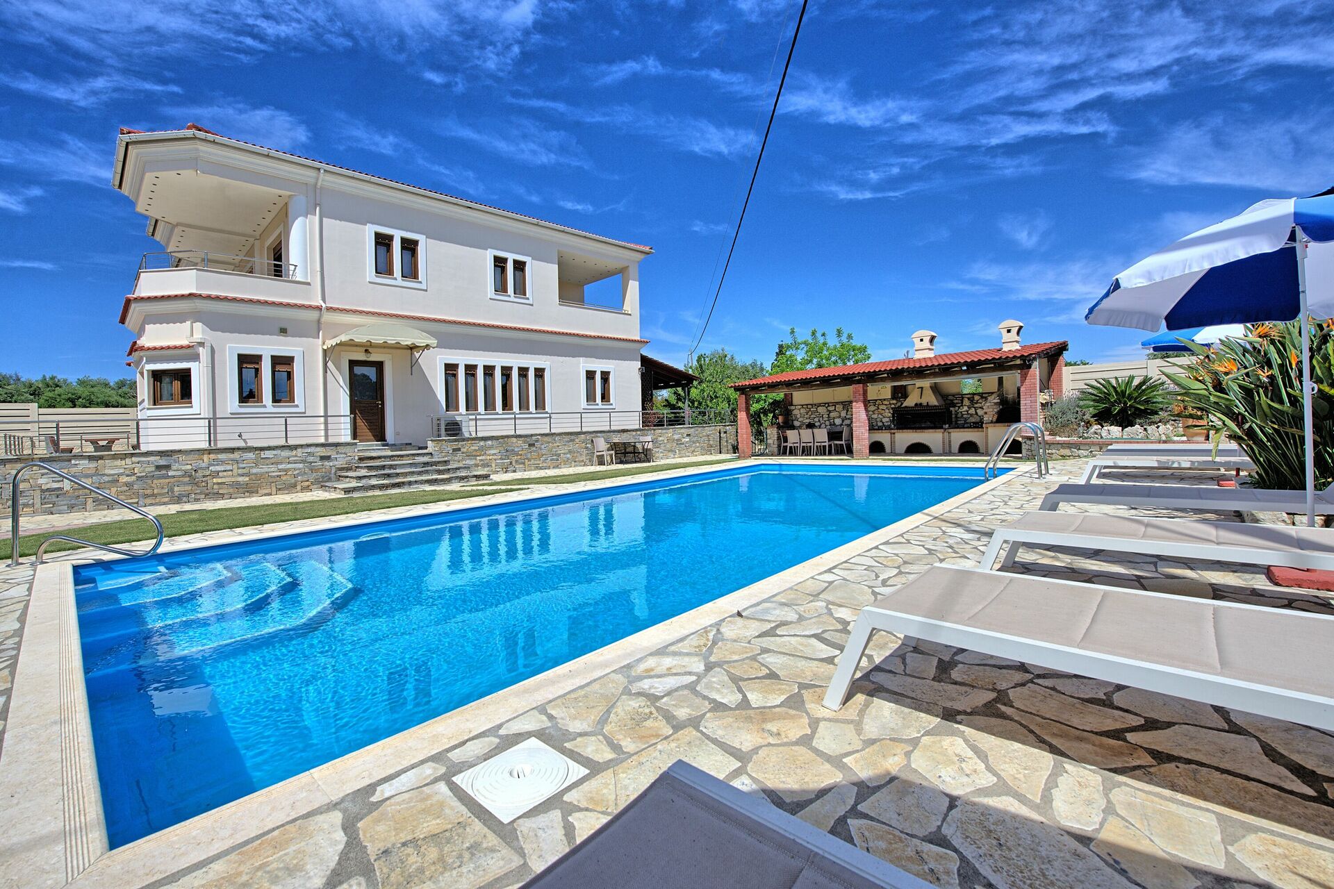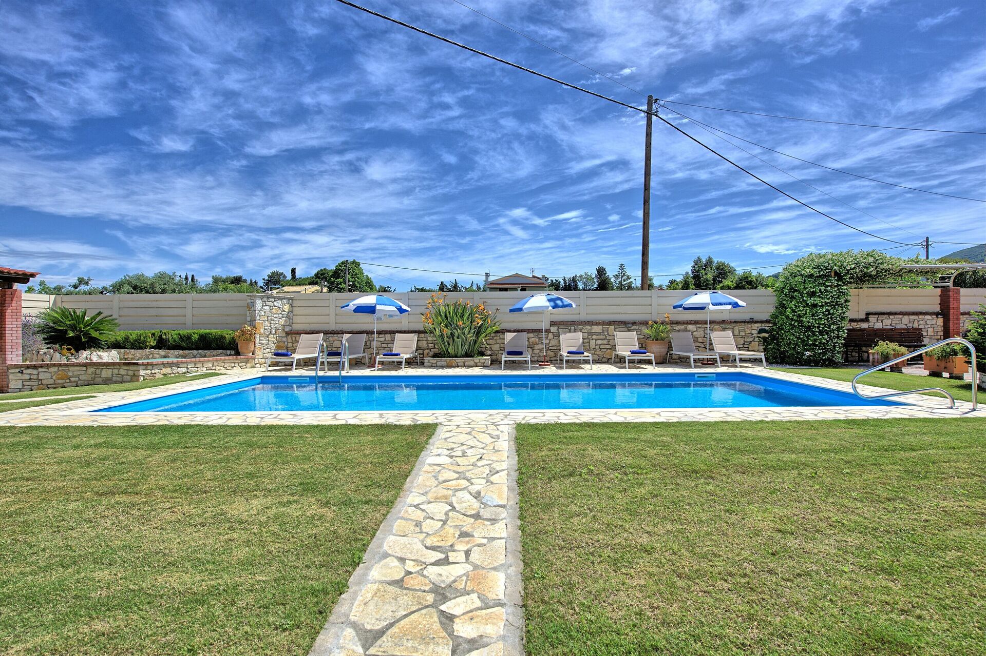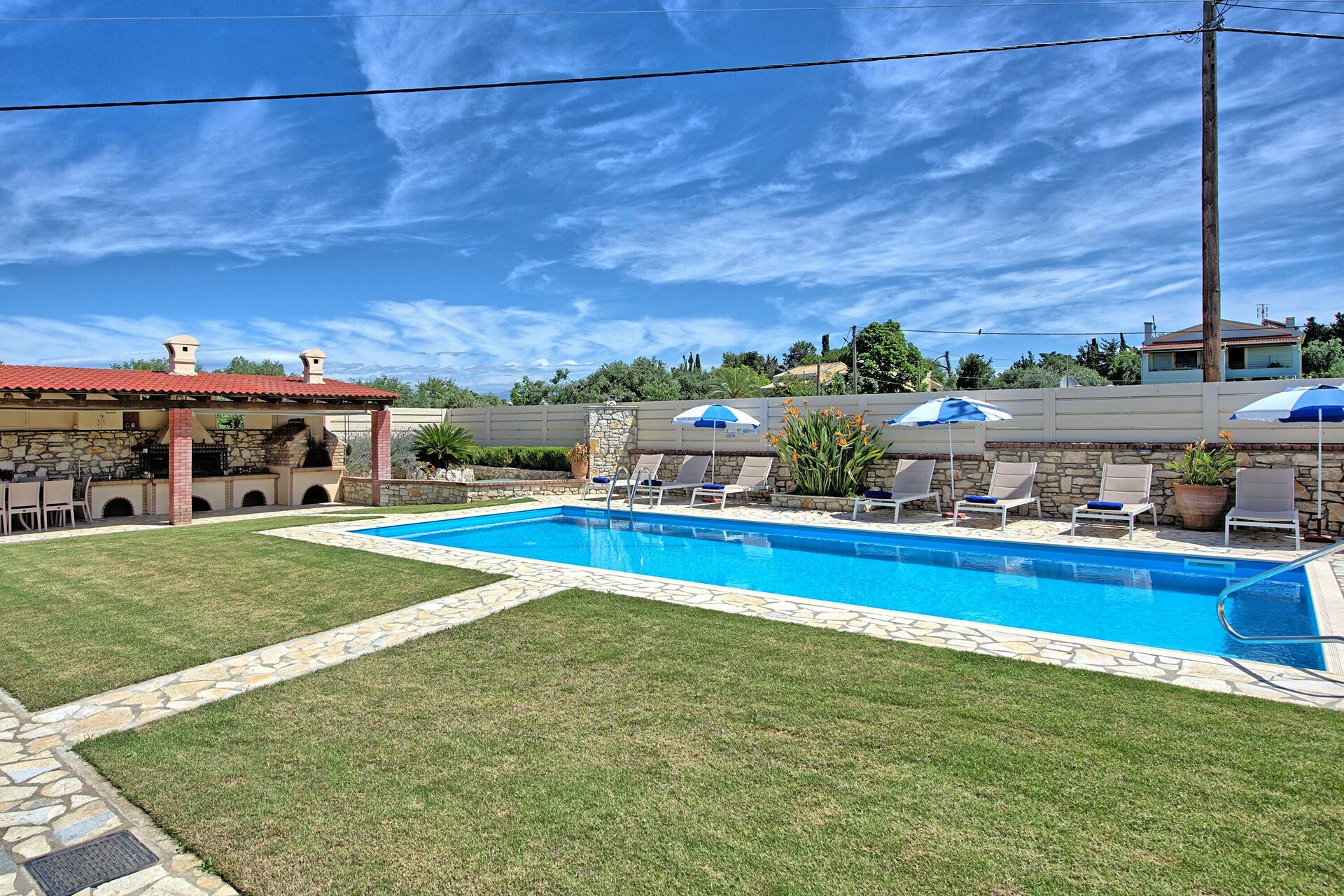 De buitenruimtes van de villa zijn volledig omheind. Het nieuw geïnstalleerde zwembad is 10m bij 5m (Romeinse trappen, diepte 1,5 m) en is omgeven door prachtig onderhouden tuinen met gazon. Comfortabele ligbedden voor alle gasten en parasols zijn aanwezig. De liefhebbers van dineren in de buitenlucht zullen echt verliefd worden op de enorme buitenkeuken, uitgerust met bakstenen barbecue en zelfs een houtoven! Tafel en stoelen om te genieten van lange maaltijden onder de Griekse hemel worden verzorgd door de barbecue en op het achterterras. Het terrein is 's nachts prachtig verlicht. Beveiligd parkeren voor 2 auto's is ook beschikbaar.