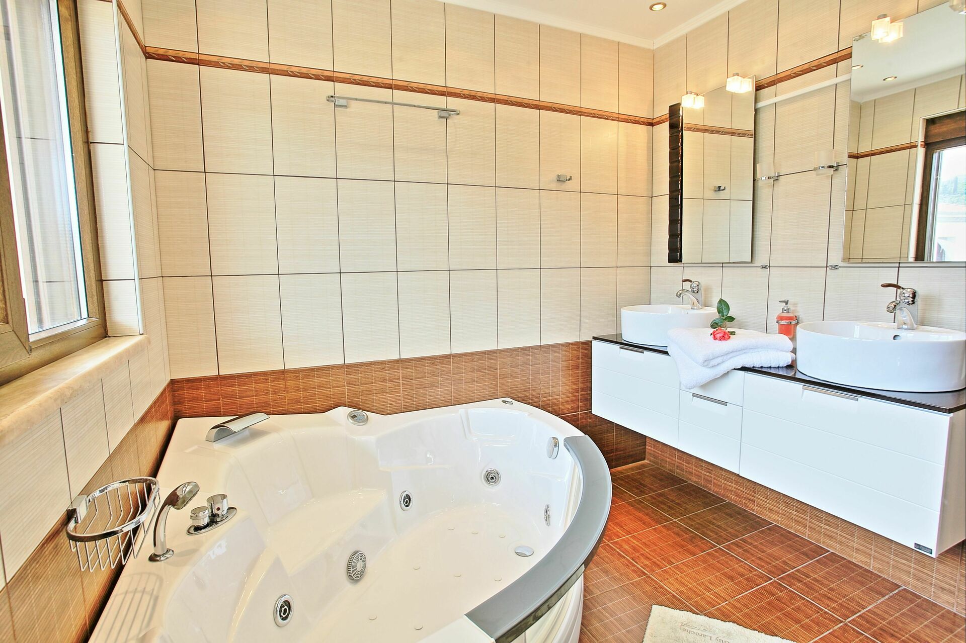 Binnen is deze luxe vakantiewoning verdeeld over 2 verdiepingen en is toegankelijk via een trap. De ingang komt uit in een grote woonkamer met comfortabele banken, een stenen openhaard, satelliet-tv en een eettafel voor 10 personen. Grote ramen en honderden spotjes op het plafond zorgen voor een gevoel van ruimte en vrijheid. De aparte keuken, speciaal gebouwd voor deze villa, beschikt over marmeren oppervlakken en de beste Miele-apparaten op de markt (inclusief vaatwasser, oven, magnetron, enz.). Op de begane grond zijn er ook een toilet voor de gasten, een slaapkamer met tweepersoonsbed (met toegang tot een beschut achterbalkon), een familiebadkamer met bad + wasmachine, een douche.