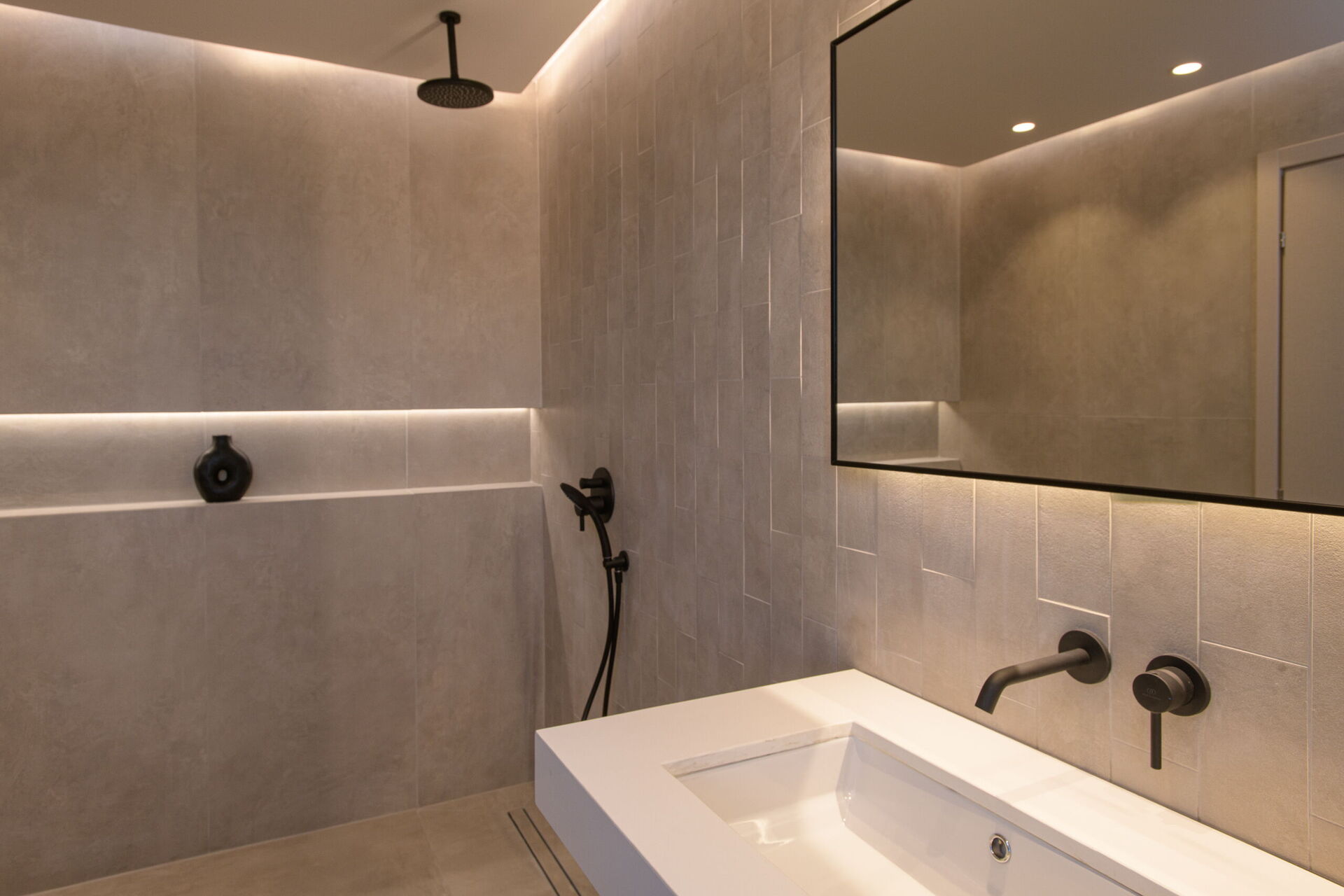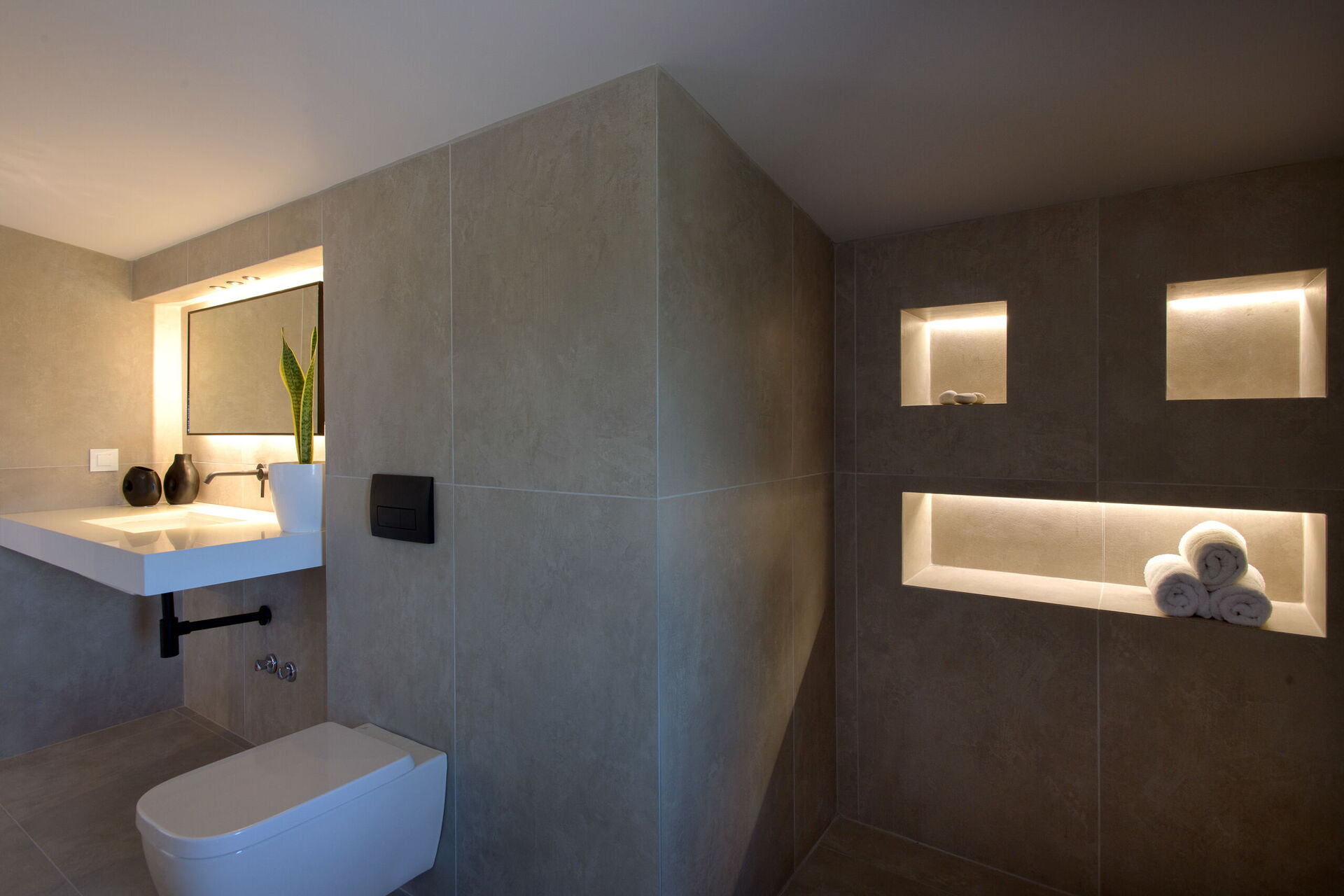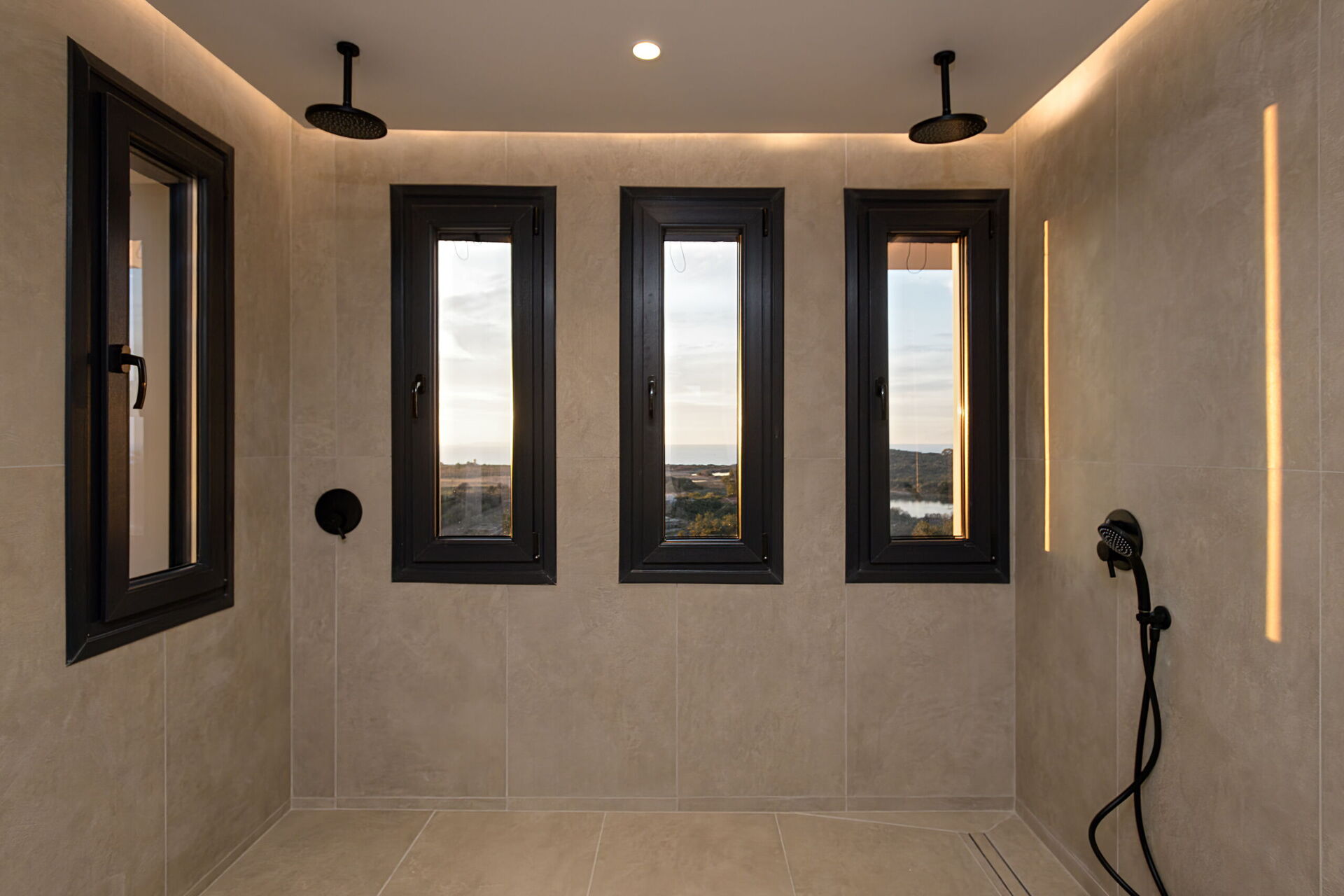 Eerste verdieping: groot tweepersoons slaapkamer met privé badkamer met dubbele wastafel en dubbele douche, panoramisch privéterras, tweepersoons slaapkamer met eigen badkamer met douche