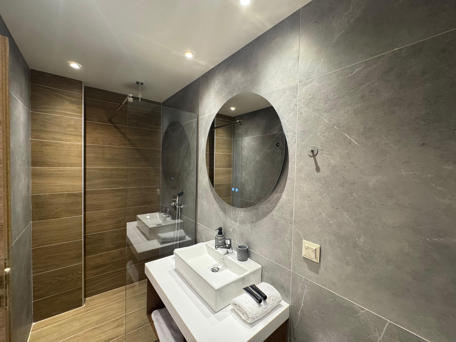 Eerste Verdieping: 2 slaapkamers, elk met eigen badkamer met douche; slaapkamer met 2 eenpersoonsbedden (kunnen op aanvraag worden samengevoegd) en eigen badkamer met douche.