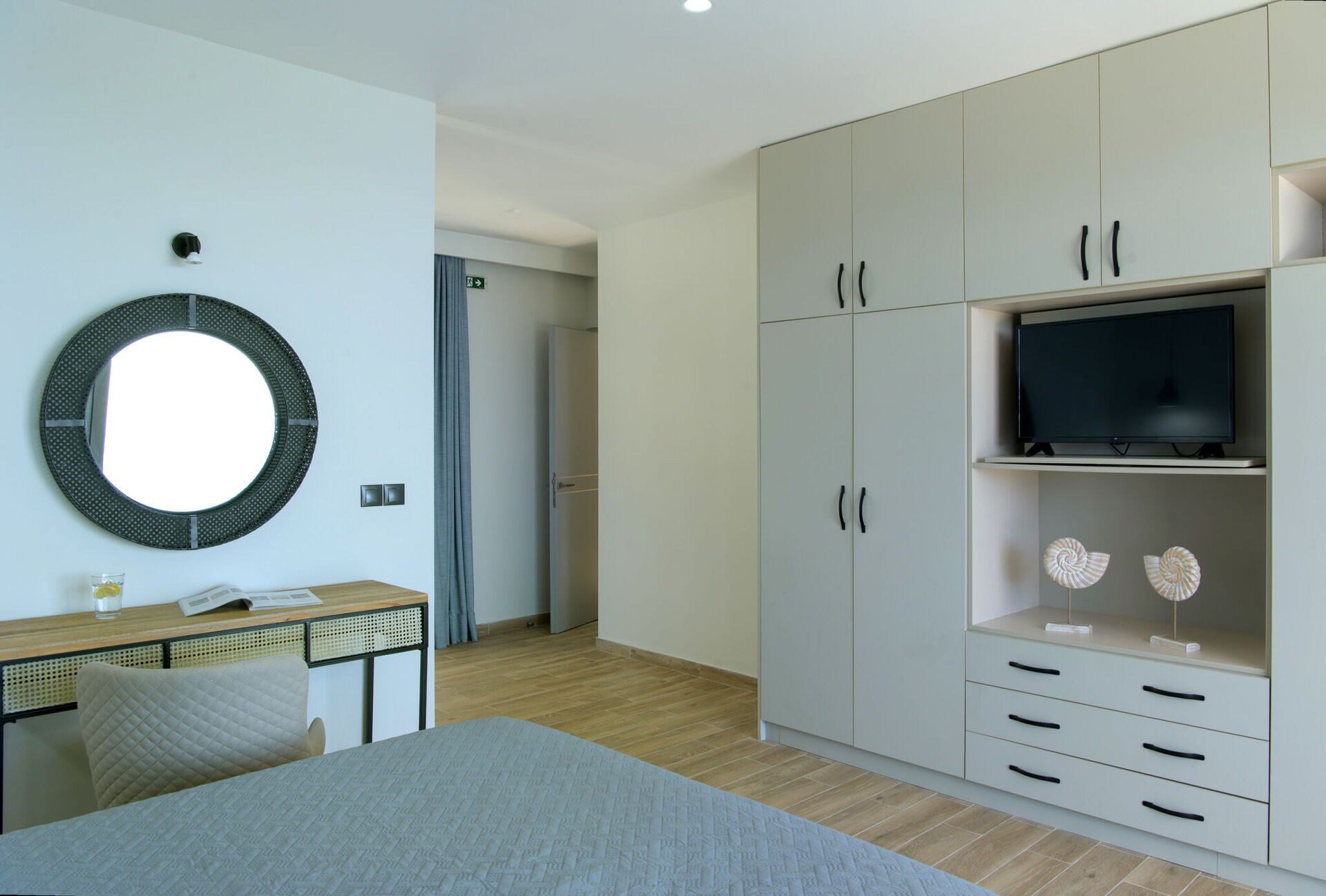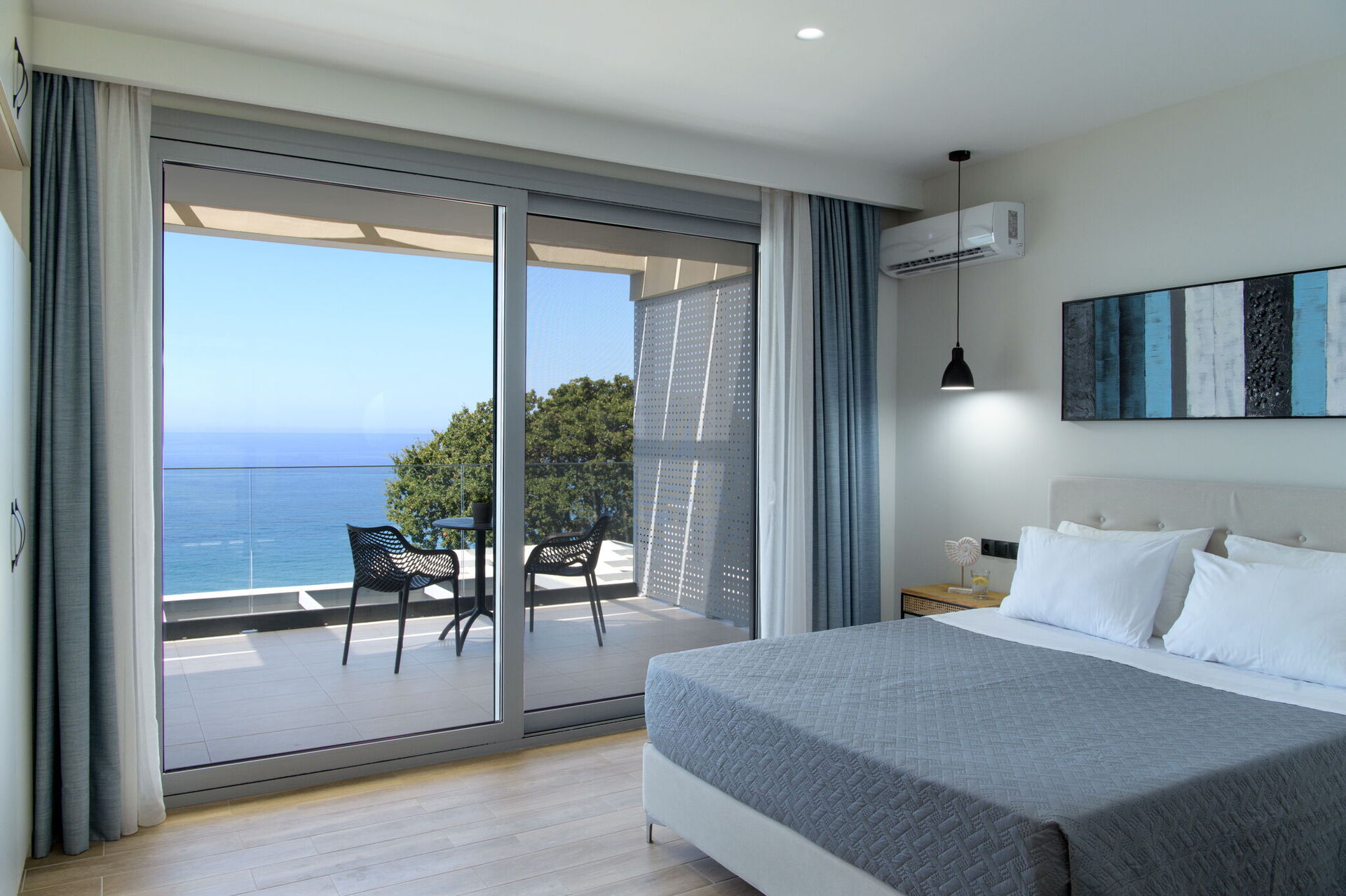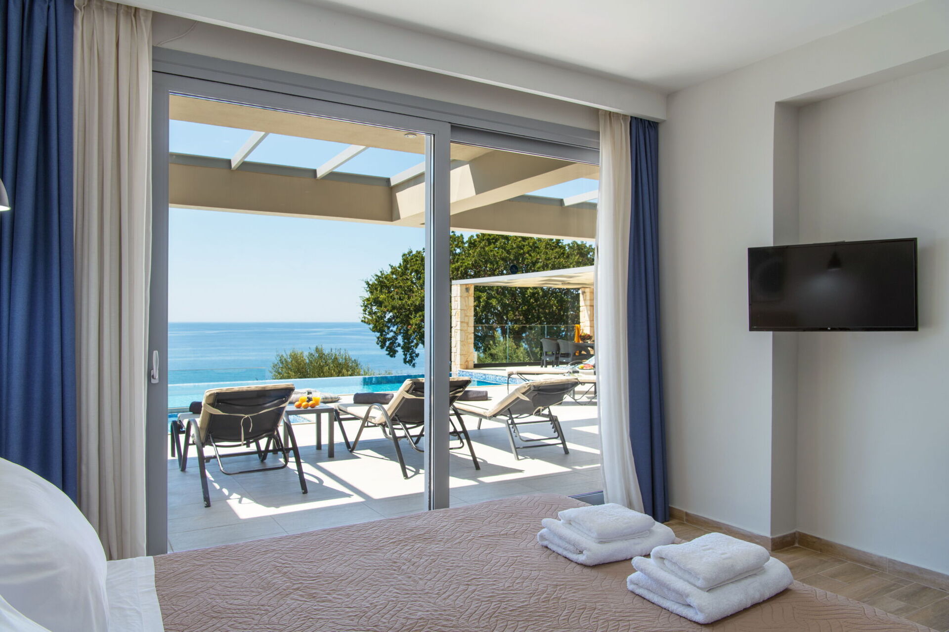 Beide slaapkamers hebben toegang tot een gemeubileerd terras met panoramisch uitzicht op zee en zwembad.
