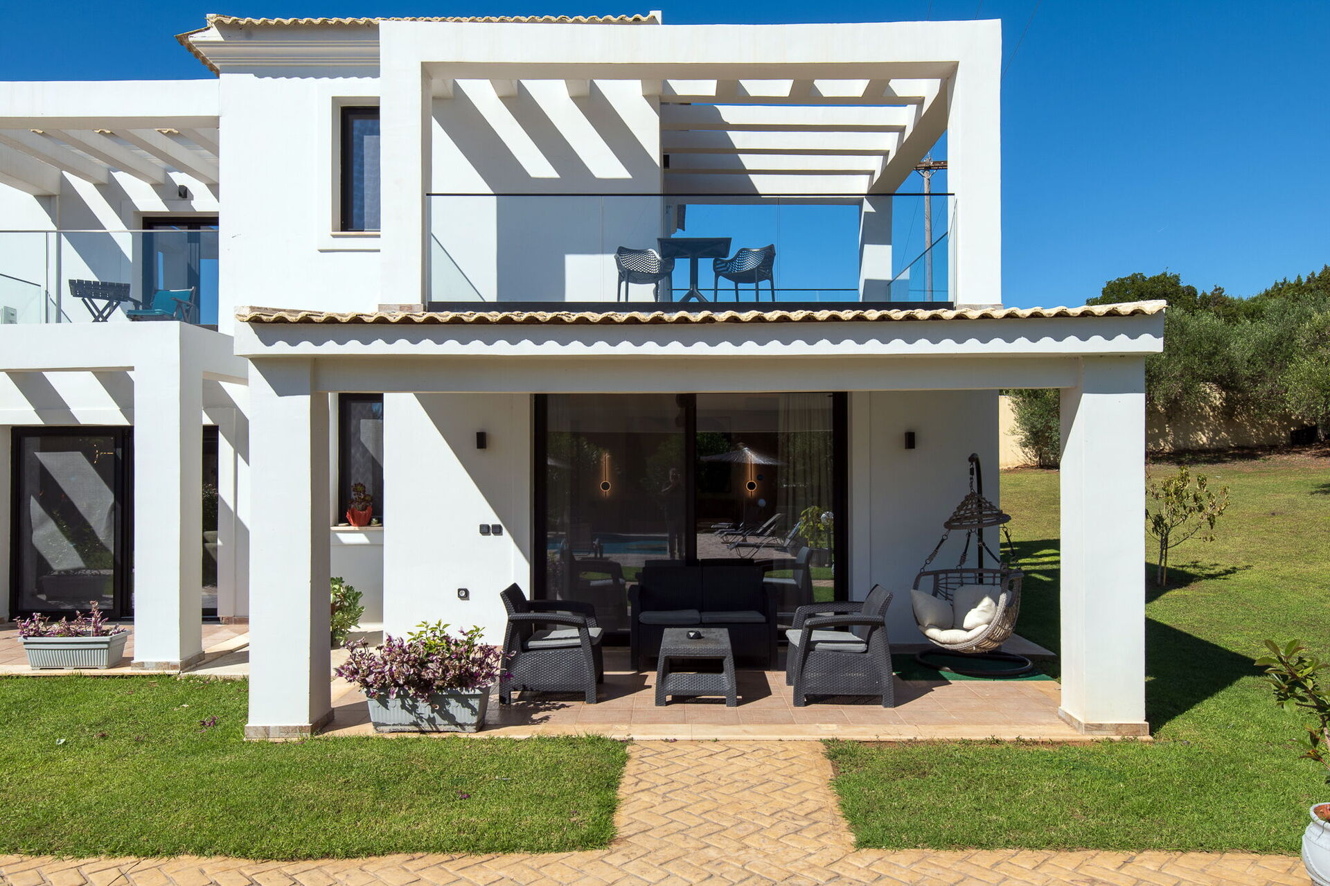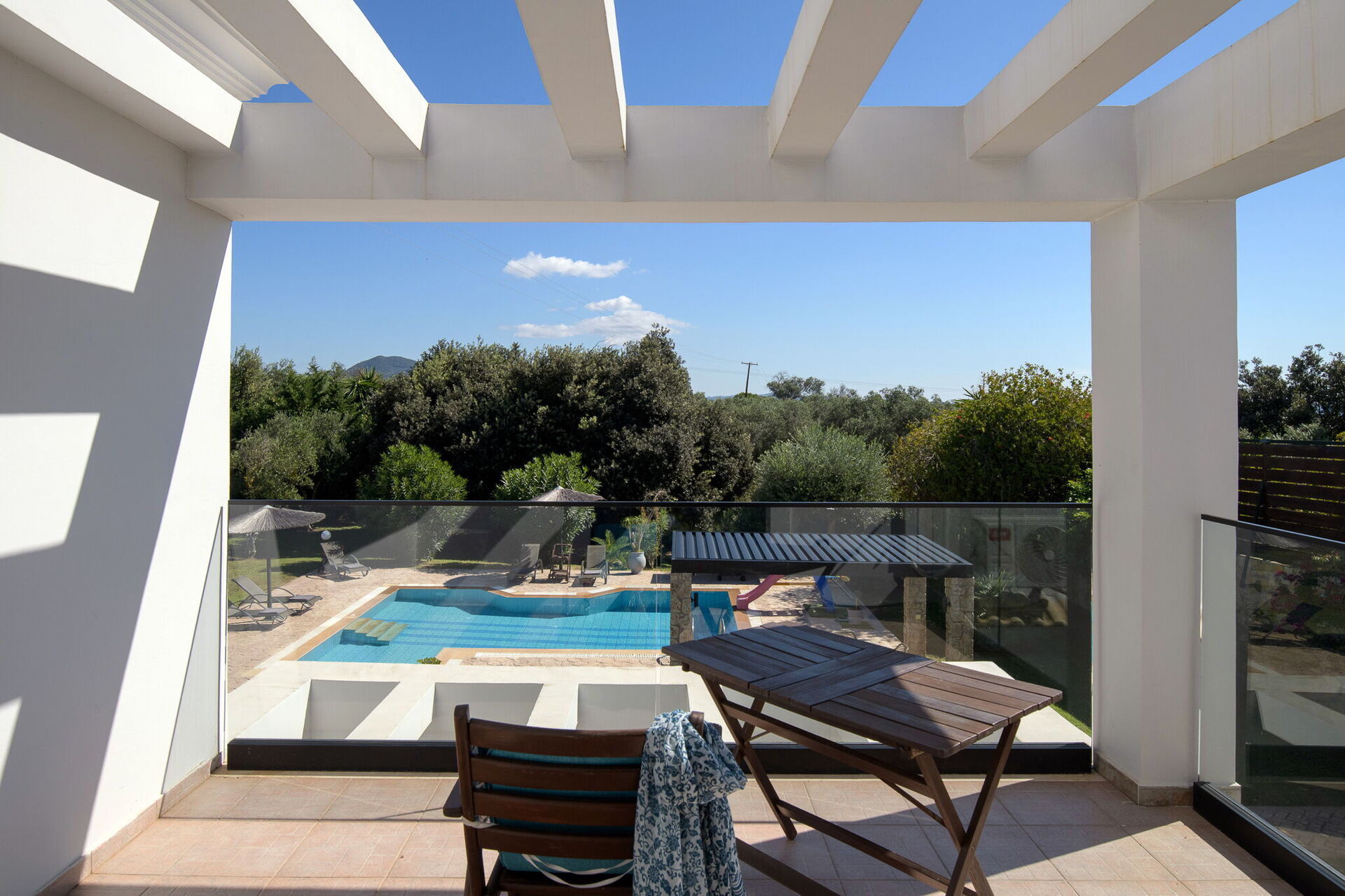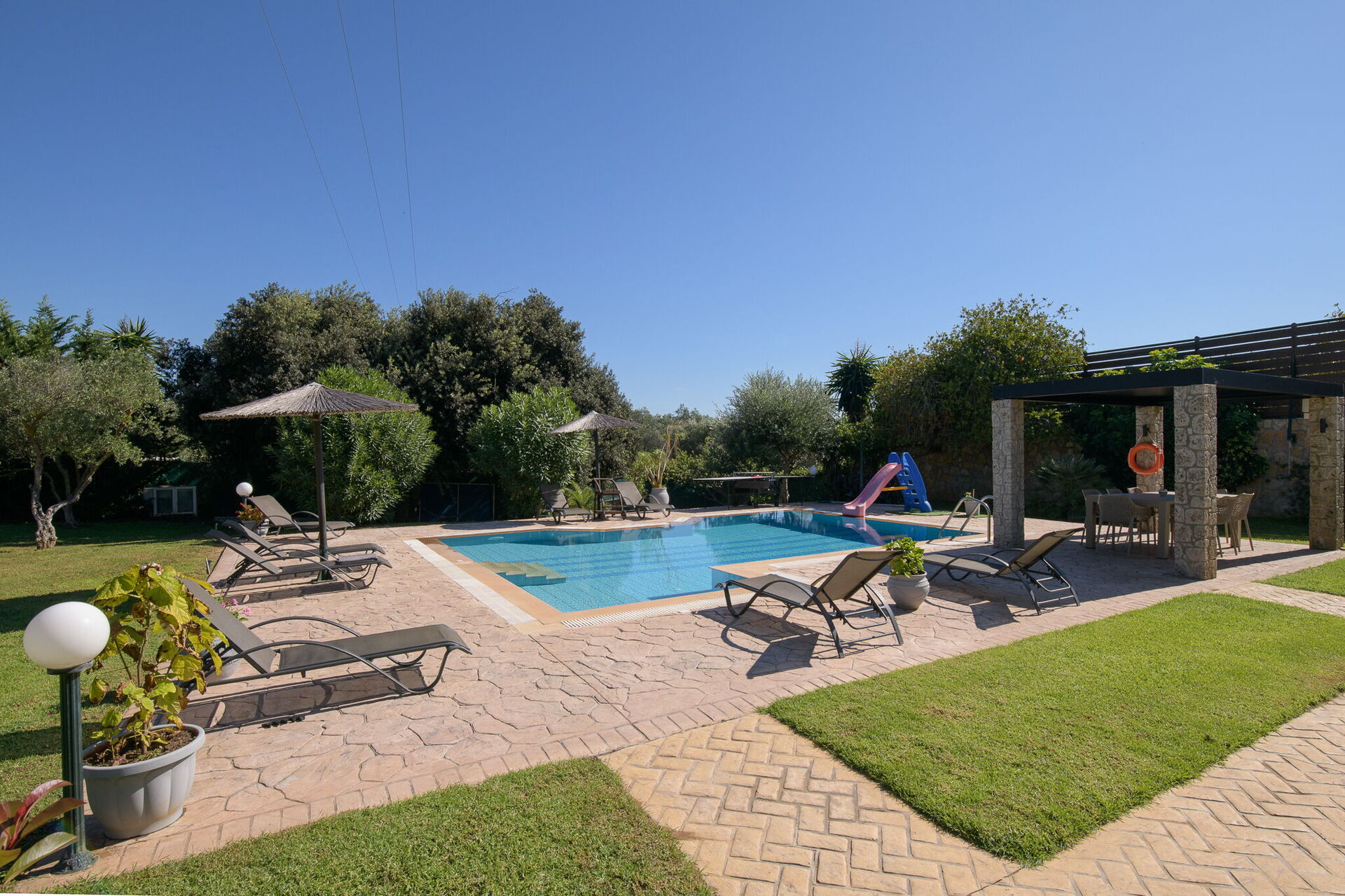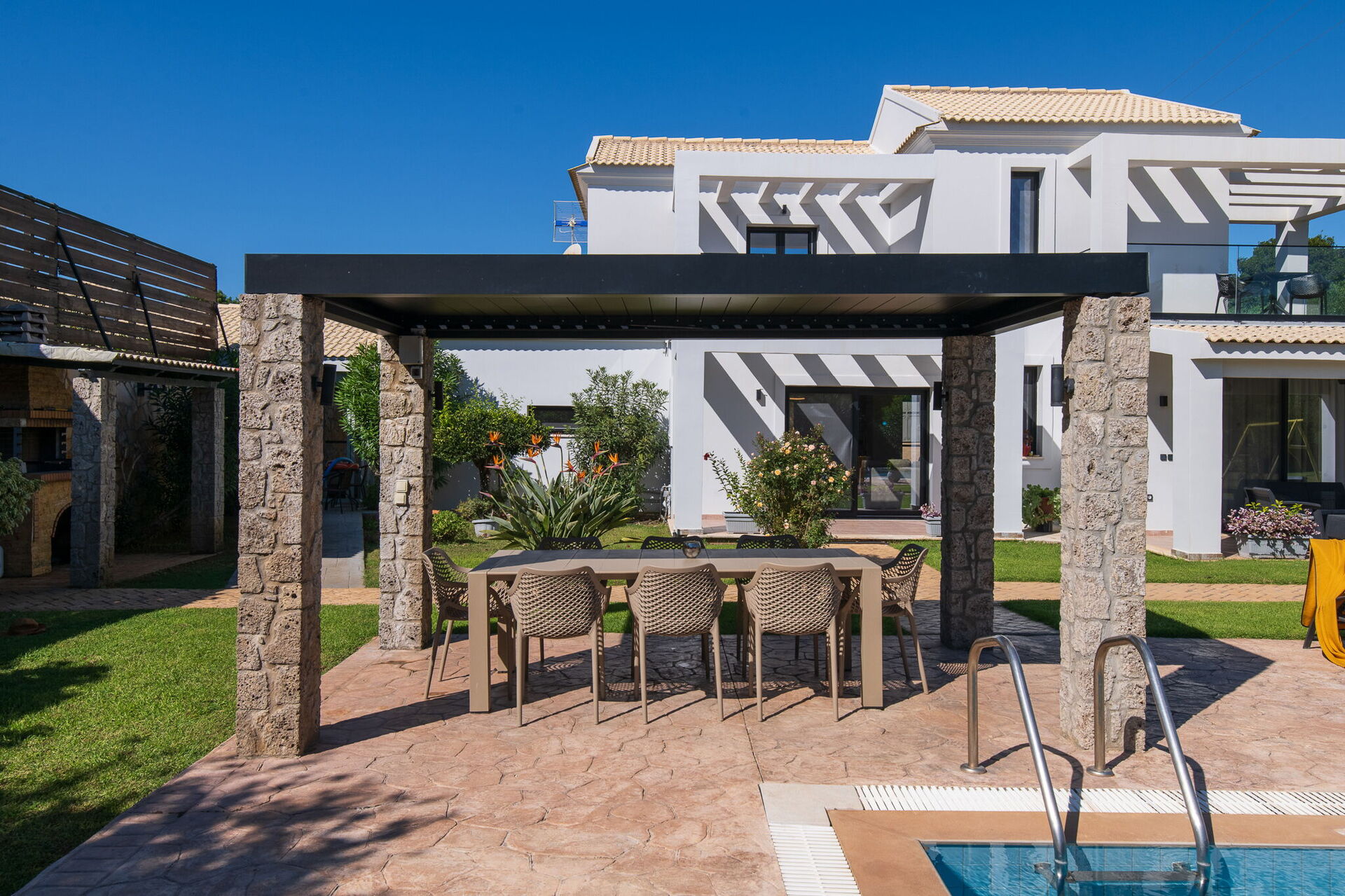 Buiten zijn er meerdere gemeenschappelijke ruimtes waar gasten samen tijd kunnen doorbrengen en onvergetelijke herinneringen kunnen creëren onder de zon van Corfu – zowel onder de pergola met eethoek als bij het grote zwembad met ligstoelen eromheen.