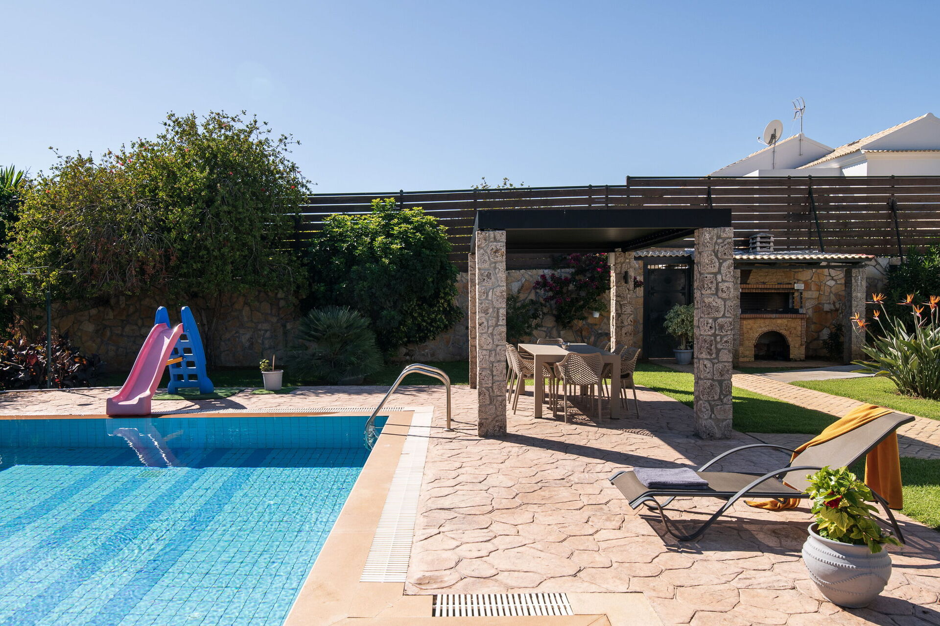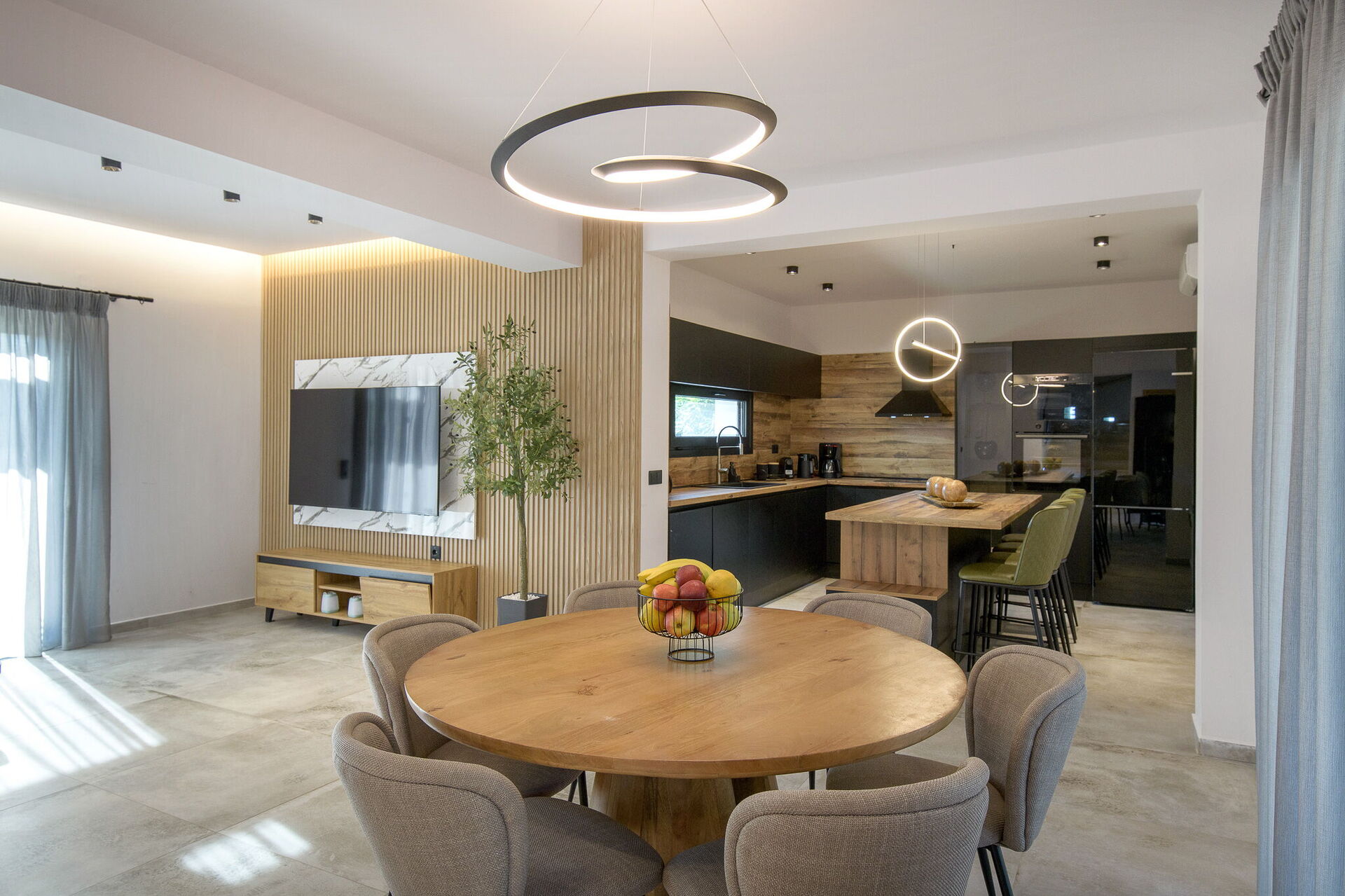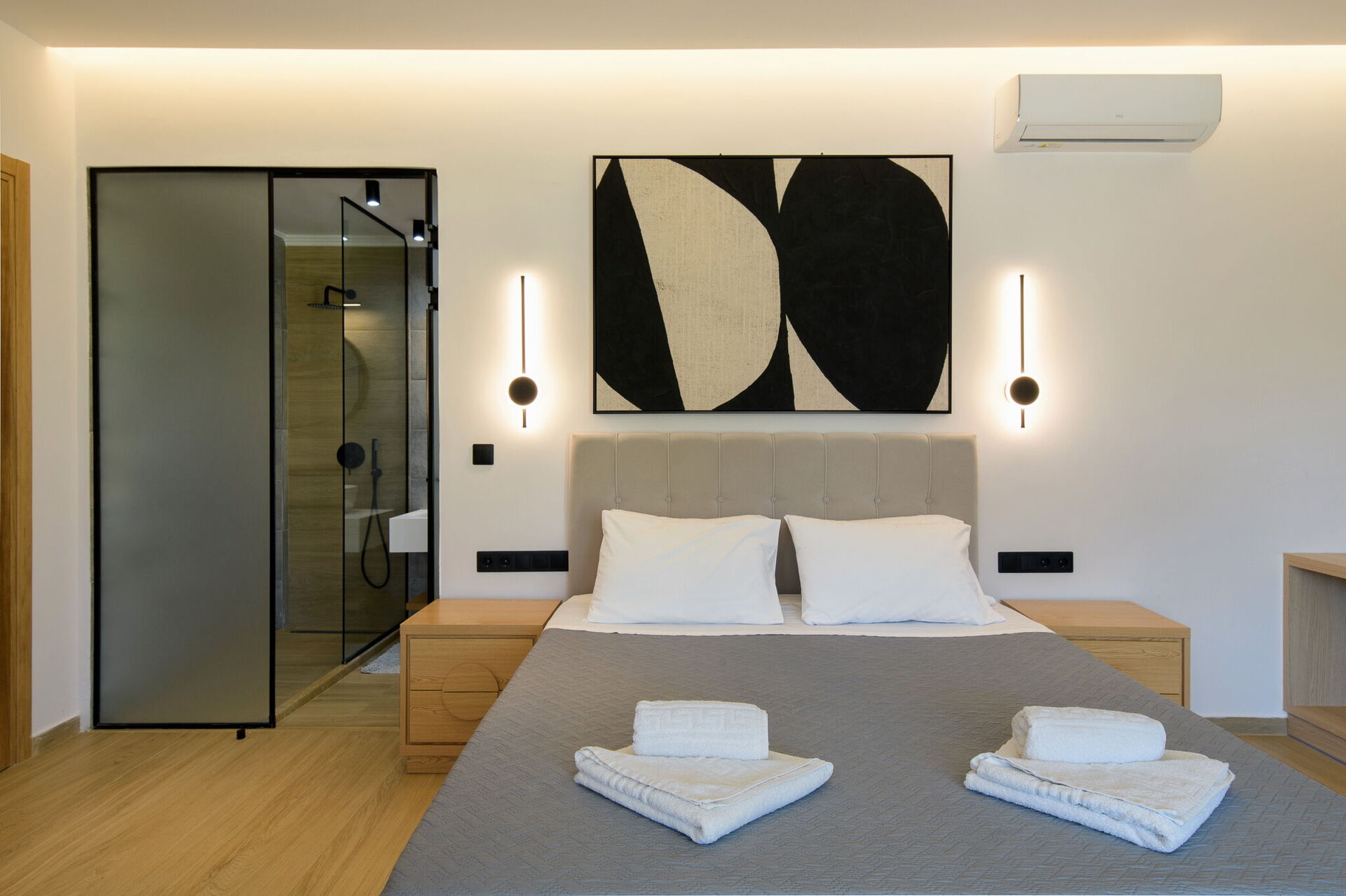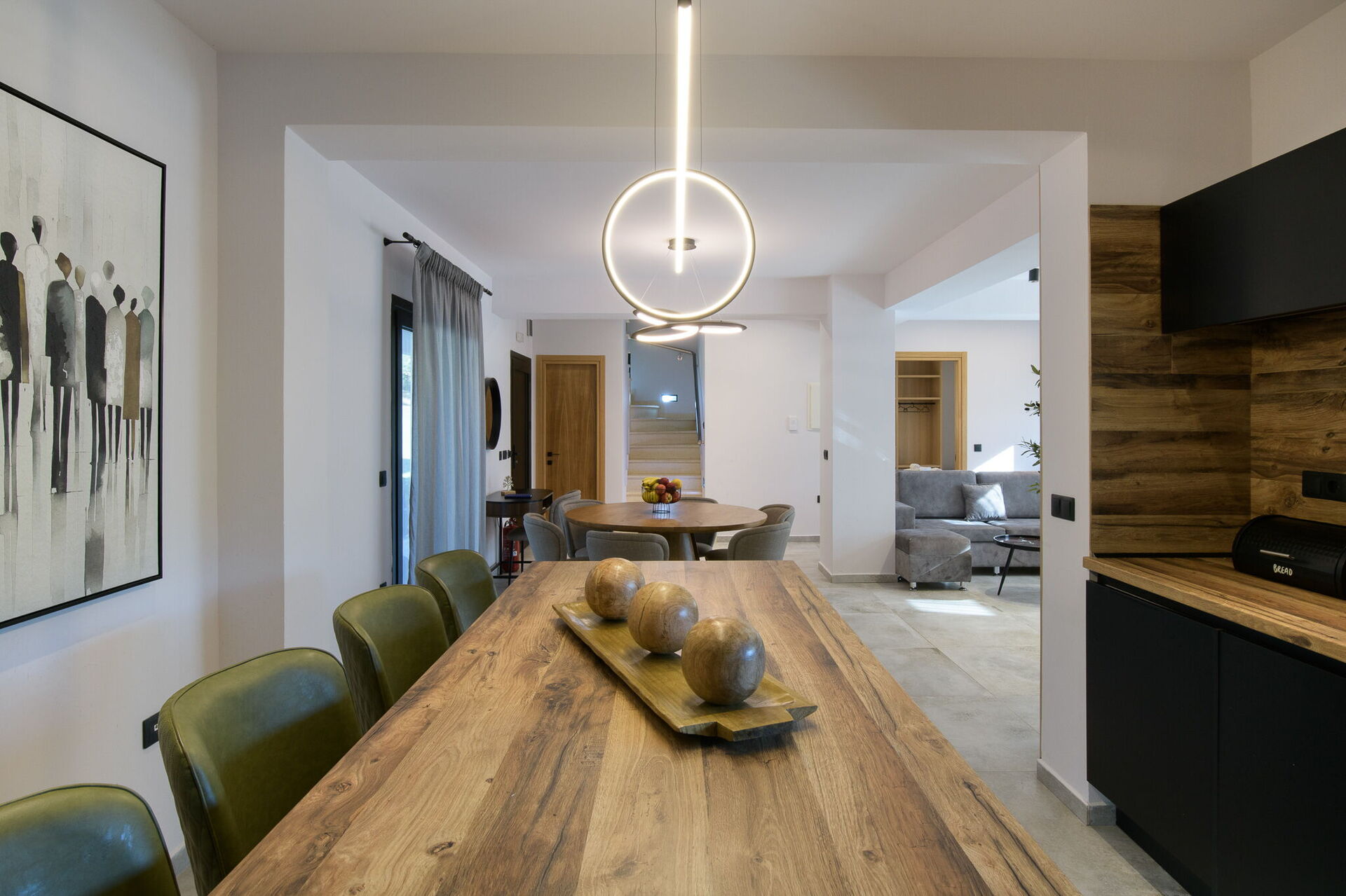 Buiten zijn er meerdere gemeenschappelijke ruimtes waar gasten samen tijd kunnen doorbrengen en onvergetelijke herinneringen kunnen creëren onder de zon van Corfu – zowel onder de pergola met eethoek als bij het grote zwembad met ligstoelen eromheen.