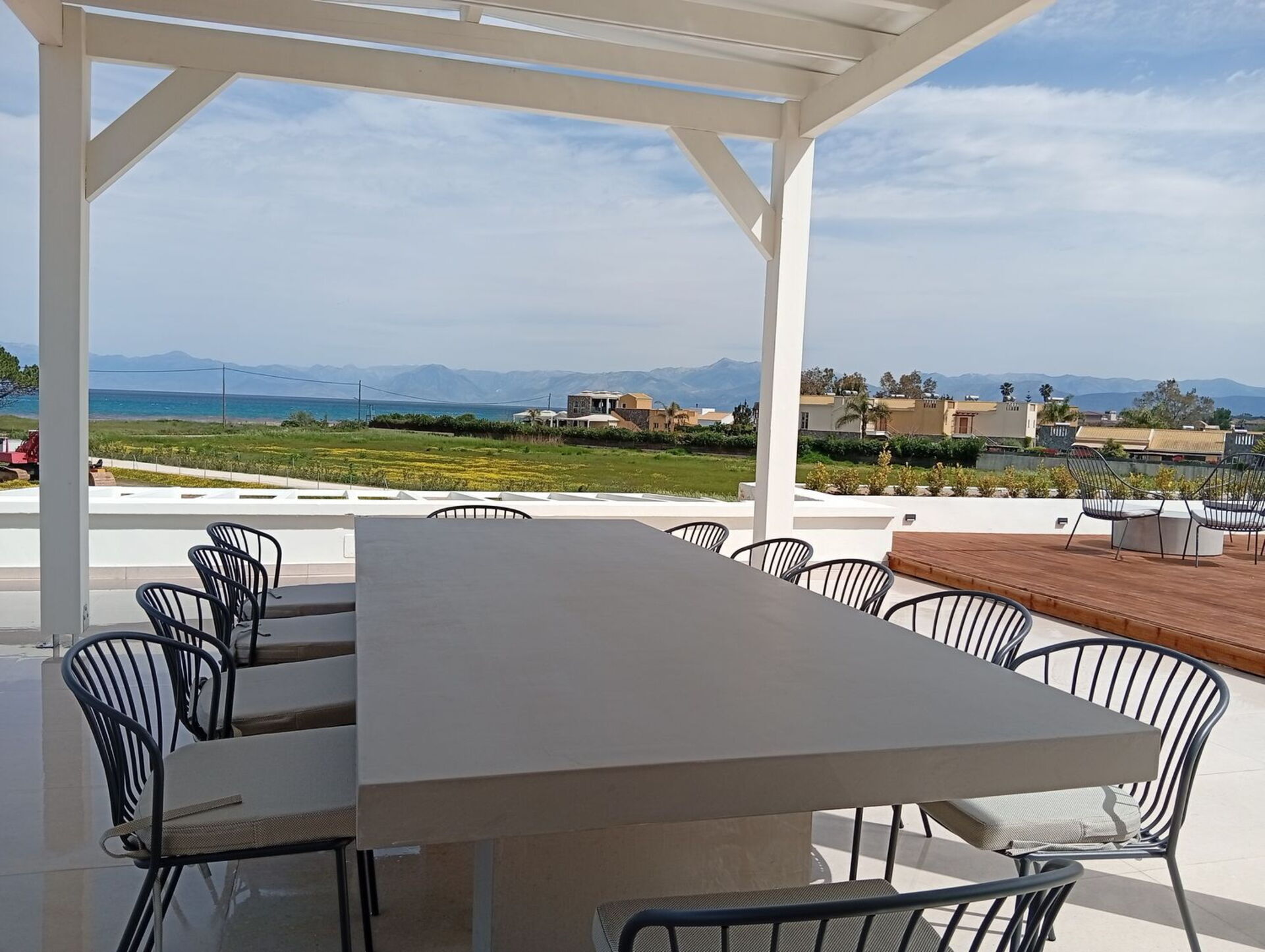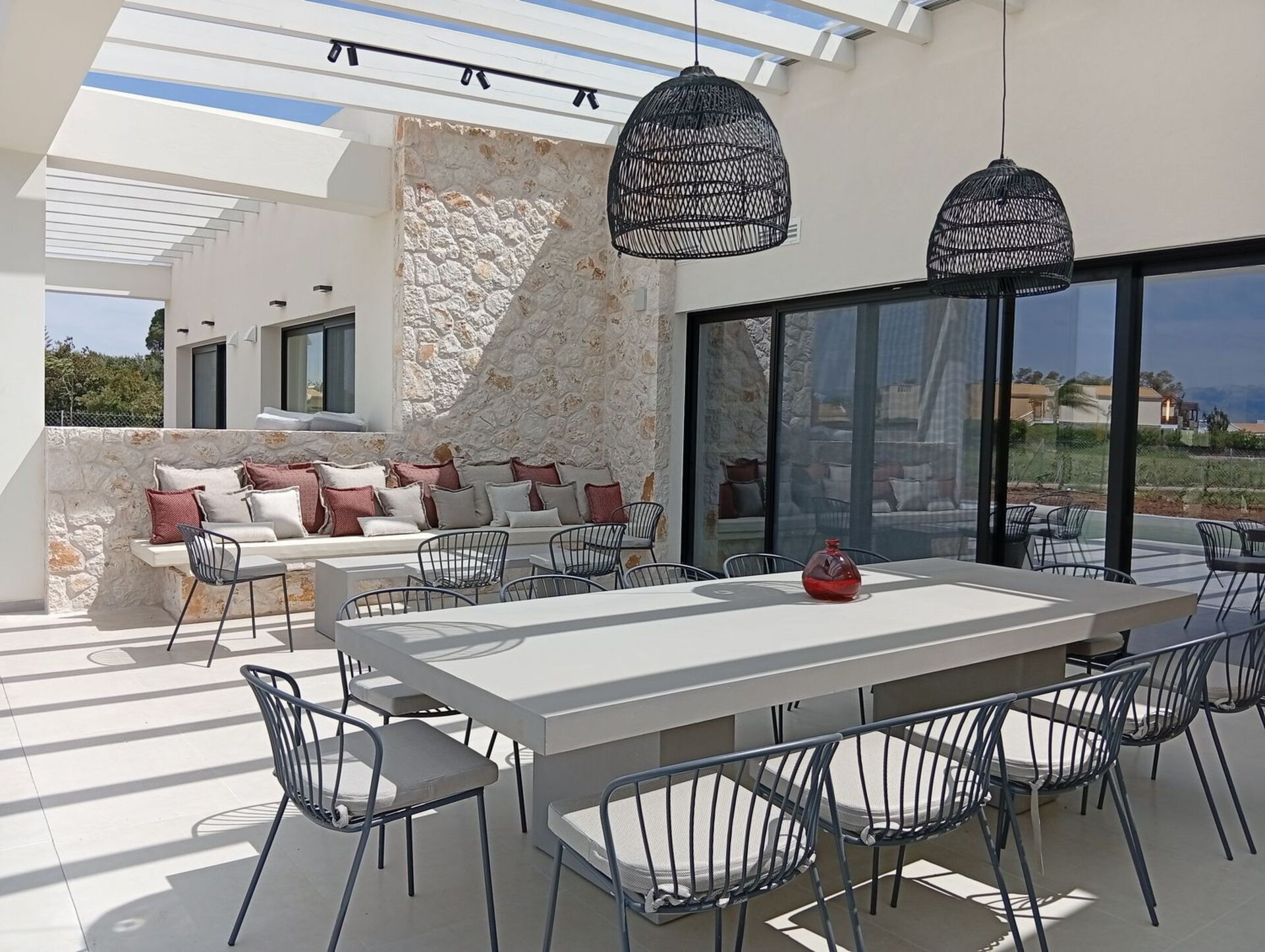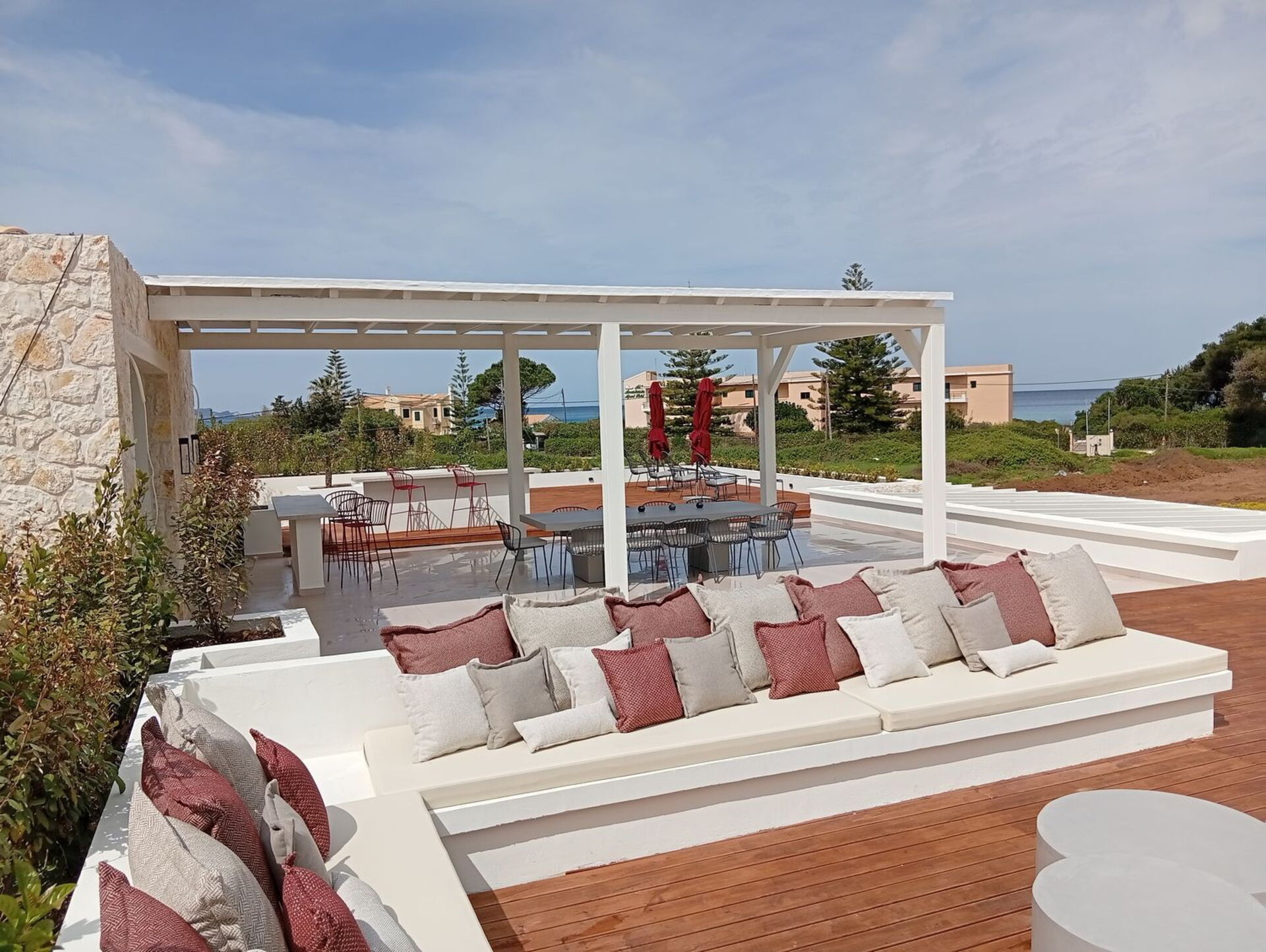 De panoramische buitenruimtes bieden talrijke gemeenschappelijke ruimtes waar gasten een aangenaam verblijf met familie of vrienden kunnen doorbrengen. Ontspan in de ruime zwembadzone of op het prachtige ingerichte dakterras met keuken en een fantastische eethoek buiten; een panoramisch uitzicht dat reikt tot aan de zee en fantastische zonsondergangen vormen het decor voor onvergetelijke momenten tijdens uw vakantie in Griekenland.