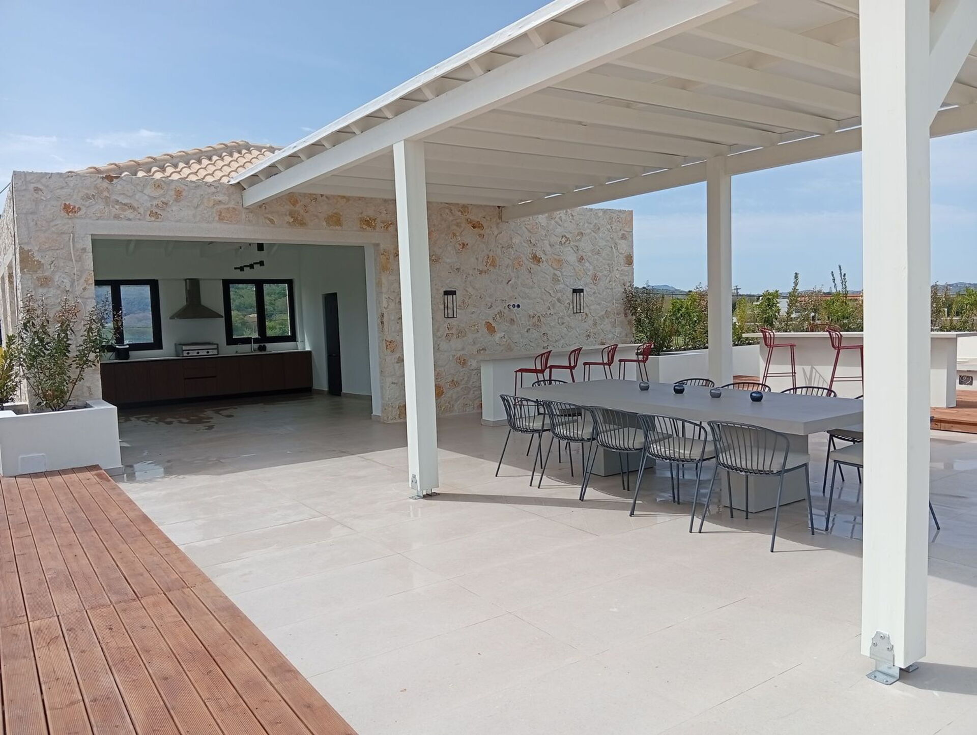 Het prachtige zwembad en het panoramische ingerichte dakterras zijn het paradepaardje van deze luxe villa op Corfu: op het grote terras op de eerste verdieping beschikt u over een exclusieve omgeving met banken, planten, een uitgeruste keuken en een groot tuinhuisje met een tafel voor uw diners onder de sterrenhemel.