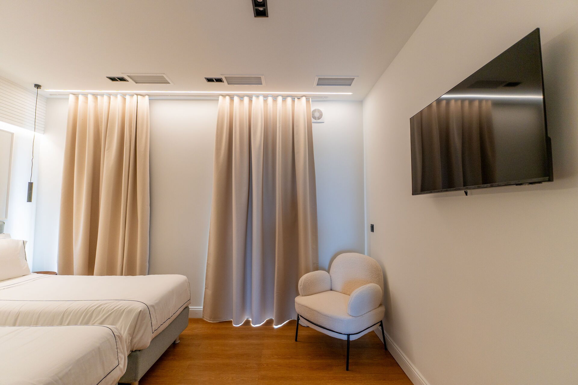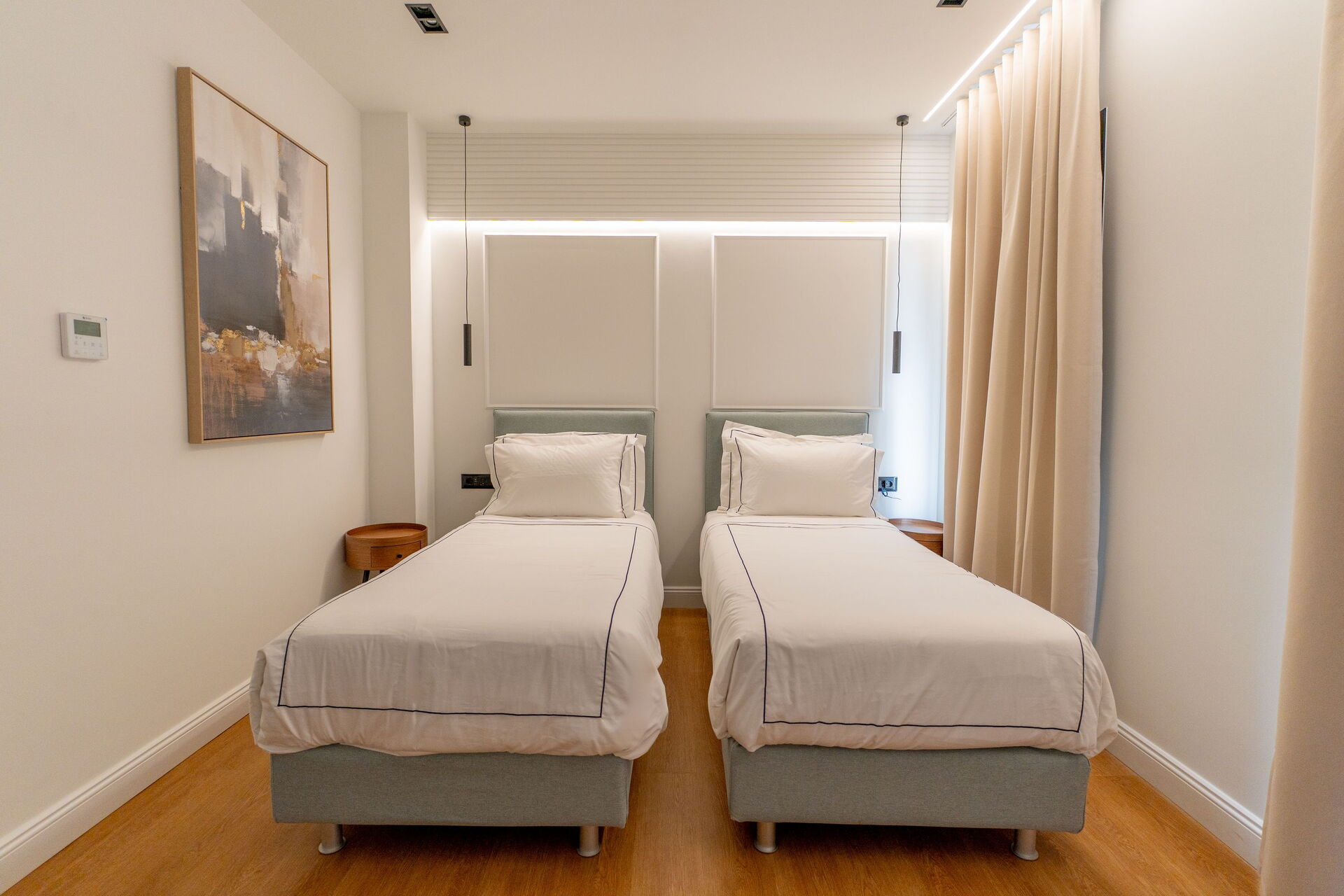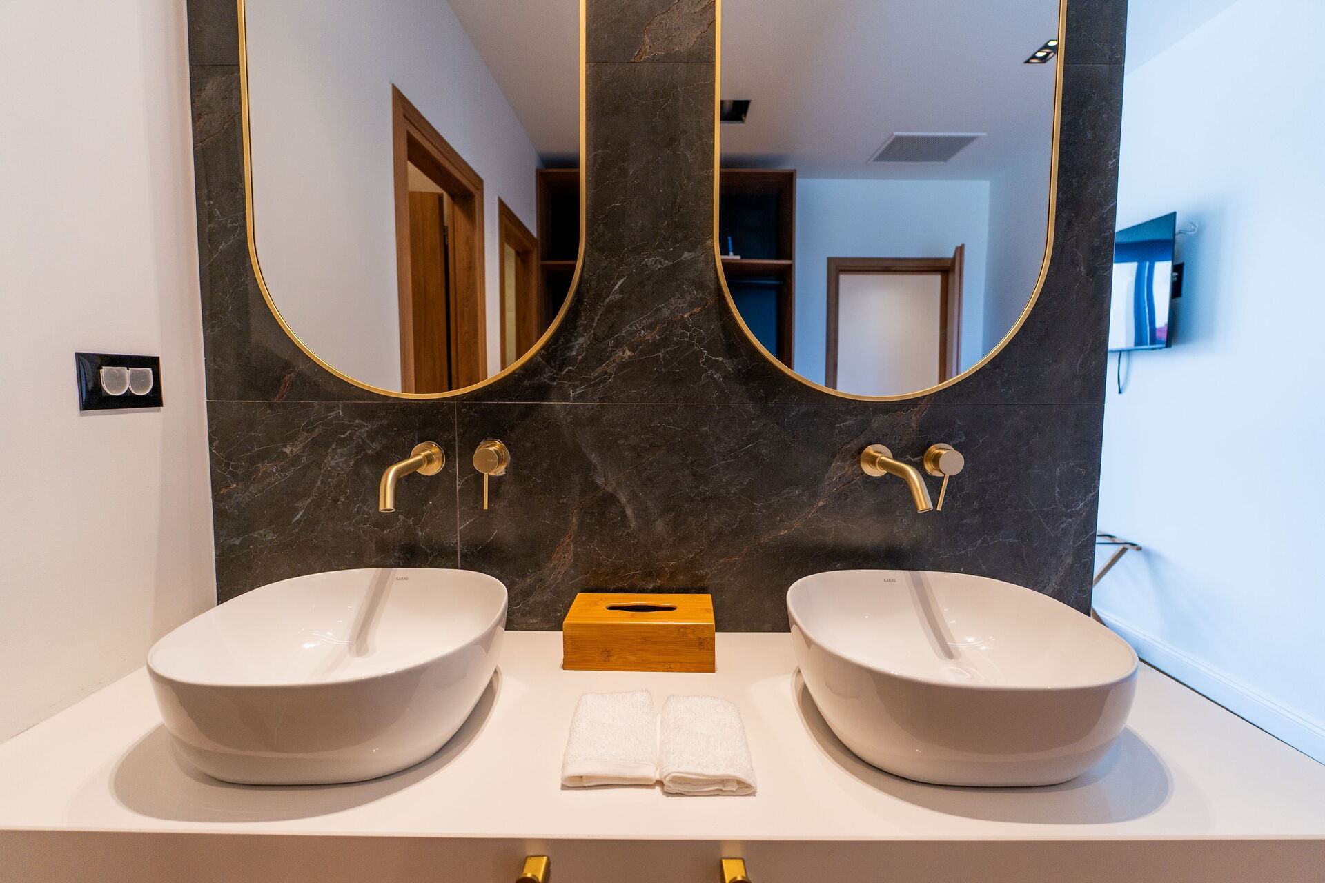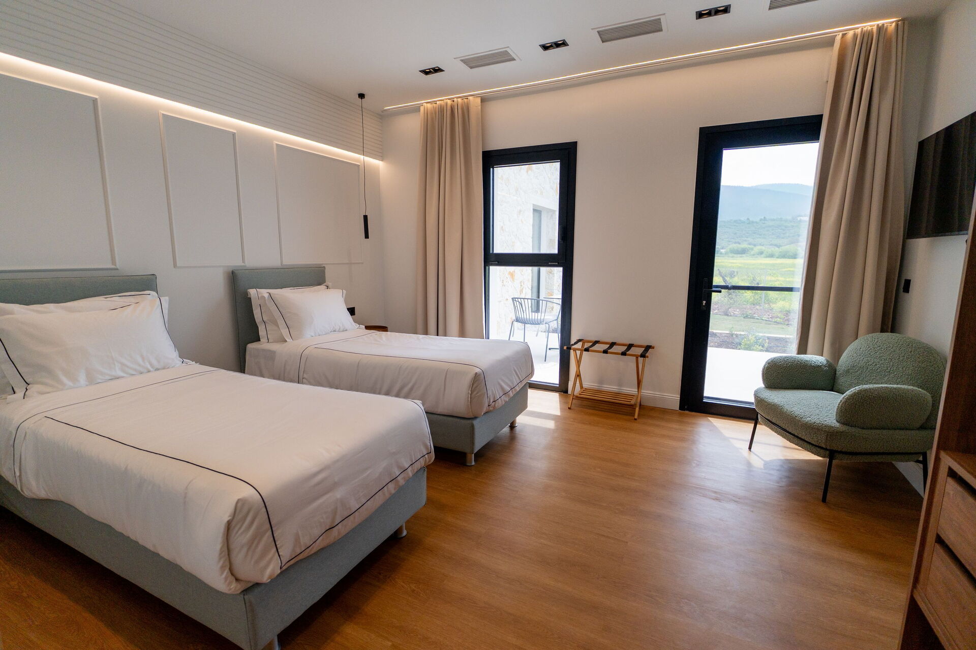 - 7 tweepersoonskamers, elk met een eigen badkamer met douche