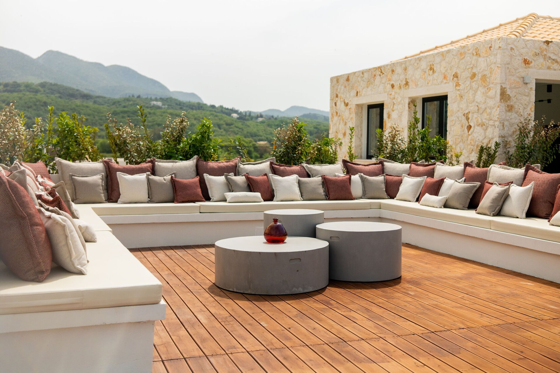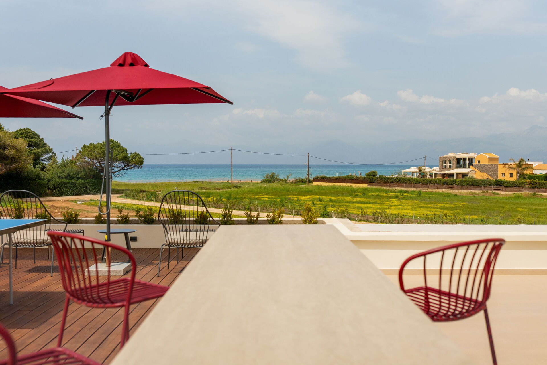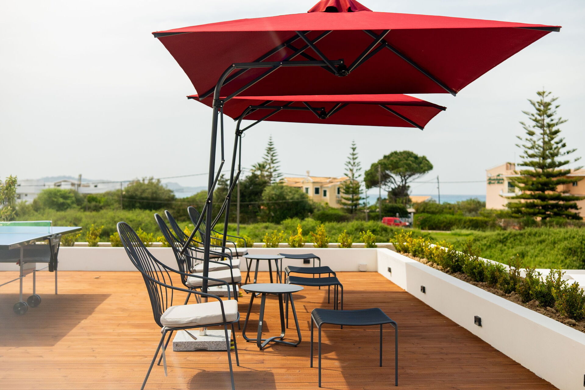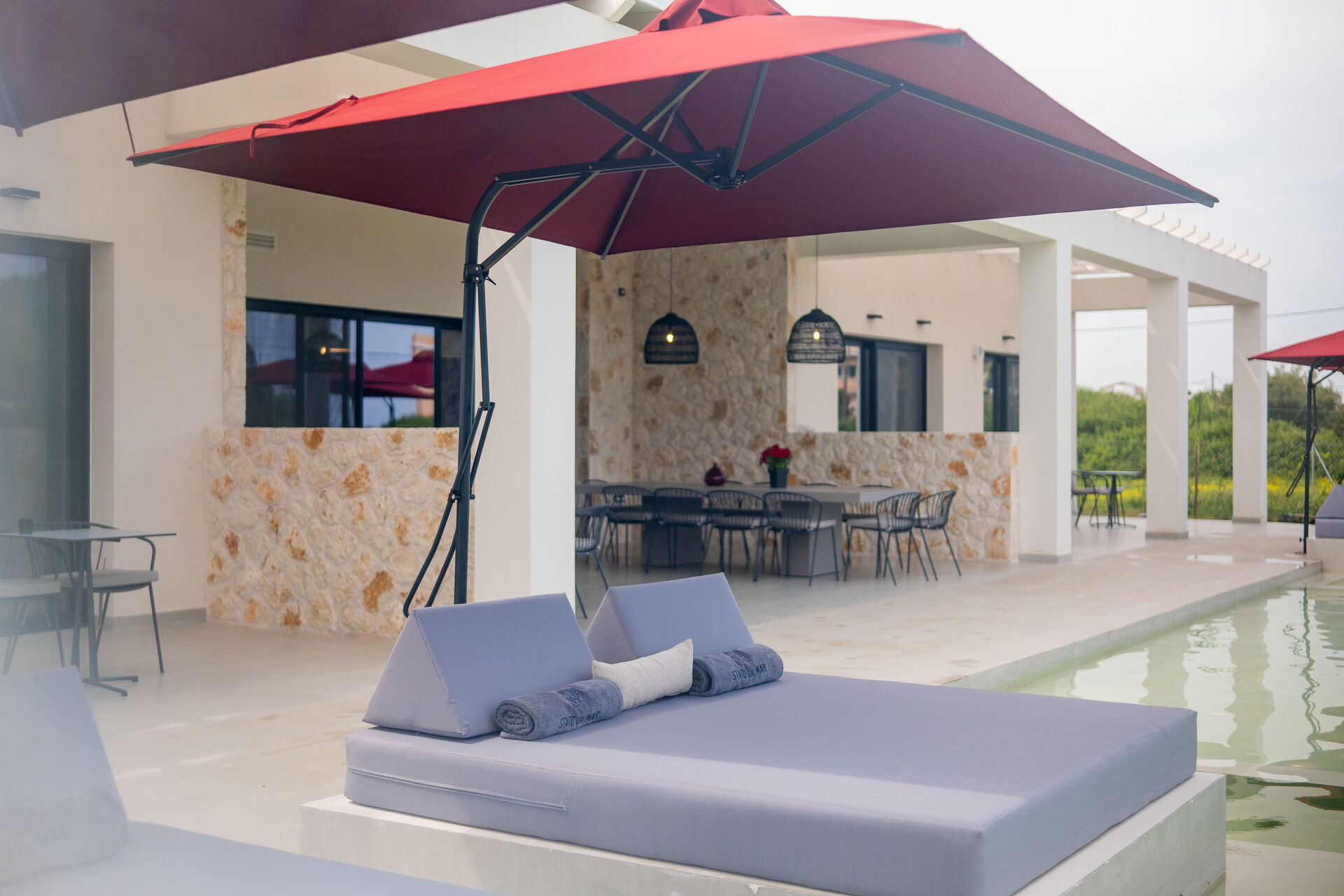 Buiten zijn er meerdere gemeenschappelijke ruimtes waar gasten kunnen genieten van een aangenaam verblijf met familie of vrienden, ofwel ontspannen bij het grote zwembad of op het prachtige dakterras met keuken en een ruime buiten eetplaats. Vanaf hier heb je een panoramisch uitzicht op zee met spectaculaire zonsondergangen, die zorgen voor onvergetelijke momenten tijdens je vakantie in Griekenland.