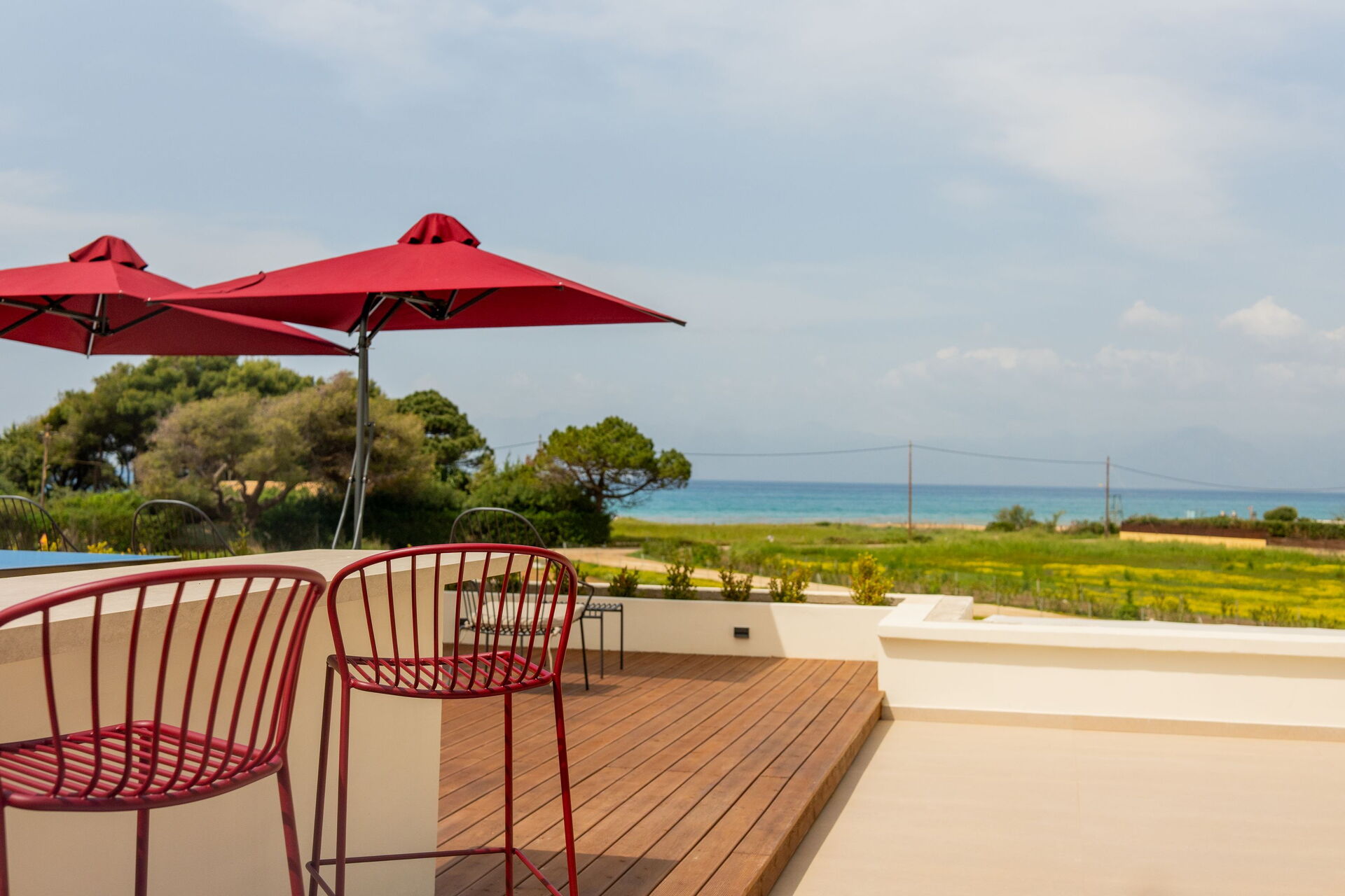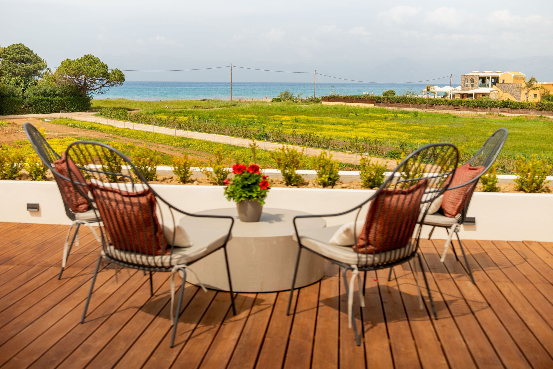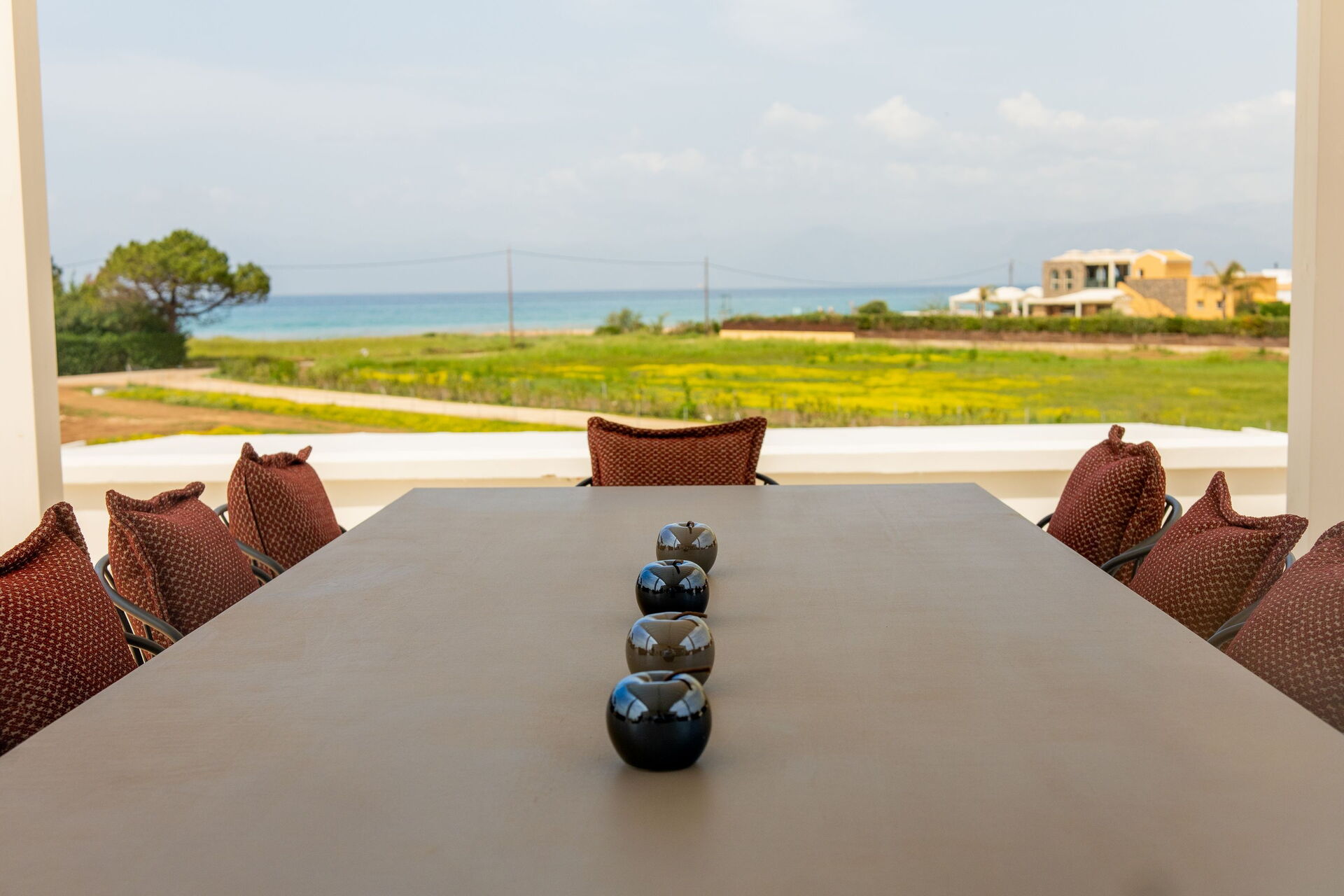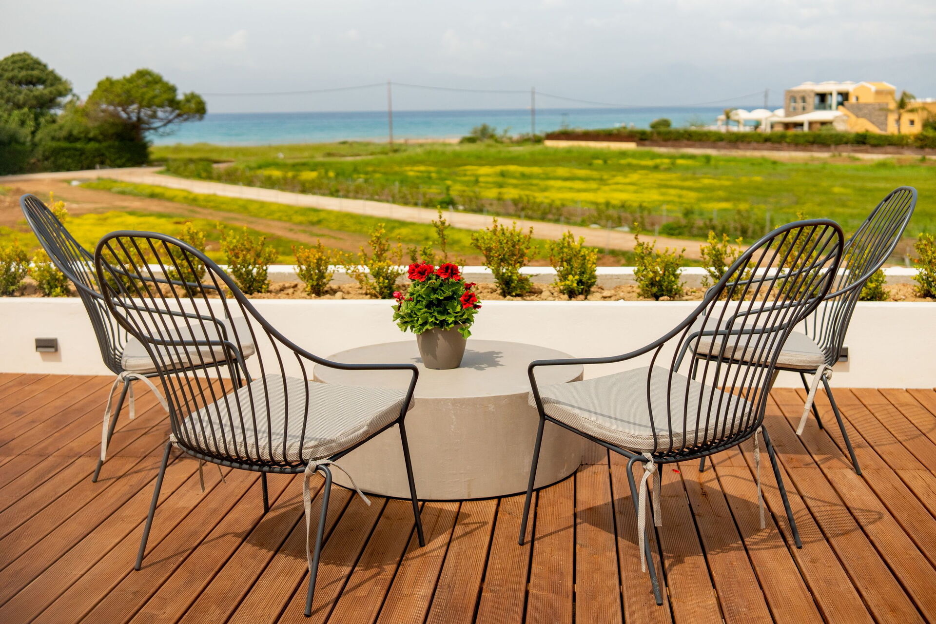 Buiten zijn er meerdere gemeenschappelijke ruimtes waar gasten kunnen genieten van een aangenaam verblijf met familie of vrienden, ofwel ontspannen bij het grote zwembad of op het prachtige dakterras met keuken en een ruime buiten eetplaats. Vanaf hier heb je een panoramisch uitzicht op zee met spectaculaire zonsondergangen, die zorgen voor onvergetelijke momenten tijdens je vakantie in Griekenland.
