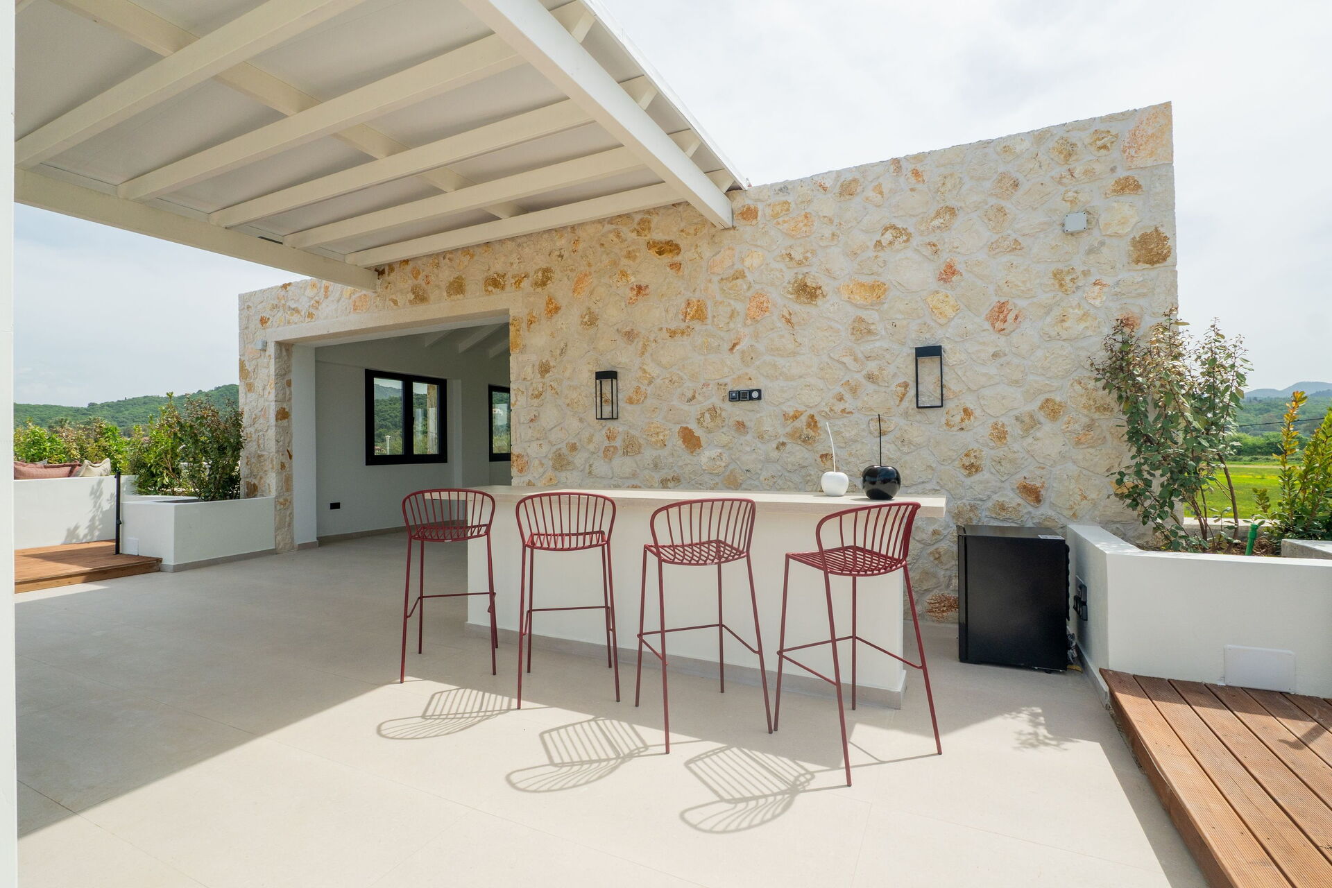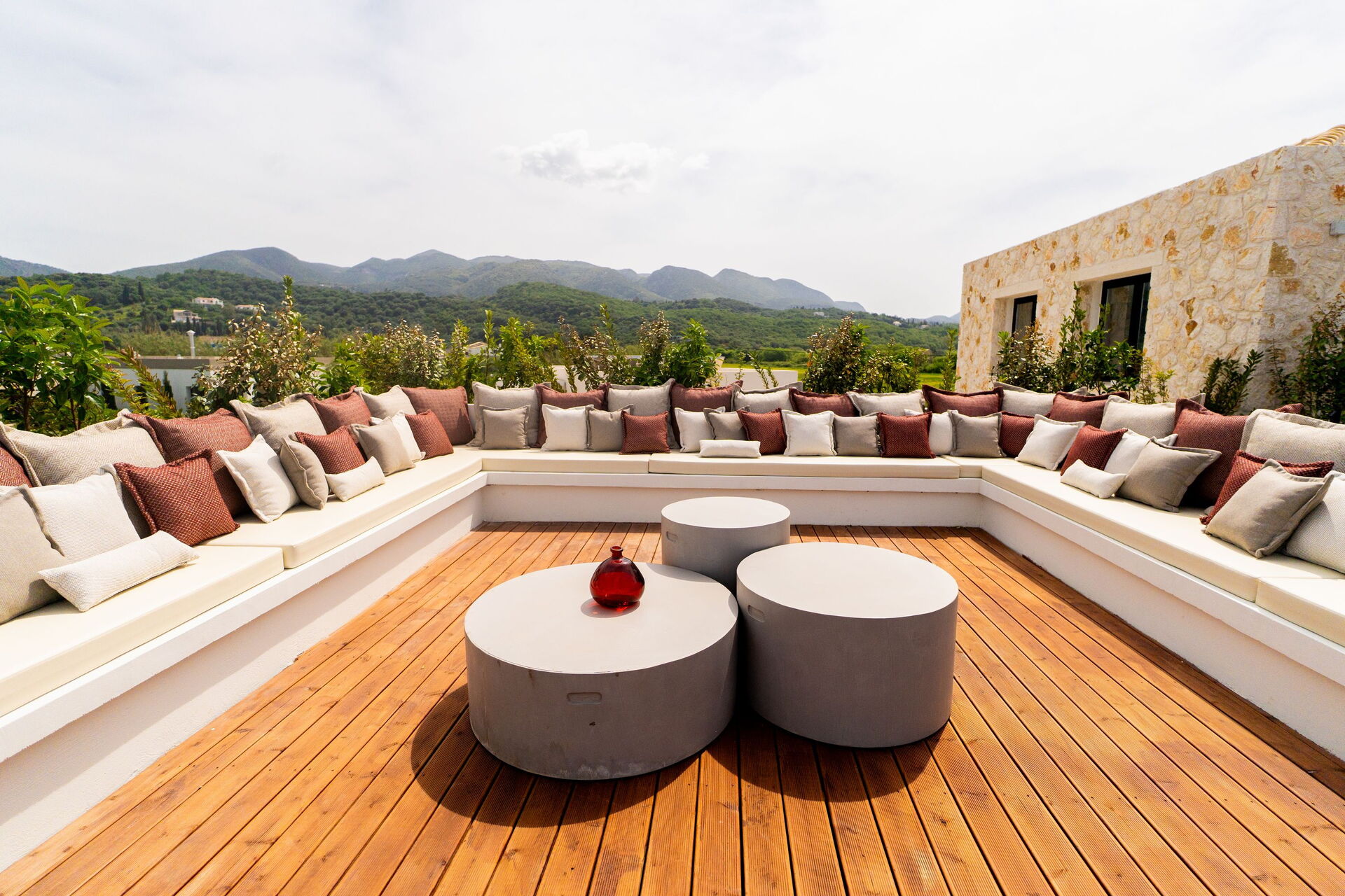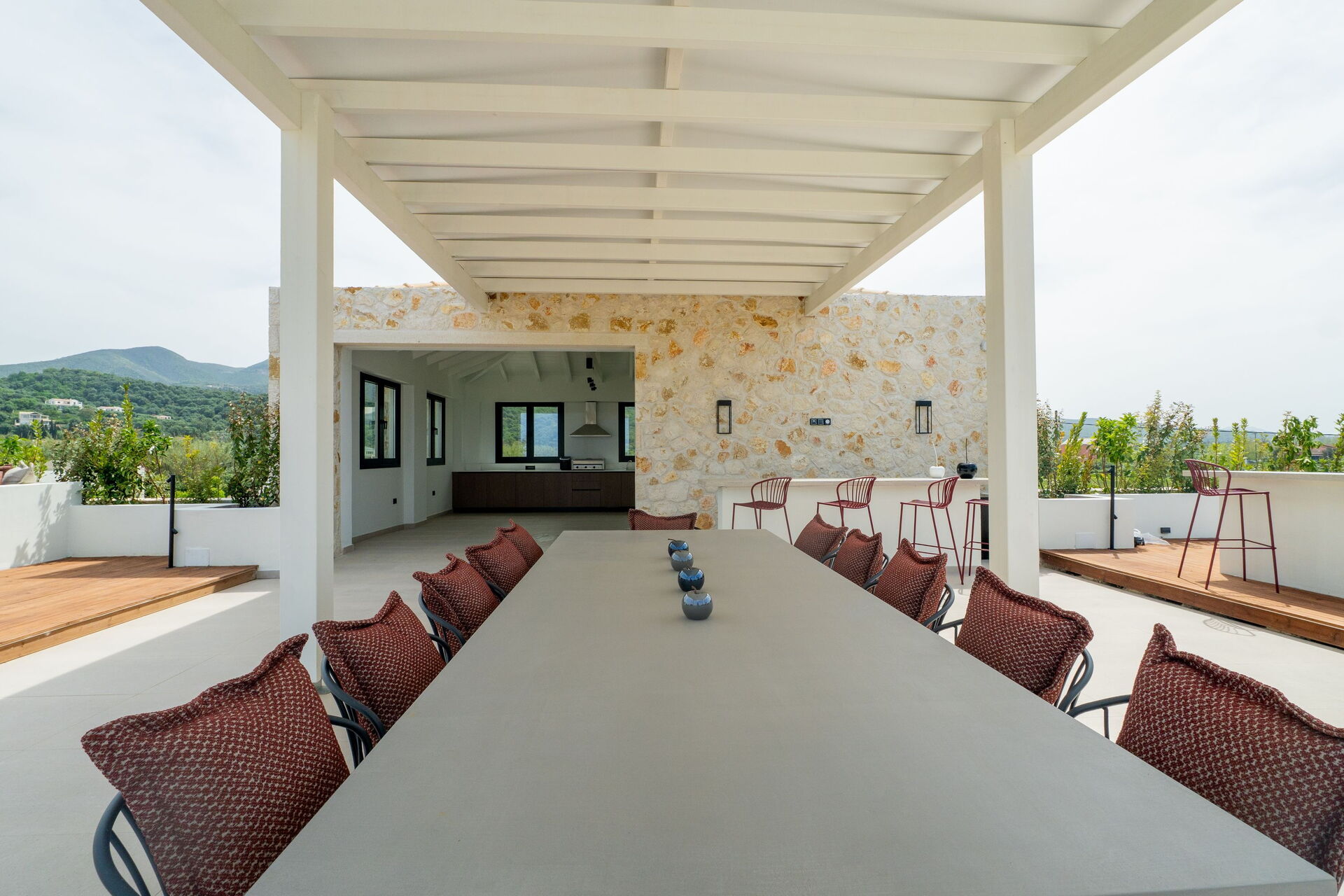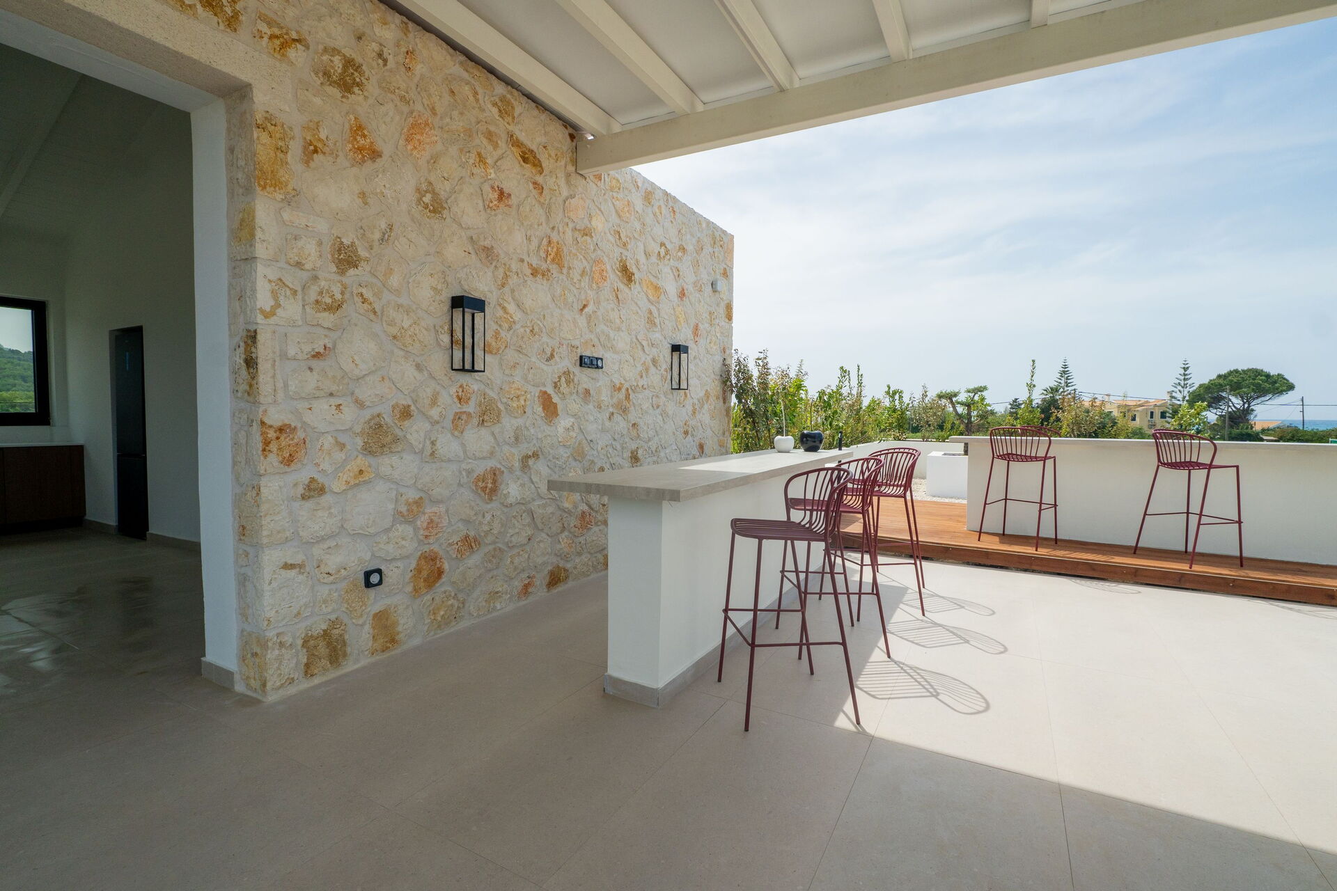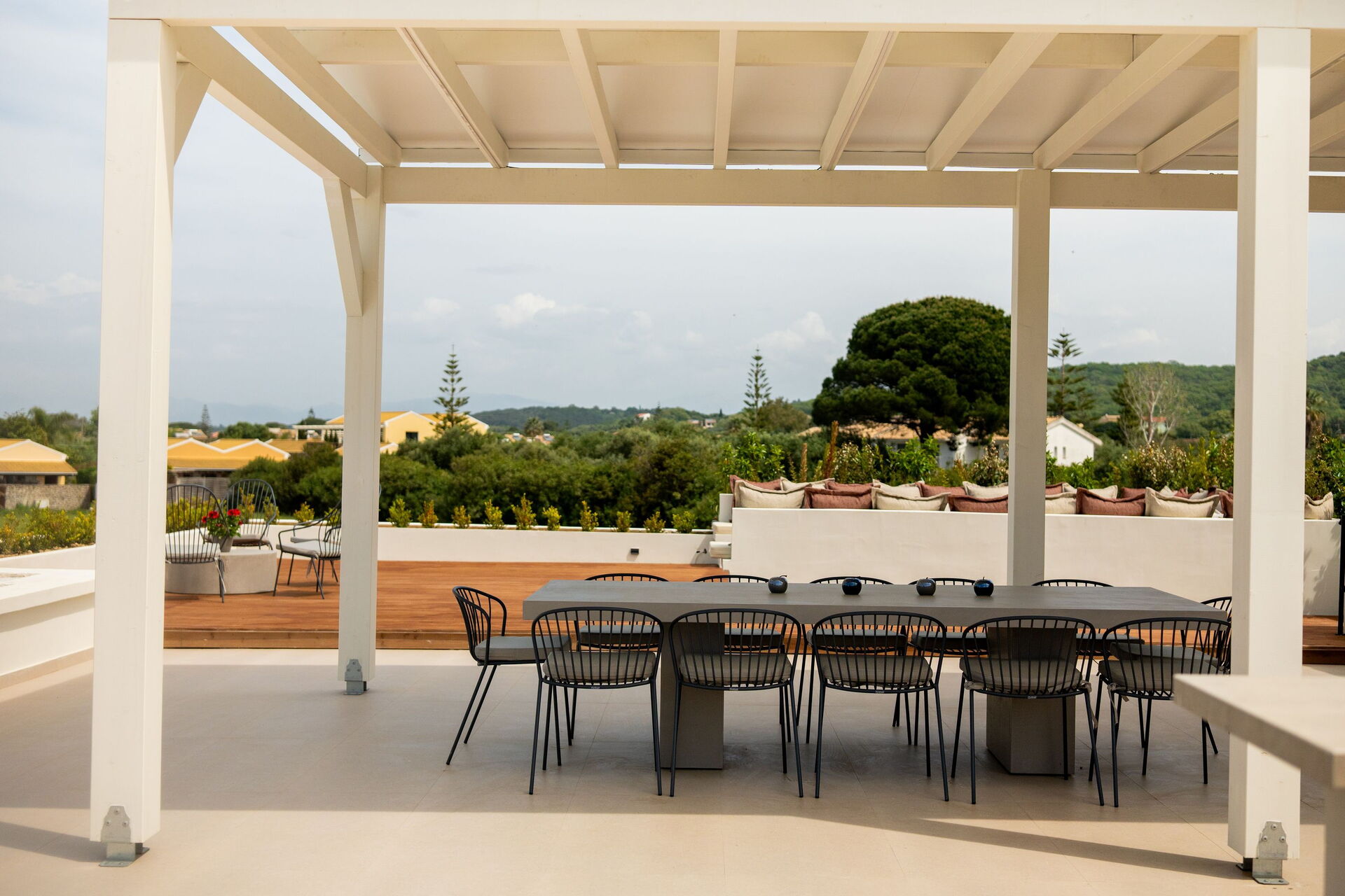 Het prachtige zwembad en het volledig uitgeruste dakterras met panoramisch uitzicht zijn de absolute hoogtepunten van deze luxe villa op Korfoe: op het grote terras op de bovenverdieping vind je een exclusieve setting met banken, planten, een uitgeruste keuken en een grote pergola met tafel voor diners onder de sterren.
