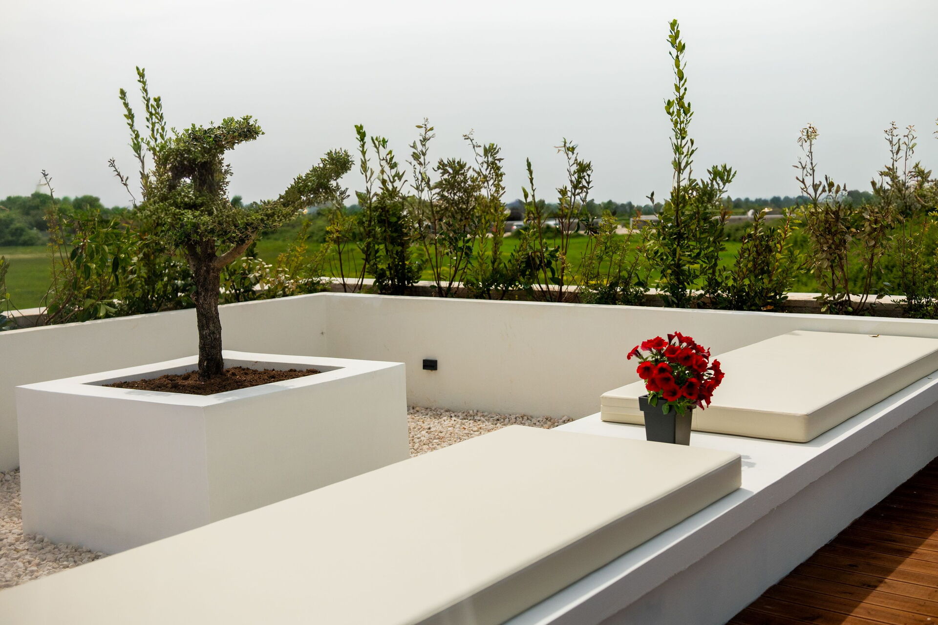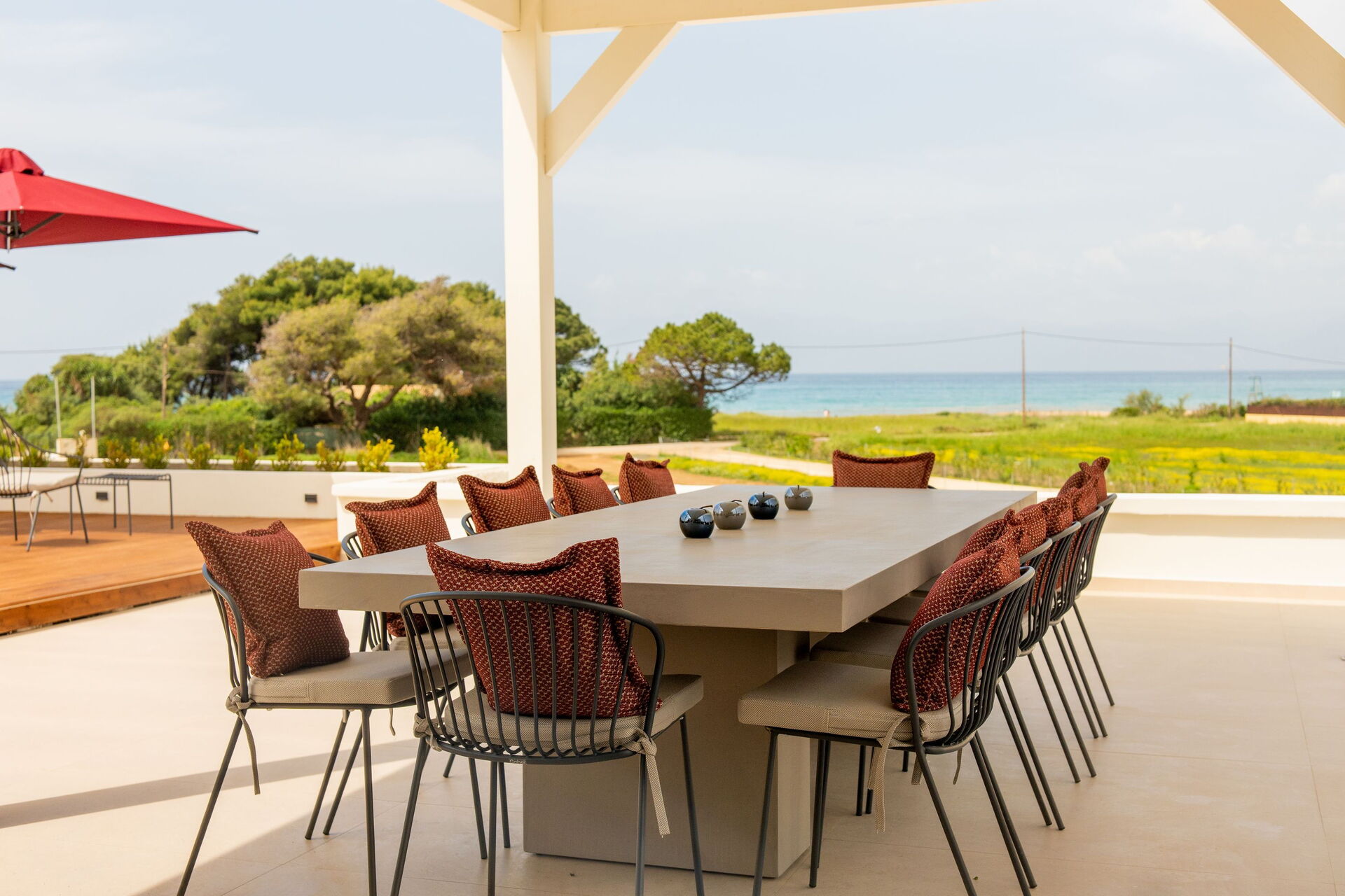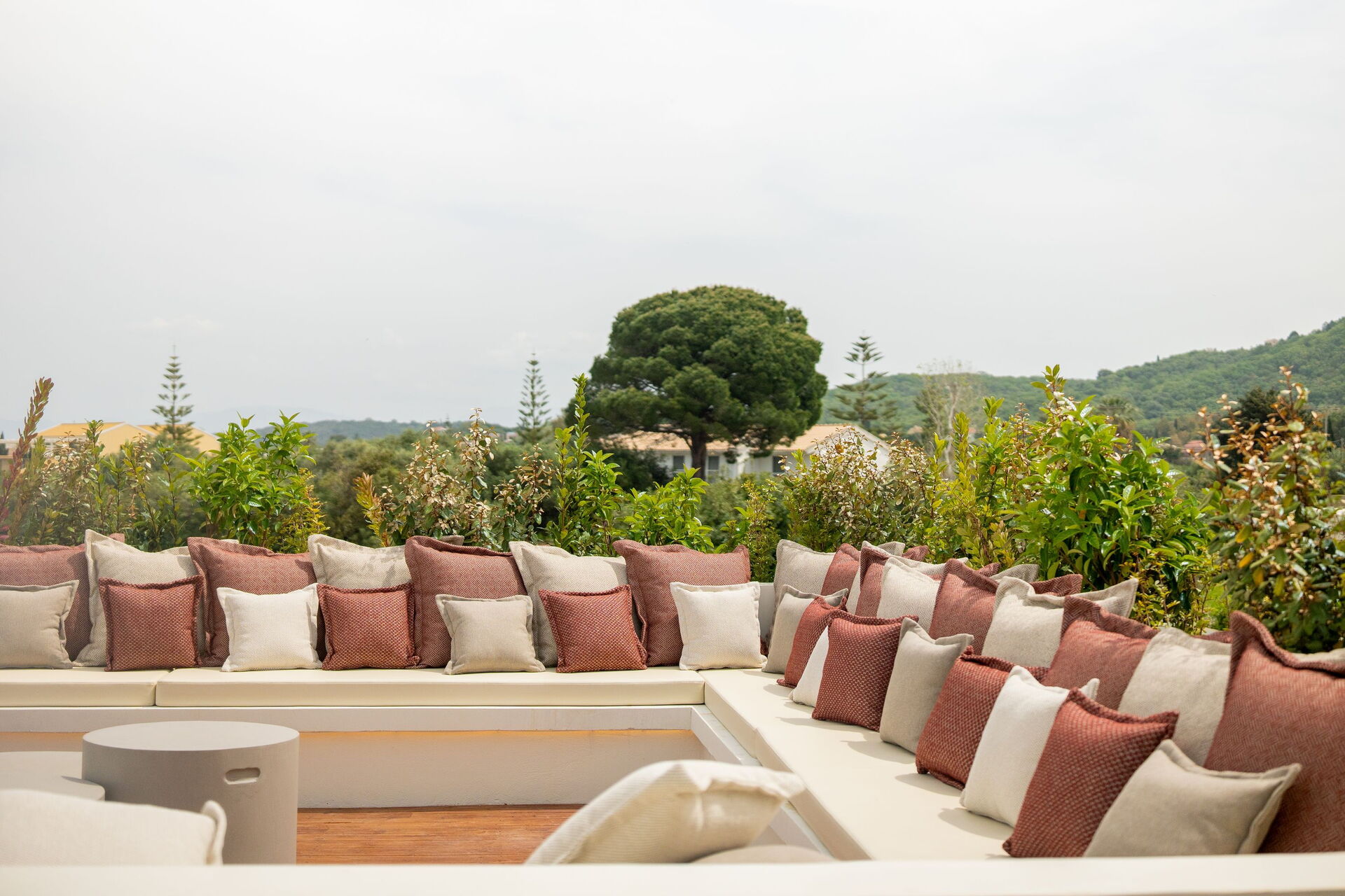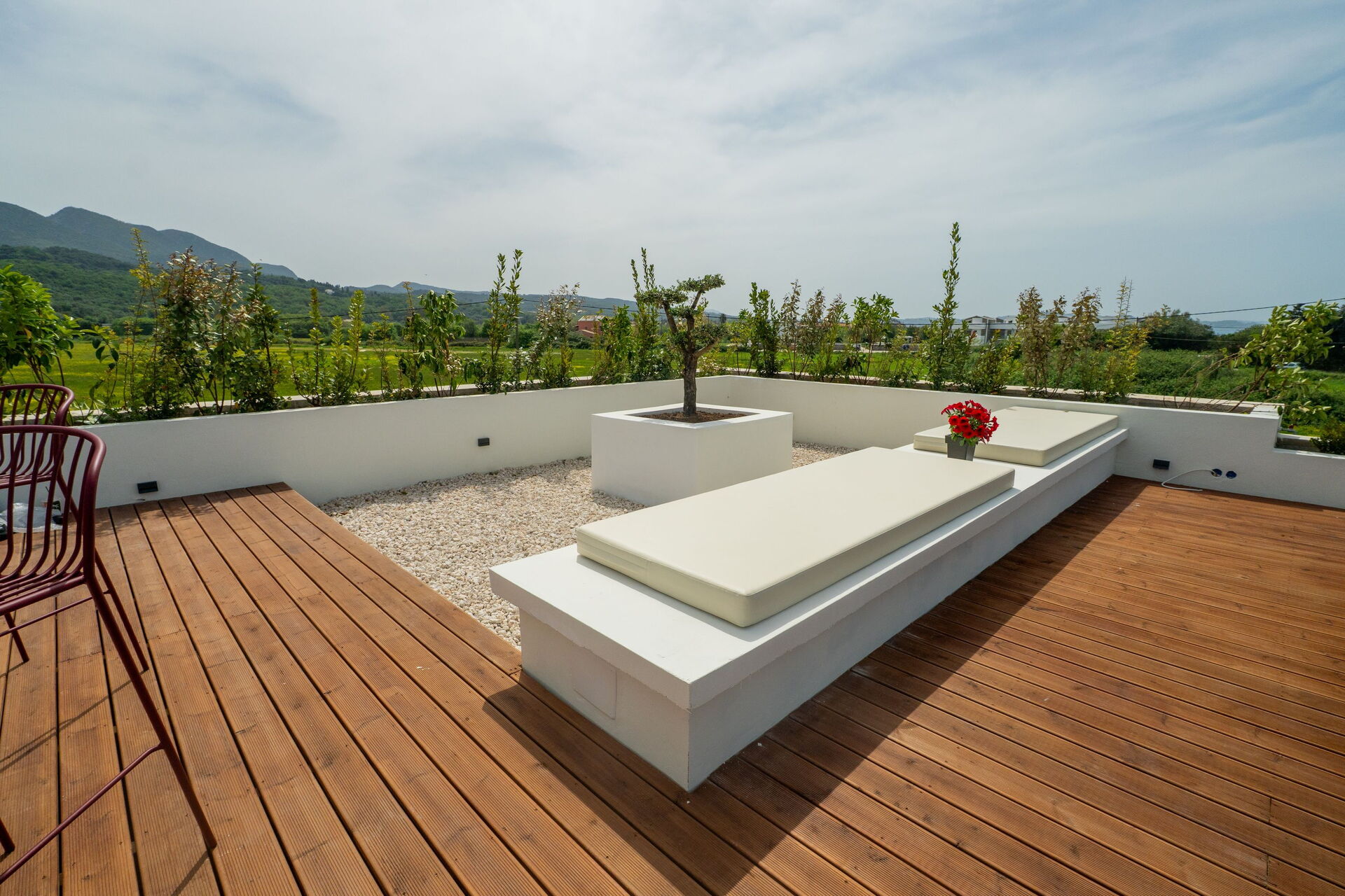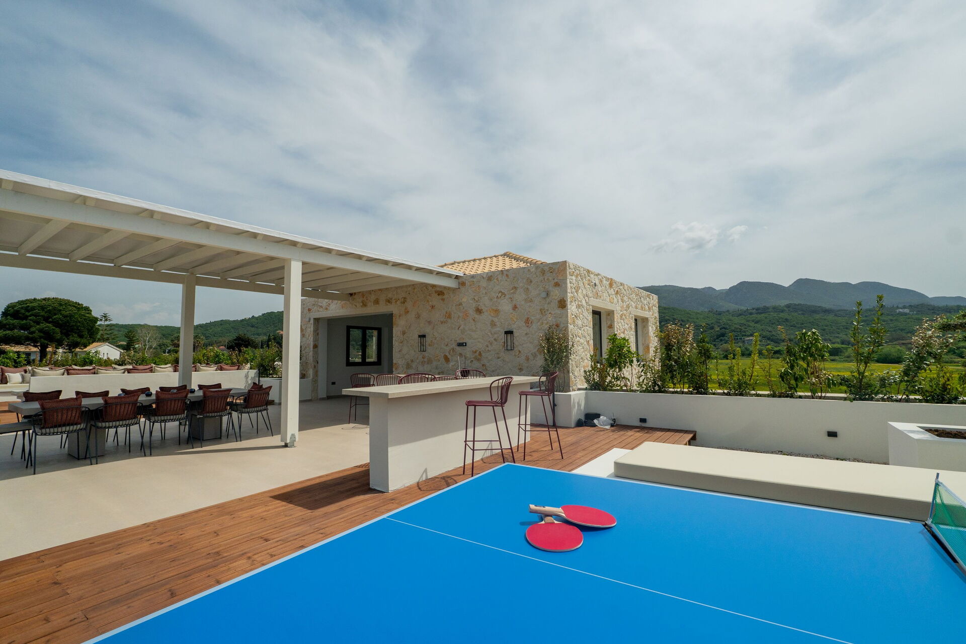 Het prachtige zwembad en het volledig uitgeruste dakterras met panoramisch uitzicht zijn de absolute hoogtepunten van deze luxe villa op Korfoe: op het grote terras op de bovenverdieping vind je een exclusieve setting met banken, planten, een uitgeruste keuken en een grote pergola met tafel voor diners onder de sterren.