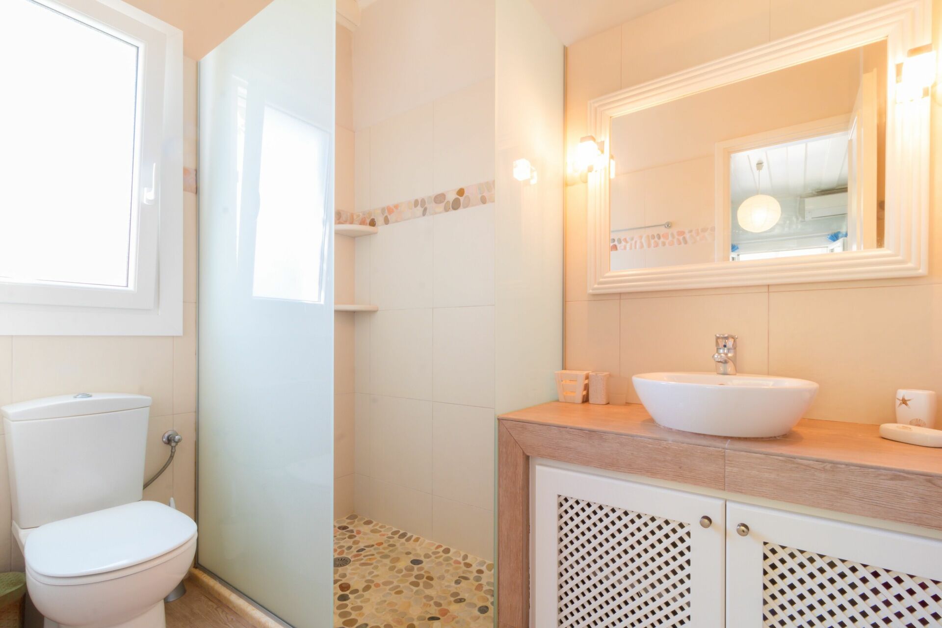 Begane grond: ruime woonkamer met keuken (vaatwasser, magnetron, oven, kookplaat), eetkamer en woonkamer, hoofdslaapkamer met ensuite badkamer met douche en directe toegang tot de patio, twee slaapkamers met twee eenpersoonsbedden die verbonden zijn met de patio, badkamer met douche, badkamer met douche en een wasmachine.