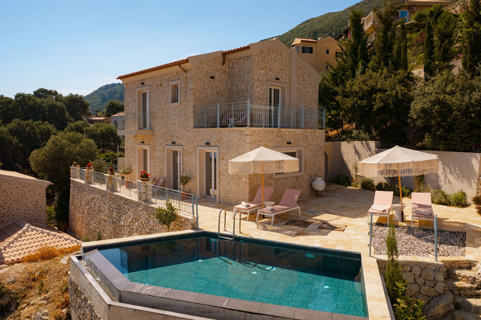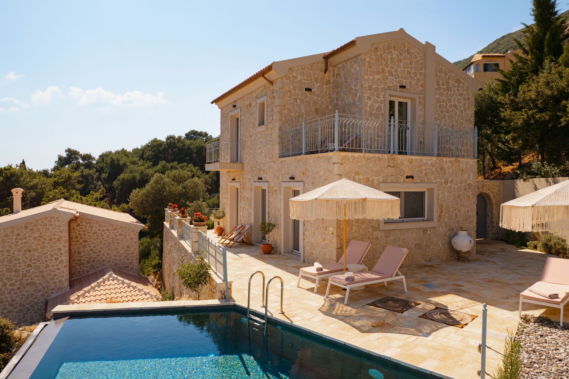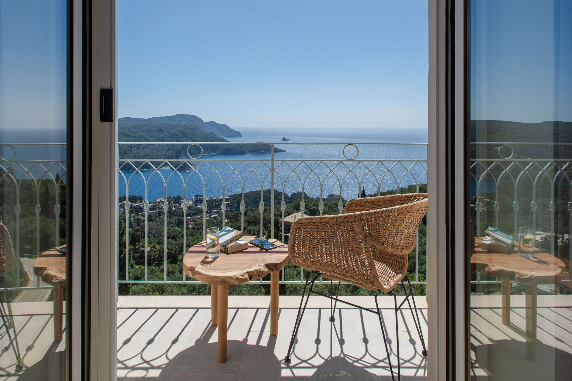 Een buitenruimte met prachtig uitzicht biedt een prachtig privézwembad en een zonneterras waar u kunt genieten van de zonnige Corfu-dagen.