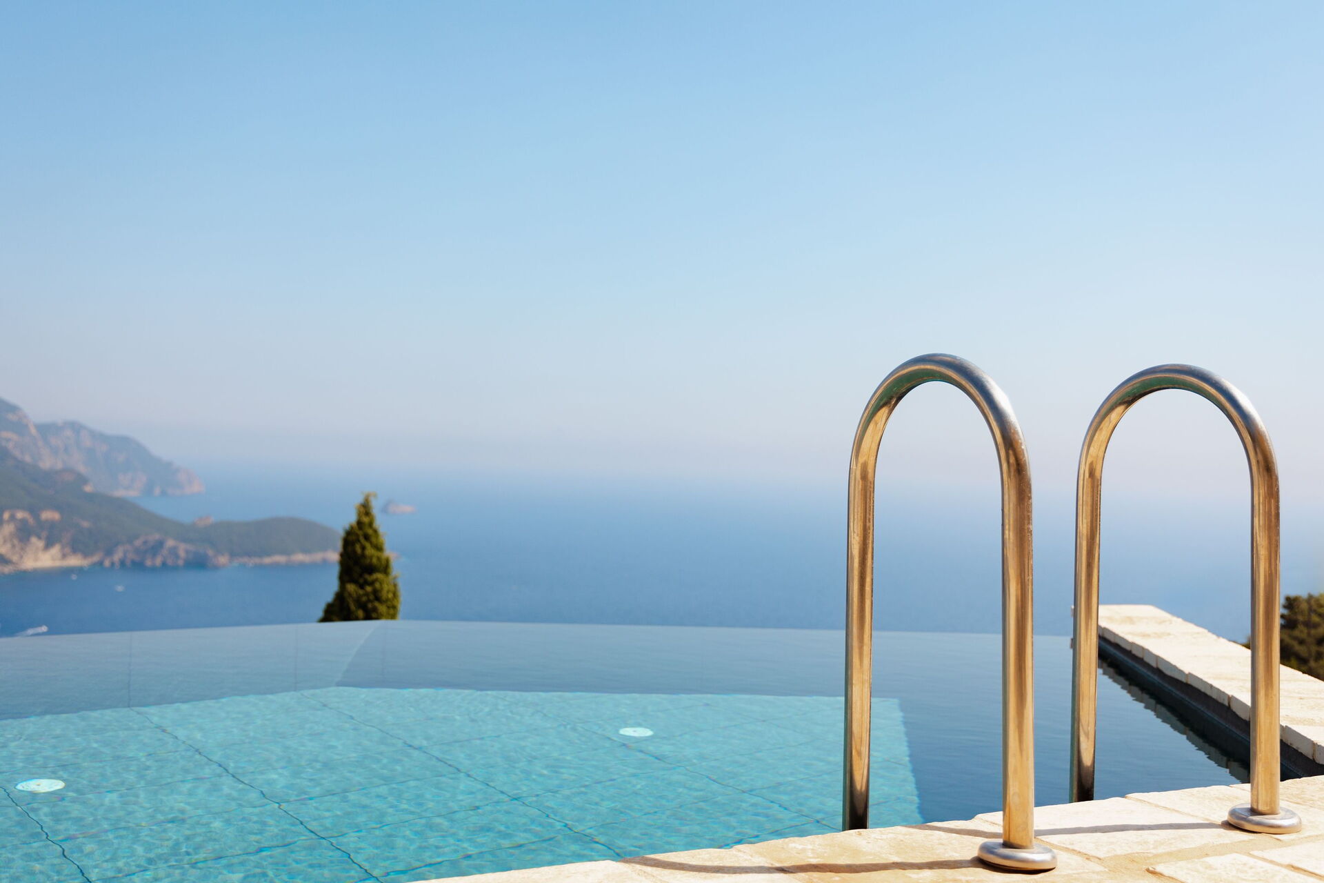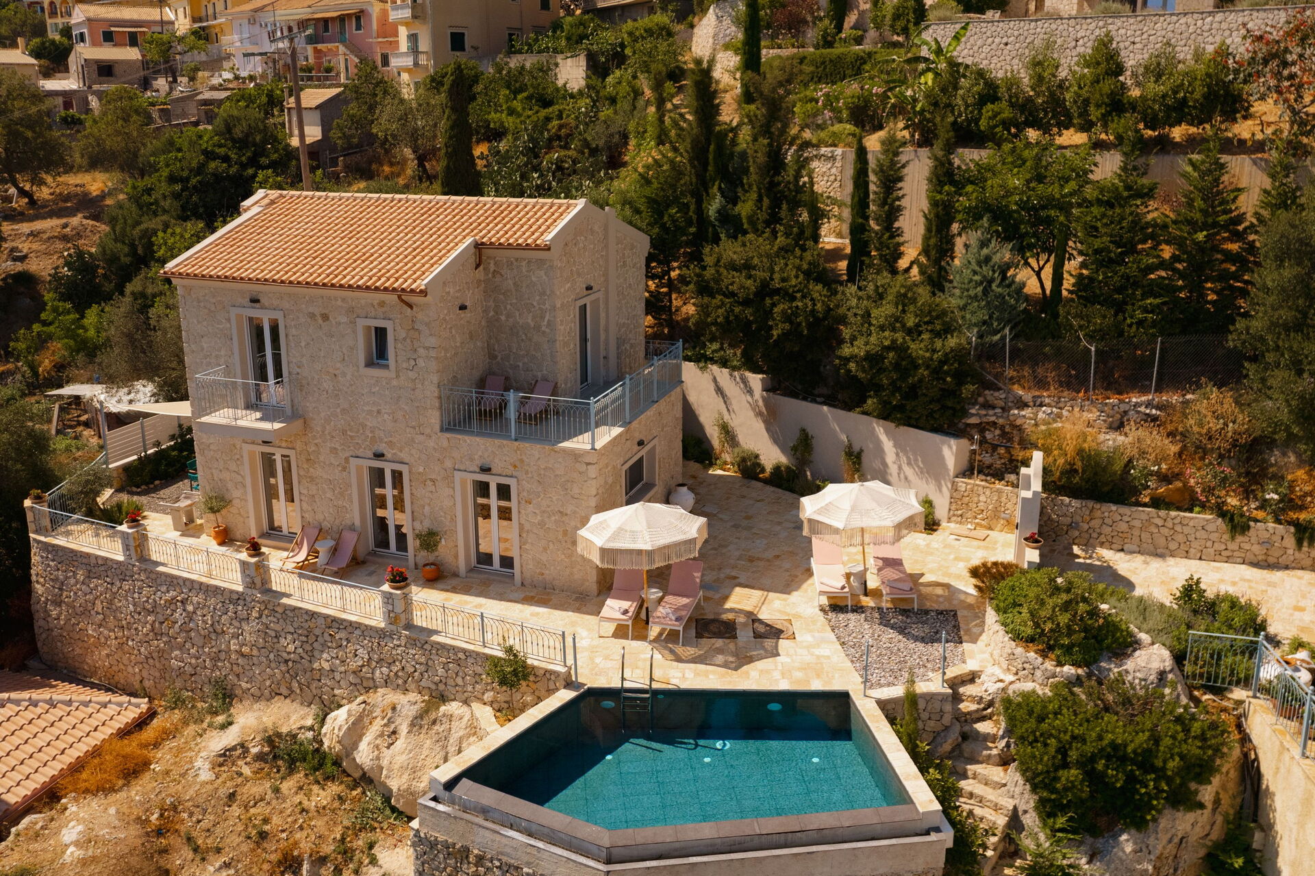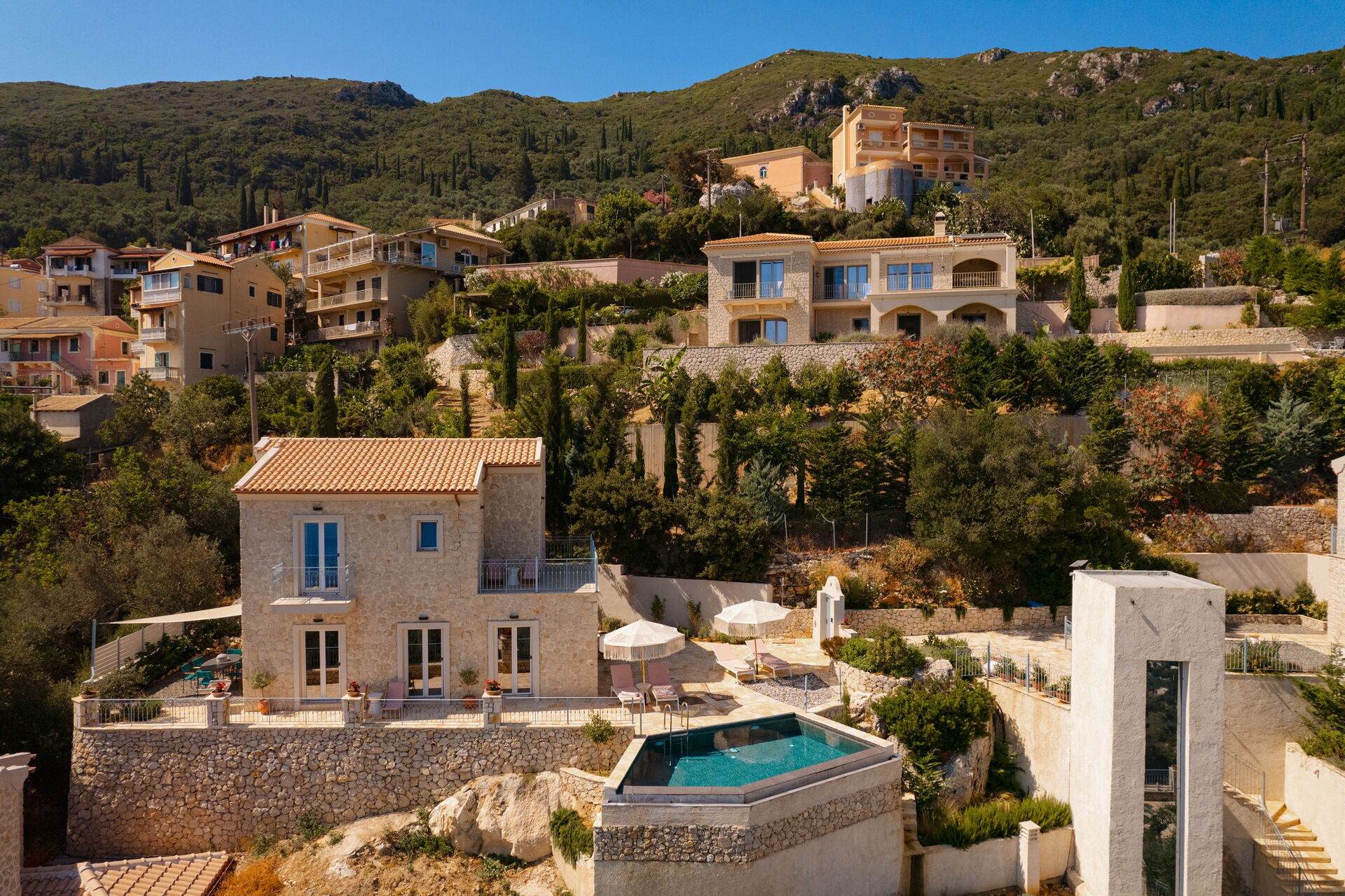 Een buitenruimte met prachtig uitzicht biedt een prachtig privézwembad en een zonneterras waar u kunt genieten van de zonnige Corfu-dagen.
