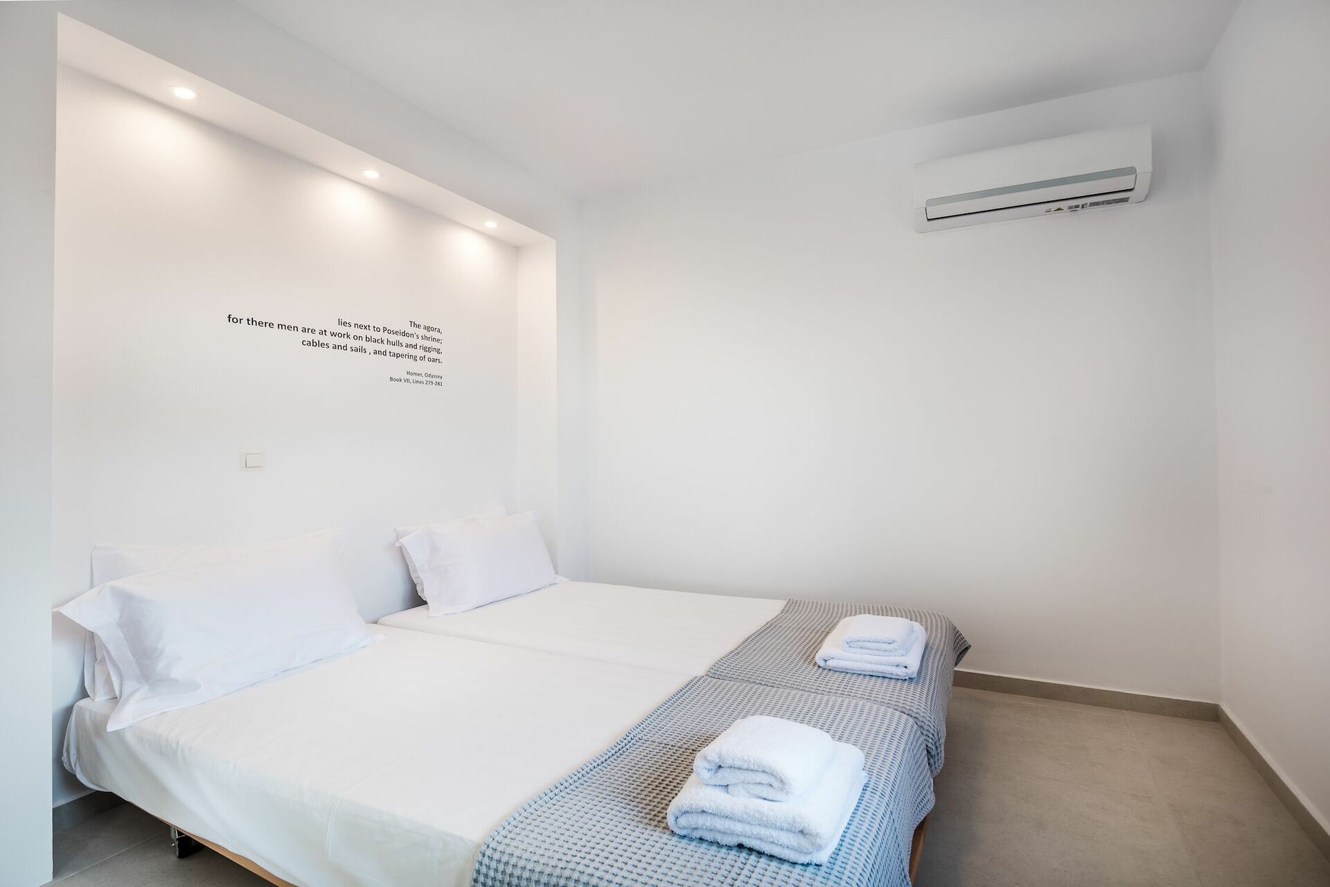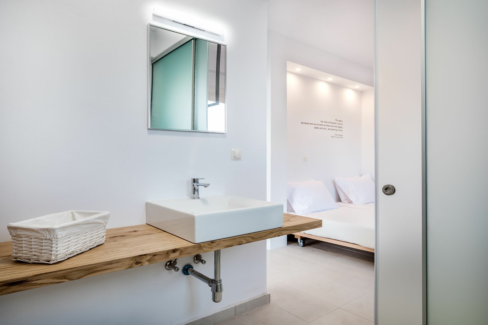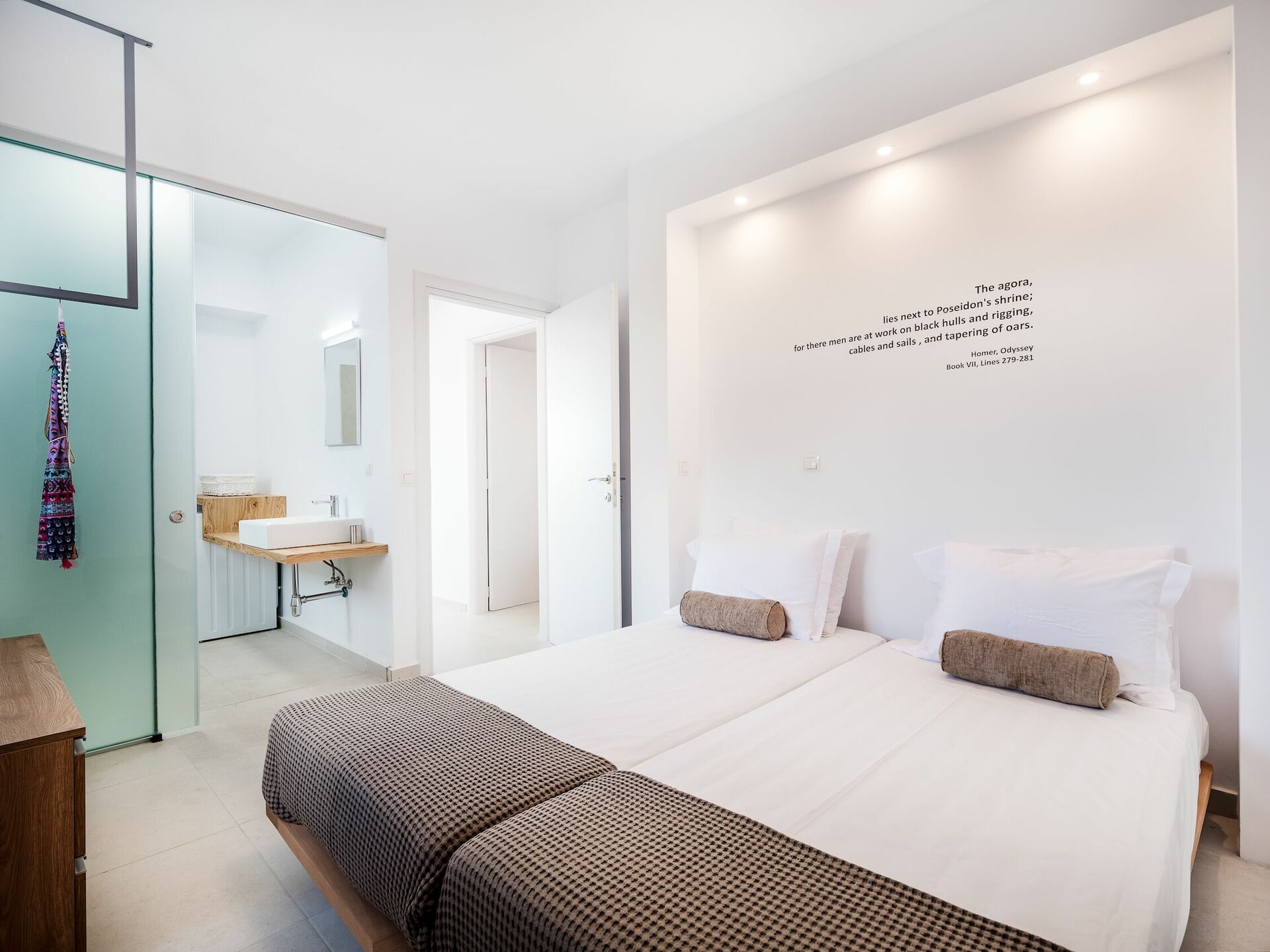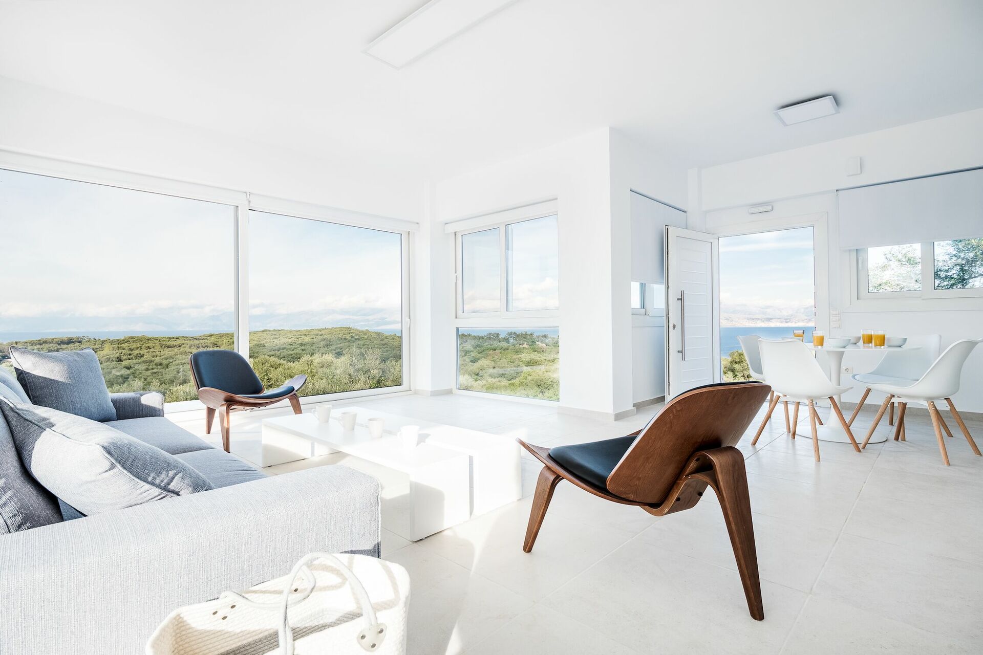 Binnen is deze gloednieuwe villa verdeeld over twee verdiepingen verbonden via een zijtrap. Met enorme openslaande deuren, grote ramen en designmeubilair geniet Villa Athena van alle zon en licht die Griekenland kan bieden. Op de begane grond is er een ruime woonkamer (banken, Wi-Fi, airconditioning) met een aangrenzende keuken (volledig uitgerust) en twee slaapkamers (beide en-suite). Een slaapkamer heeft een tweepersoonsbed en een bank (die kan worden omgezet in een grote slaapbank voor één persoon), terwijl de andere slaapkamer twee losse bedden heeft. De bovenste verdieping is identiek aan de onderste, behalve dat de slaapkamer slechts een tweepersoonsbed heeft en geen extra slaapbank. Uitgebreide terrassen op beide verdiepingen bieden een magisch uitzicht over de Ionische Zee en de Albanese kust.
