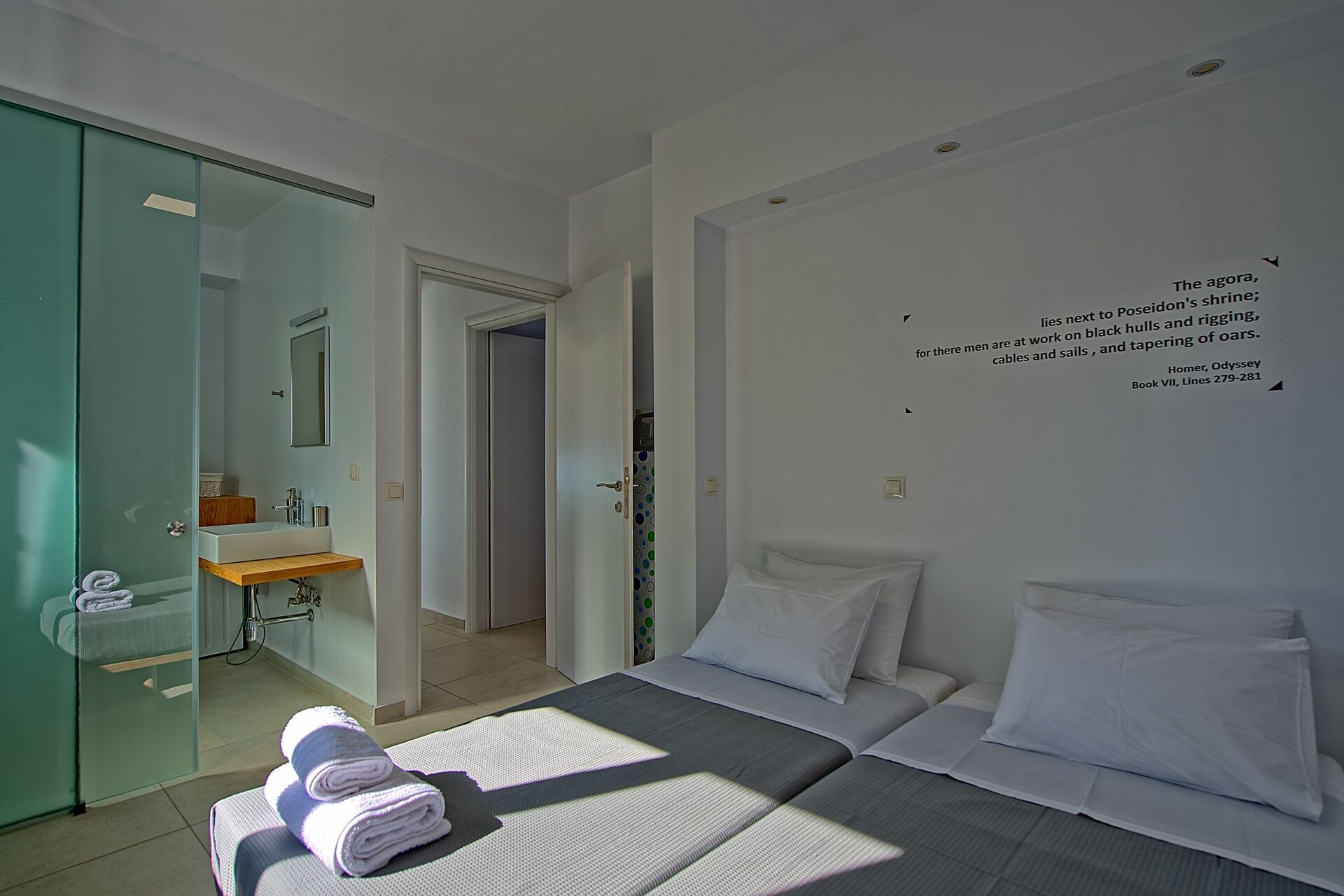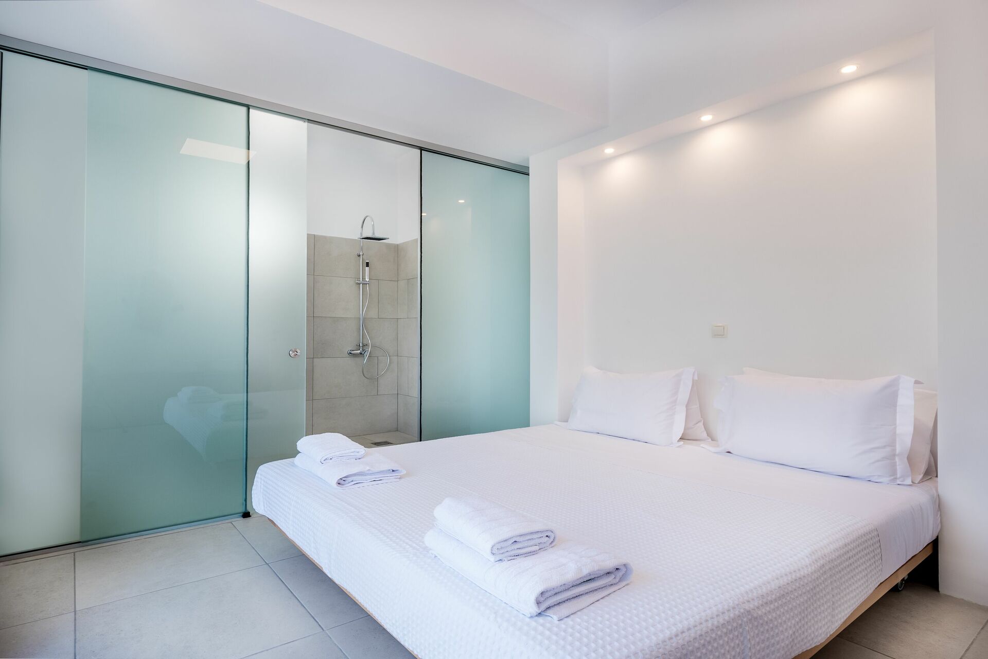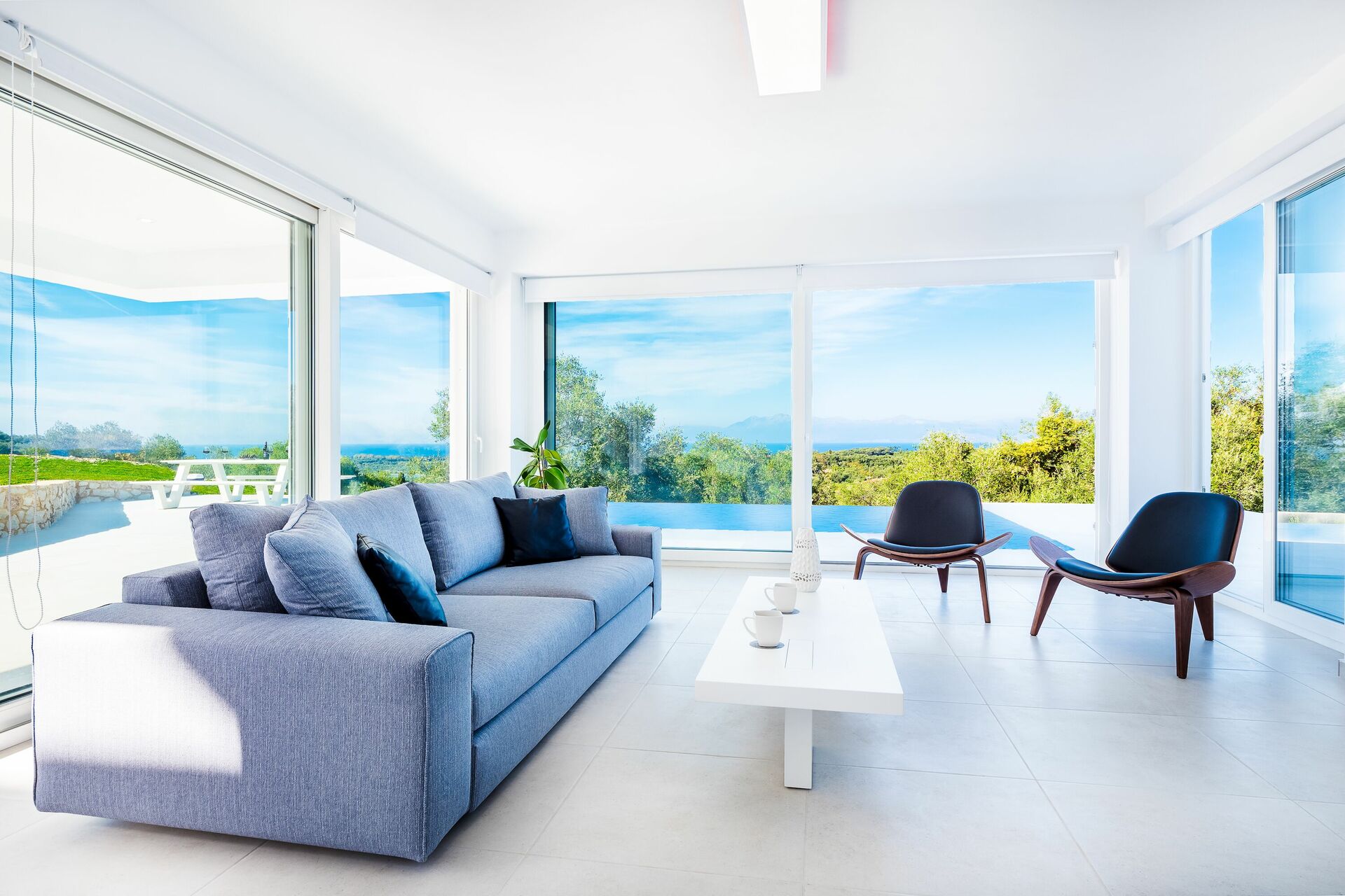 Binnen is deze gloednieuwe villa verdeeld over twee verdiepingen verbonden via een zijtrap. Met enorme openslaande deuren, grote ramen en designmeubilair geniet Villa Nafsika van alle zon en licht die Griekenland kan bieden. Op de begane grond is er een ruime woonkamer (banken, Wi-Fi, airconditioning) met een aangrenzende keuken (volledig uitgerust) en twee slaapkamers (beide en-suite). Een slaapkamer heeft een tweepersoonsbed en een bank (die kan worden omgezet in een grote slaapbank voor één persoon), terwijl de andere slaapkamer twee losse bedden heeft. De bovenste verdieping is identiek aan de onderste, behalve dat de slaapkamer slechts een tweepersoonsbed heeft en geen extra slaapbank. Uitgebreide terrassen op beide verdiepingen bieden een magisch uitzicht over de Ionische Zee en de Albanese kust.