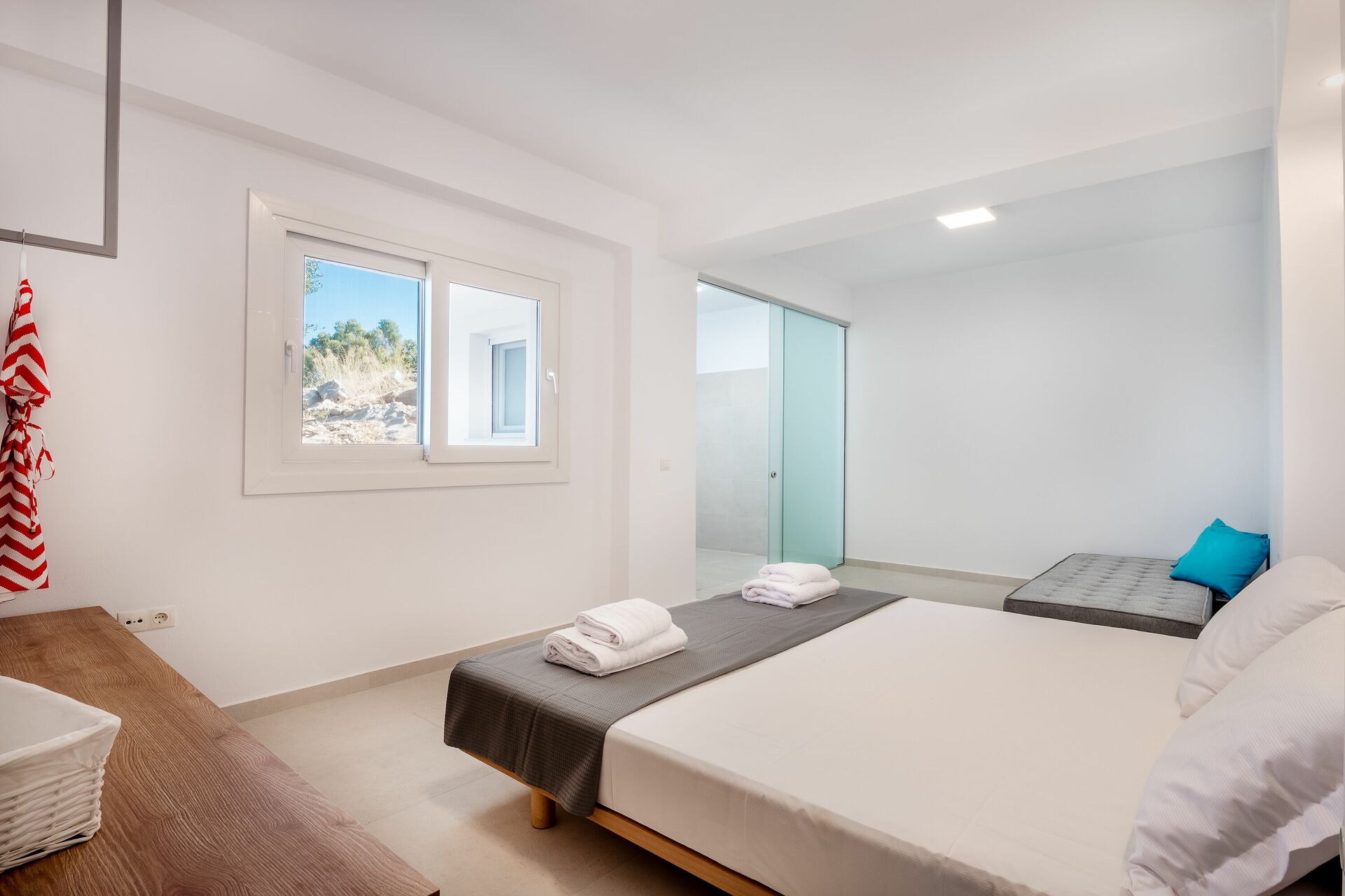 Eerste verdieping (toegankelijk via een externe buitentrap): de hoofdslaapkamer (tweepersoonsbed, airconditioning) met en-suite badkamer met douche, een slaapkamer met twee eenpersoonsbedden (airconditioning) met en-suite badkamer met douche, woonkamer met kitchenette, uitgebreide terrassen.