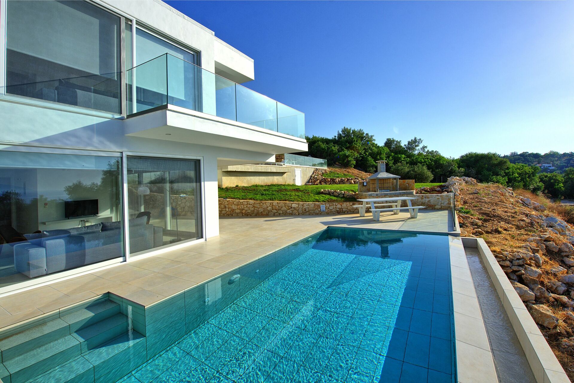 Buiten bevinden zich prachtig geplaveide patio's met ligbedden zodat alle gasten kunnen genieten van de meest sensationele uitzichten en de bries van de kustlijn. Een eethoek met barbecue is beschikbaar, voor heerlijke maaltijden in de buitenlucht. Het privézwembad meet 7,5 x 5,7 m (diepte 1,5 m) en is 's nachts prachtig verlicht (toegang via Romeinse trappen).