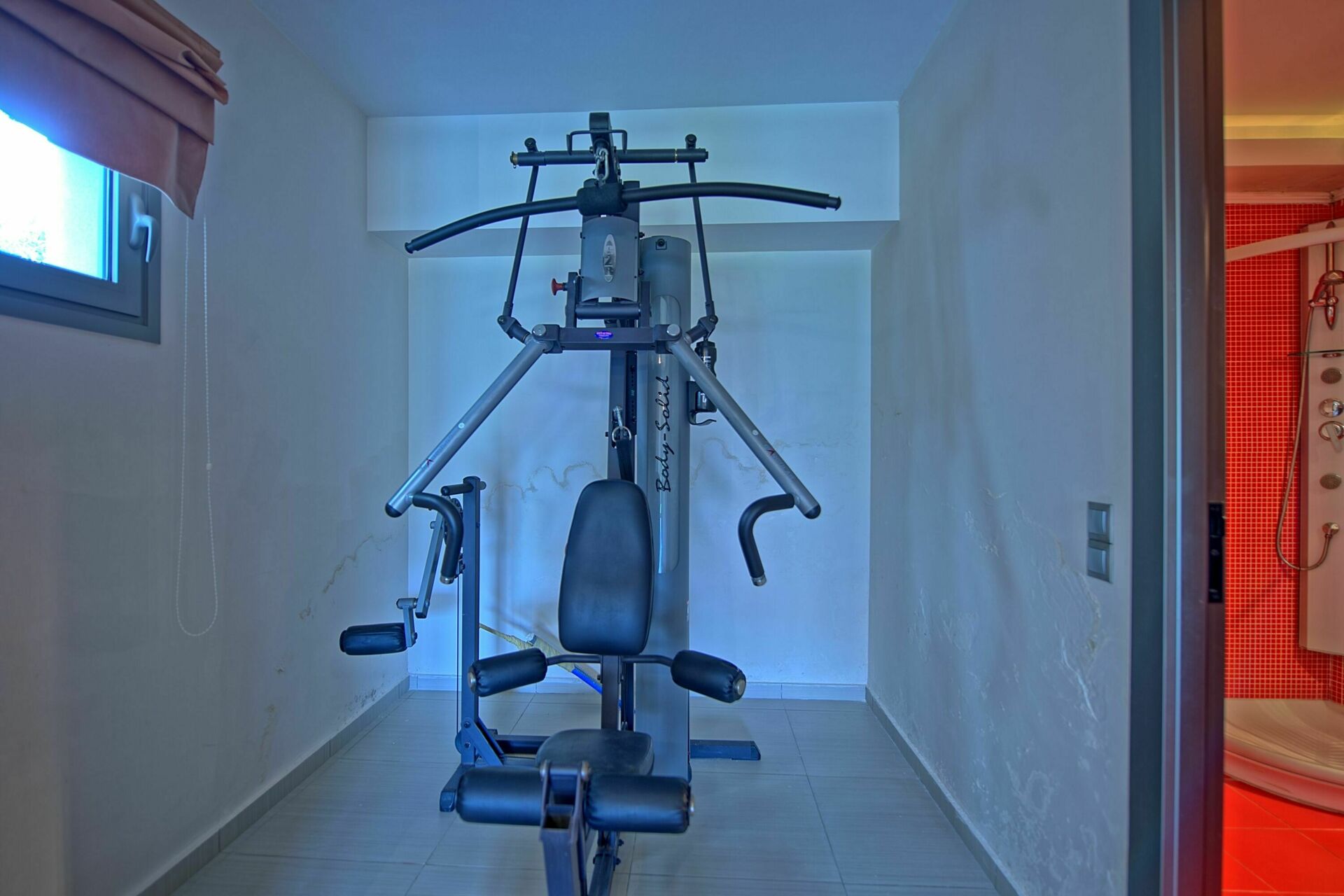 Begane grond: woonkamer (satelliet-tv) en fitnessruimte (loopband, gewichtsmachine); dubbele slaapkamer; badkamer met douche (geen raam); kamer met wasmachine.