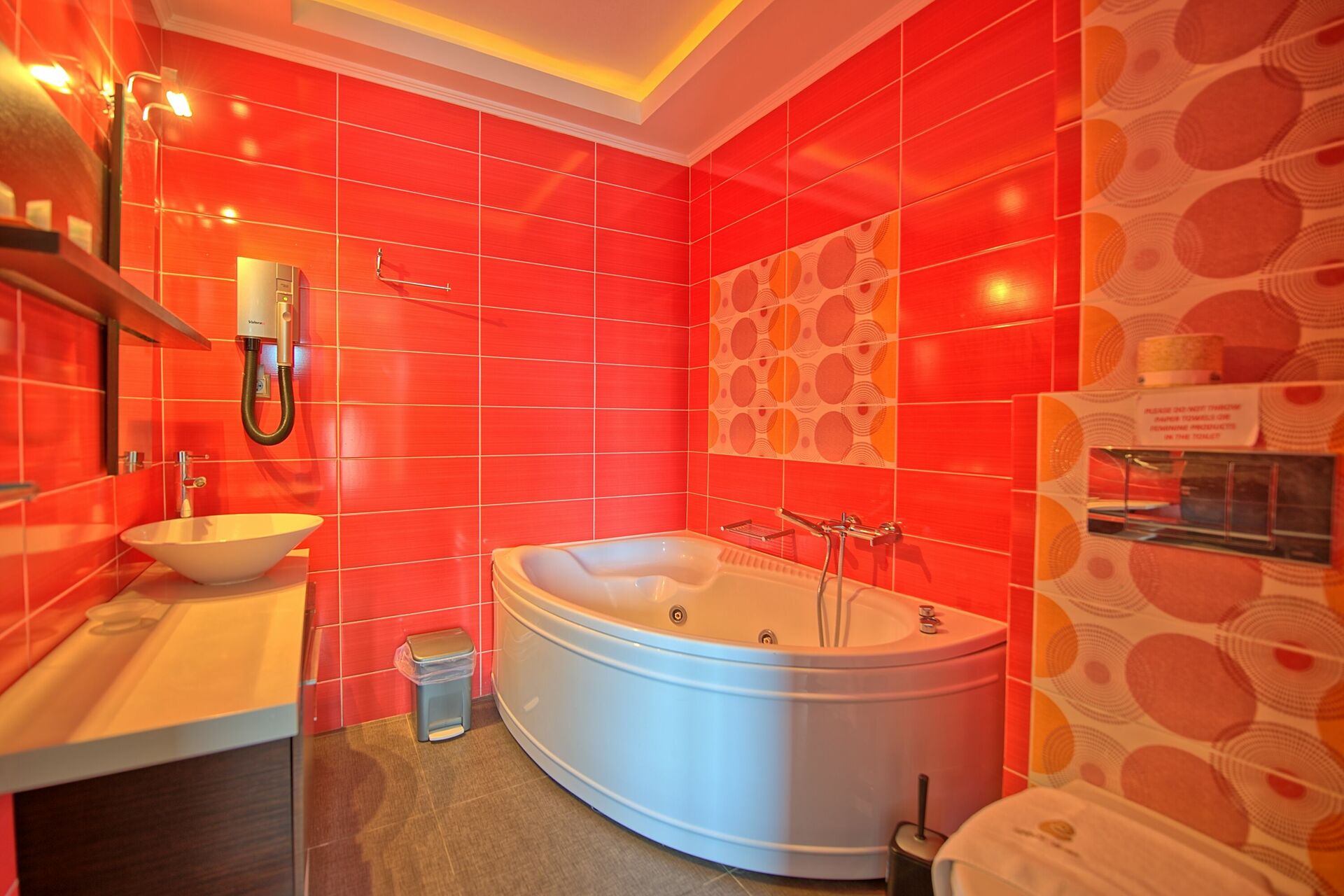Tweede verdieping: hoofdslaapkamer met tweepersoonsbed met eigen badkamer met bubbelbad en terras; tweepersoons slaapkamer met eigen badkamer met douche; eenpersoonskamer (extra bed voor één persoon kan op aanvraag gratis worden toegevoegd) met eigen badkamer met douche.