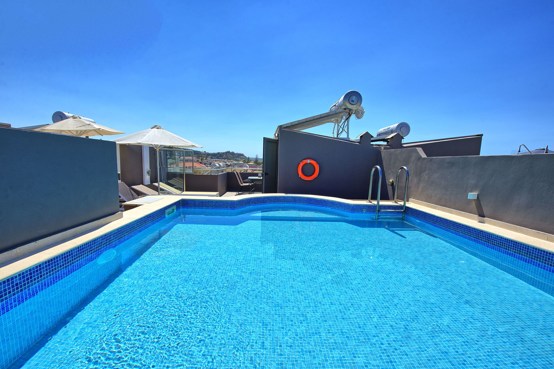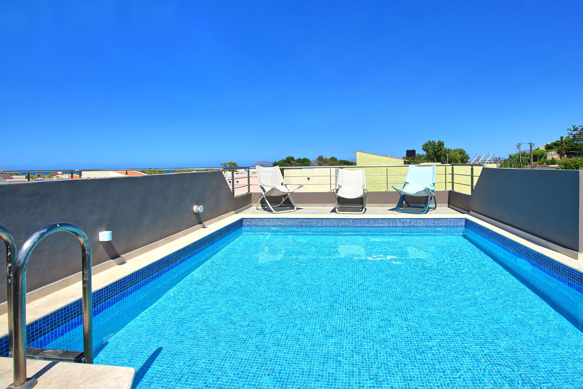 Derde verdieping: terras met panoramisch uitzicht en privézwembad (diepte: 0,55 meter), buitendouche, tafel en stoelen om buiten te eten.