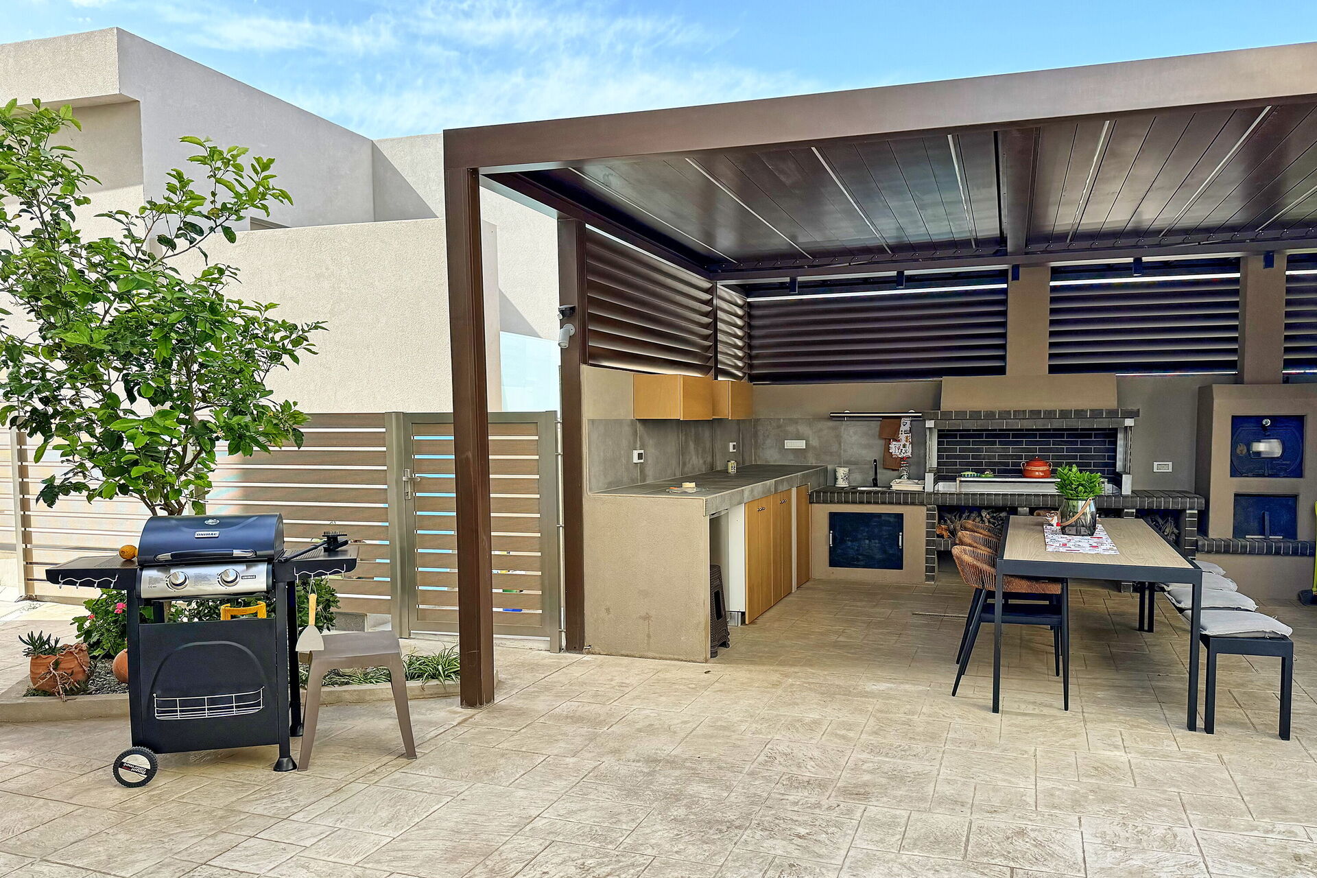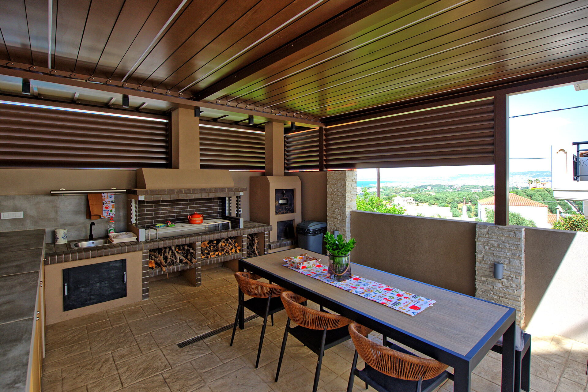 Er is een overdekte buitenruimte op de begane grond van de villa, uitgerust met een barbecue en een houtoven om buiten te koken en dineren; koel af in het privézwembad op zonnige mediterrane dagen.