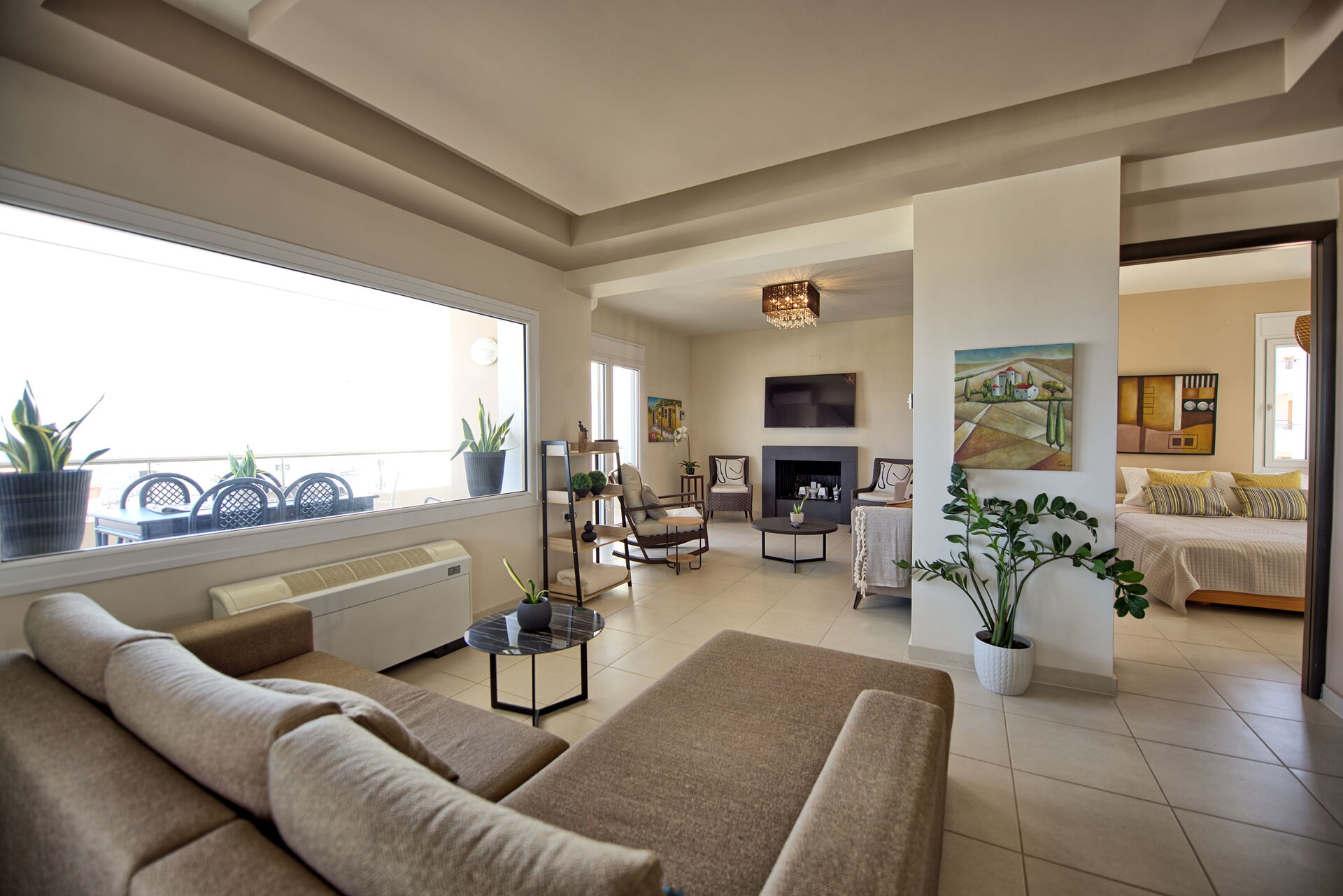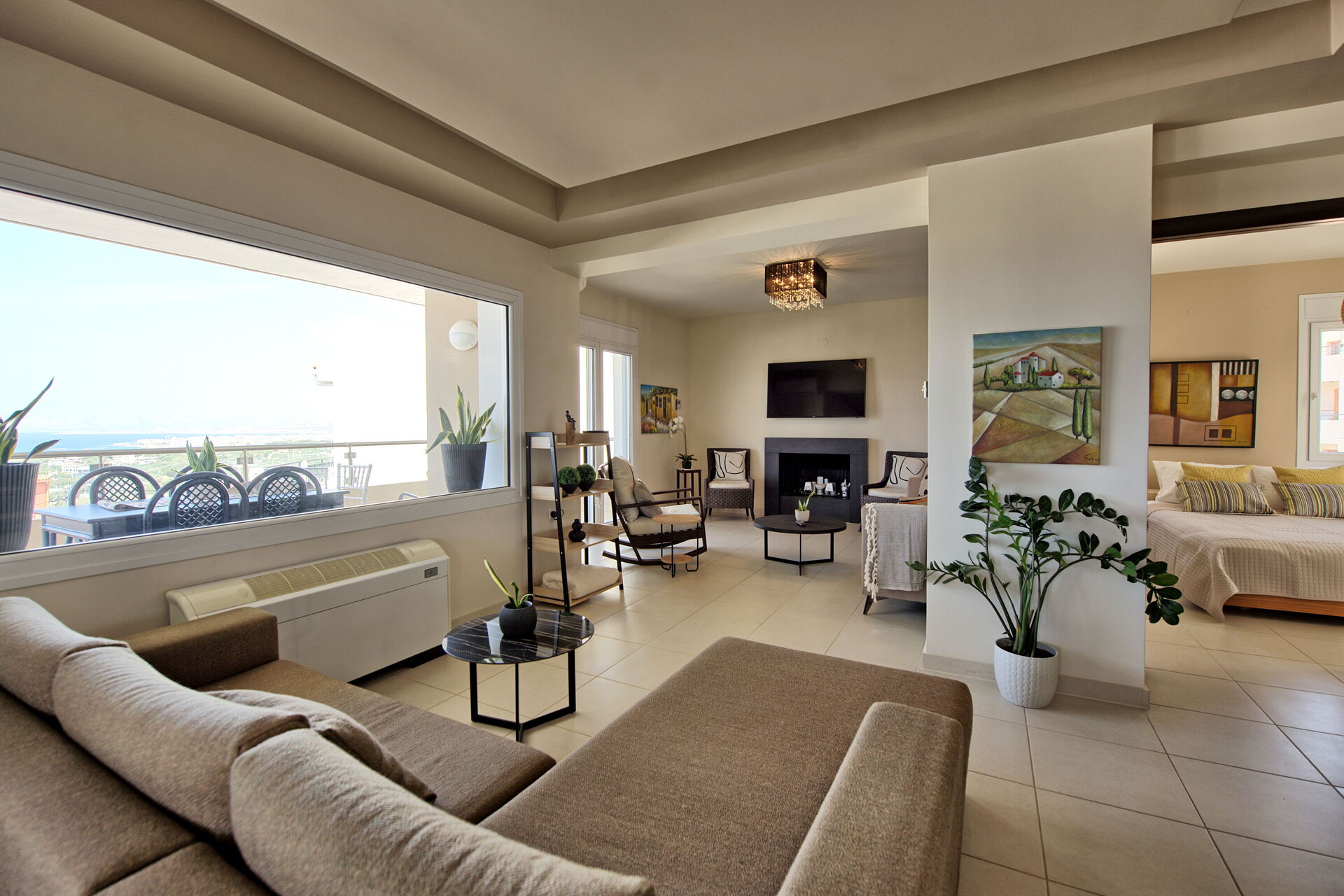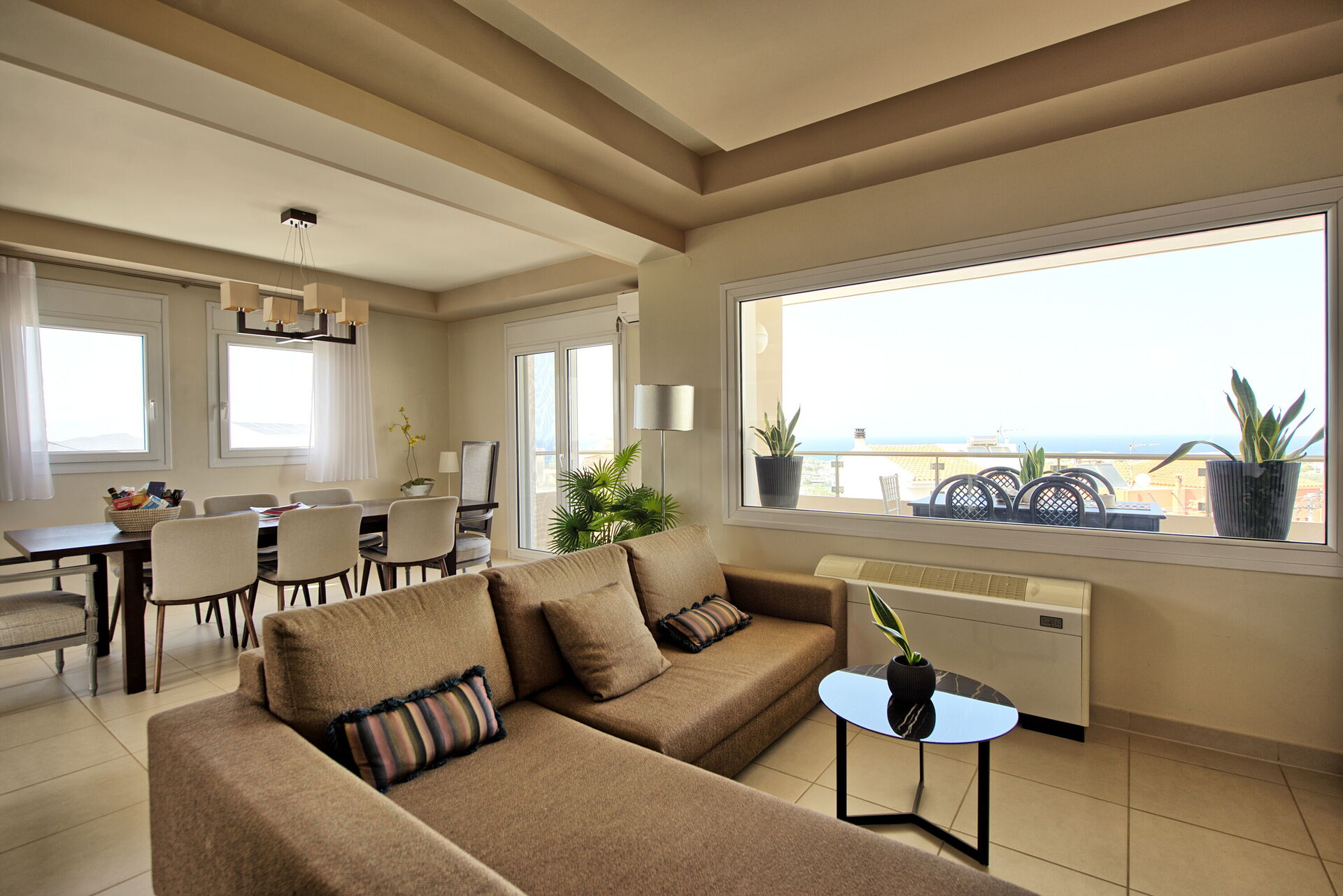 De lichte woonkamer van het huis biedt een prachtig uitzicht tot aan de zee. Als u op zoek bent naar een huis voor uw vakantie op Kreta, zal Villa Endless View u niet teleurstellen: het is zeer comfortabel en gastvrij, met 3 slaapkamers voor maximaal 6 personen.