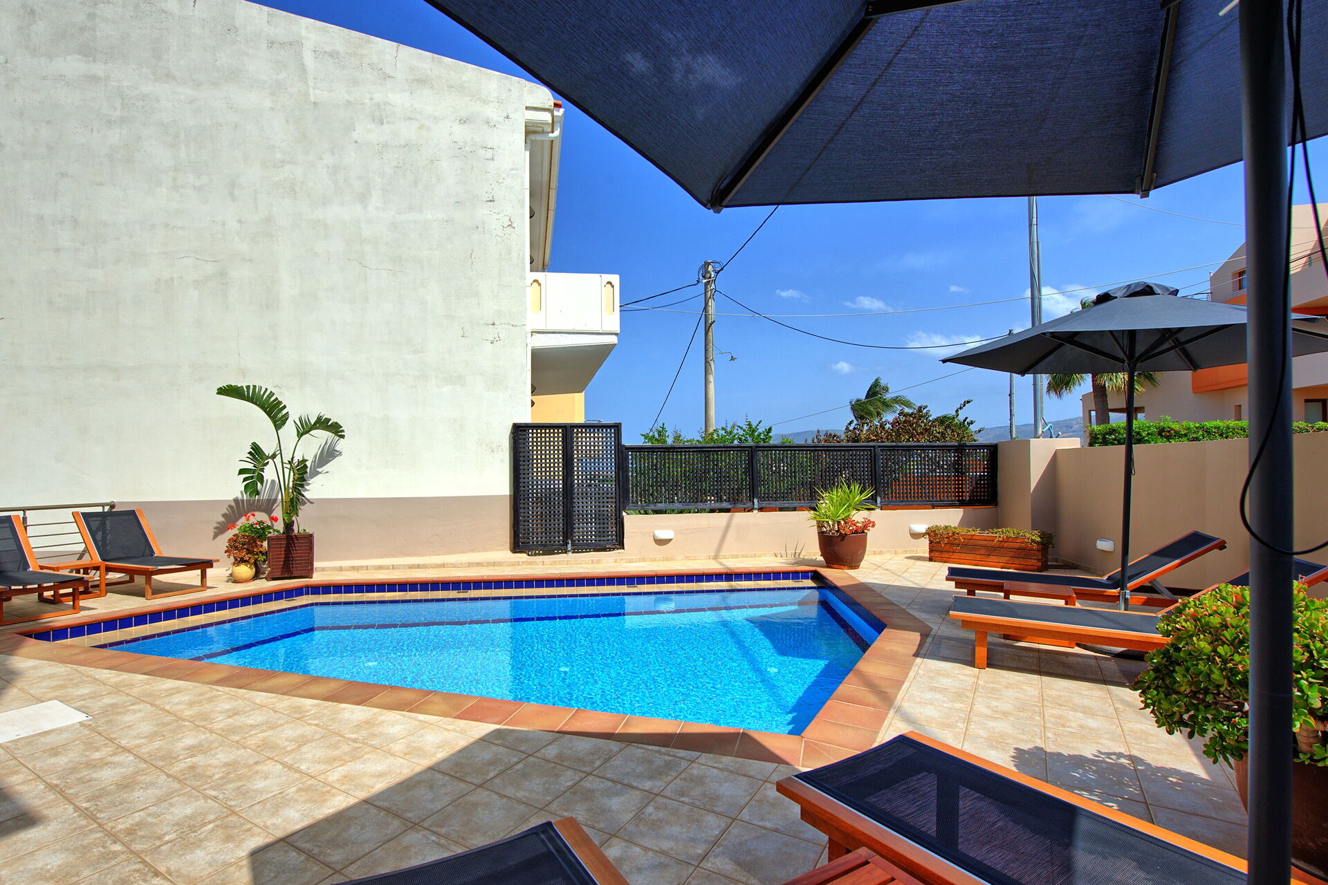 The pool looks great, sunbeds are there, and there is also a barbecue with a terrace that looks cool.