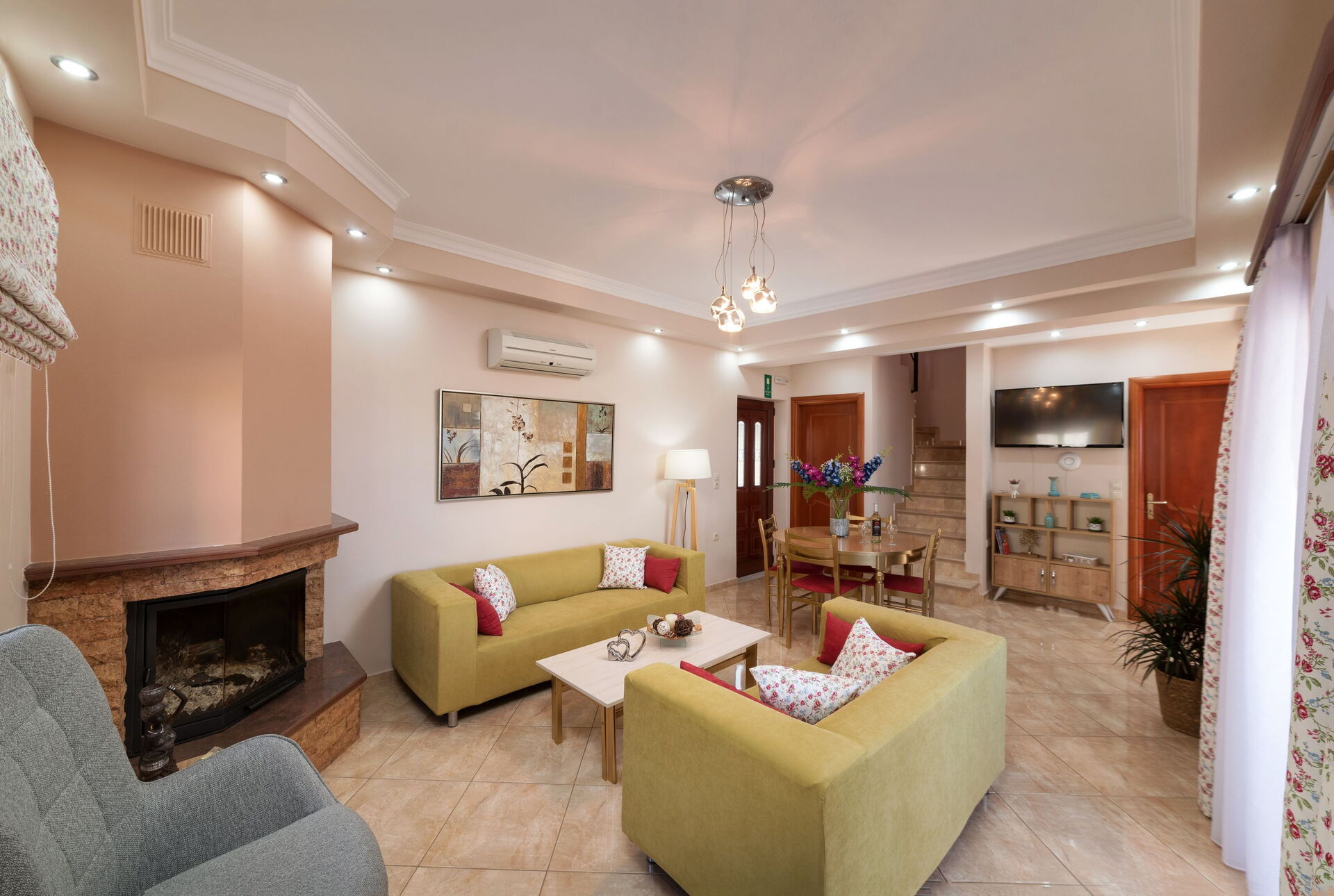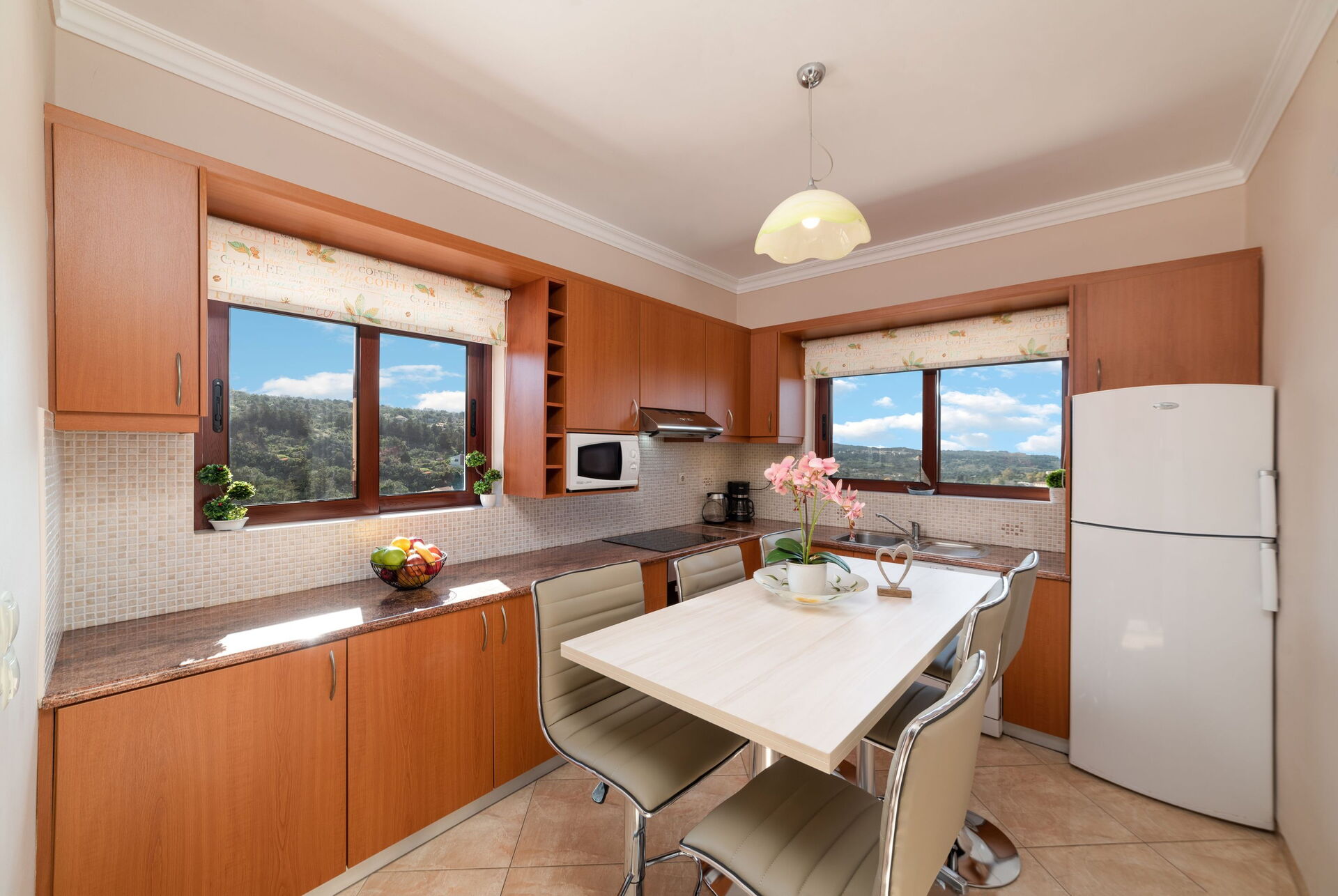 Begane grond: woonkamer (airconditioning) met eethoek, open haard en keukenhoek (oven, vaatwasser, vriezer, magnetron, waterkoker, broodrooster); toegang tot gemeubileerd terras met panoramisch uitzicht.