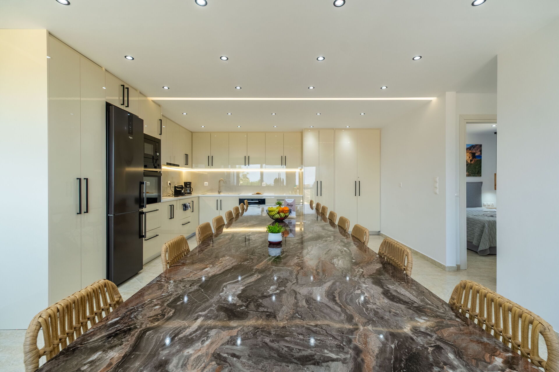 Begane grond: grote eetkamer (airconditioning, tafel voor 18 gasten) en grote keuken (oven, vaatwasser, koelkast), 2 tweepersoonsslaapkamers