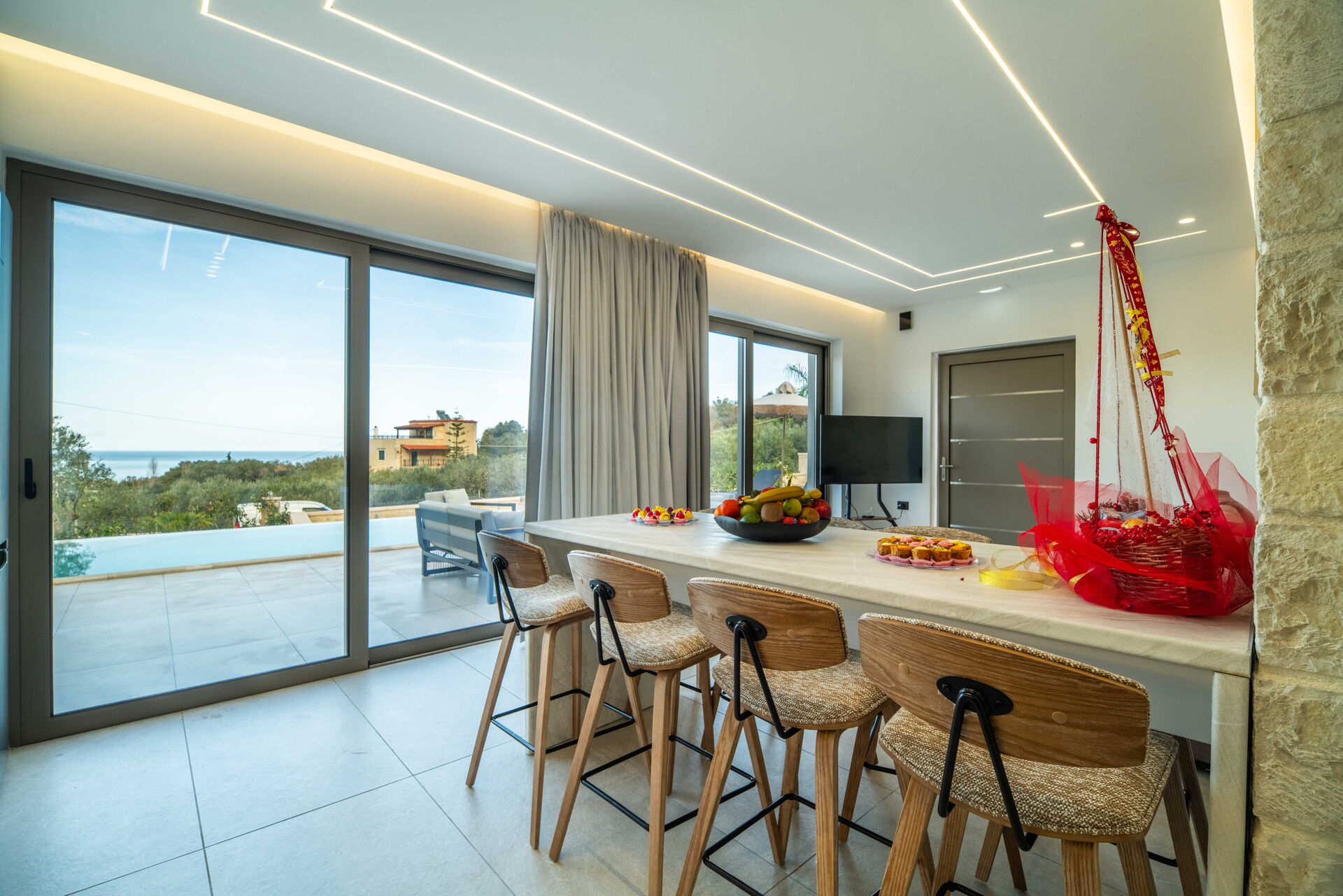Het vakantiehuis is verdeeld over 3 verdiepingen en beschikt in totaal over 5 comfortabele en goed uitgeruste slaapkamers: twee op de eerste verdieping, twee op de begane grond en één op het souterrain. Vanuit de keuken, voorzien van een eettafel, heb je een prachtig uitzicht op het zwembad, het landschap en de zee. Er is ook een gemeubileerde buitenruimte voor maaltijden in de open lucht.