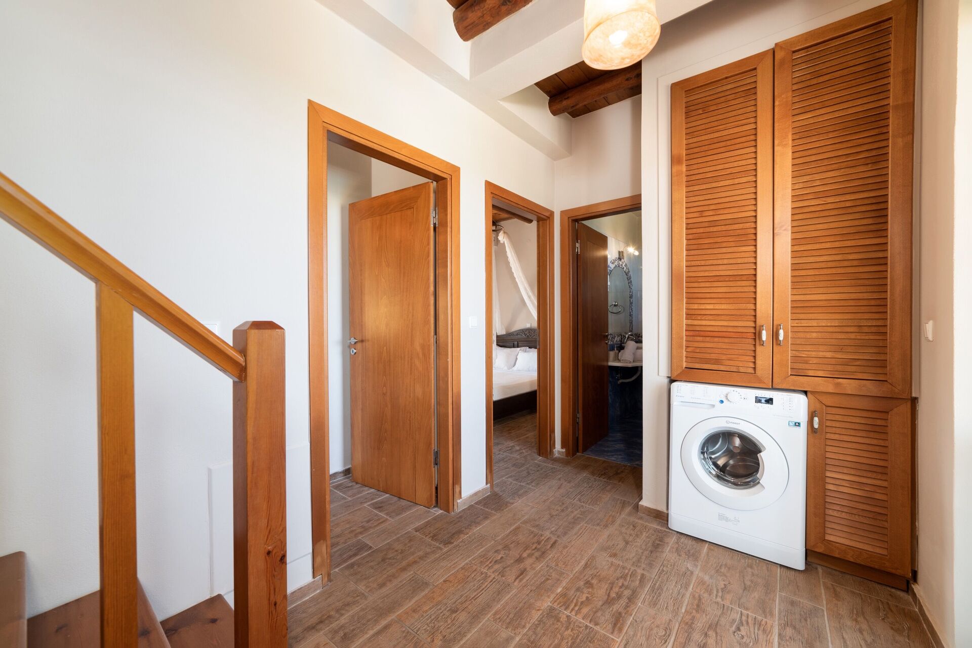 Eerste verdieping: slaapkamer met tweepersoonsbed, slaapkamer met twee eenpersoonsbedden, badkamer met bubbelbad.