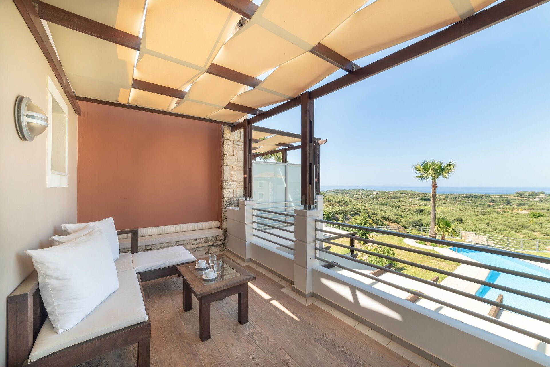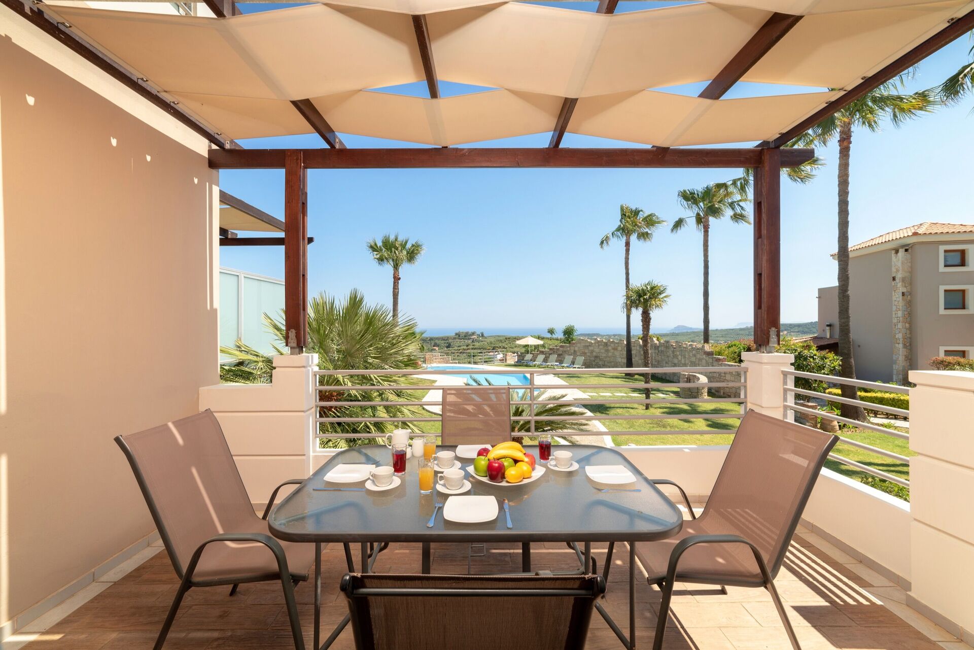 It’s semi-detached – there is another identical villa next door. Each has its own garden and pool, but the gardens are not entirely private, there are bushes & trees to separate them but with some gaps. This was fine for us, and the villas are well positioned so that the balconies do not overlook each other.