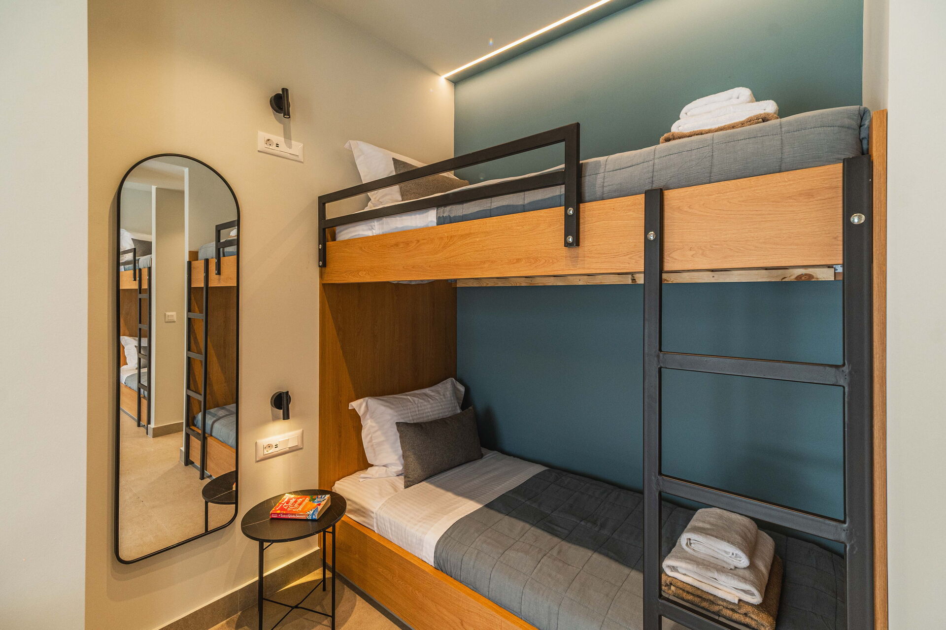 Begane grond: 2 slaapkamers met tweepersoonsbed (afmetingen bed: 160 x 200 cm) elk met een eigen badkamer met douche, 2 slaapkamers met tweepersoonsbed (afmetingen bed: 180 x 200 cm; kunnen op verzoek worden gescheiden) elk met een eigen badkamer met douche, slaapkamer met 2 stapelbedden en een eigen badkamer met douche.