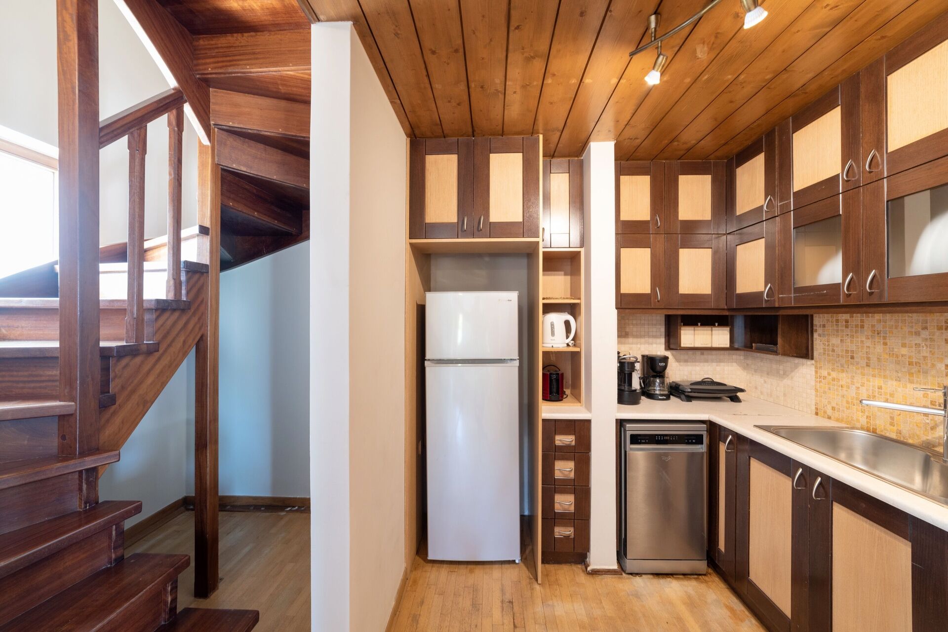 Begane grond: woonkamer (tv, dvd) met open haard en keukenhoek (oven, vaatwasser, espresso-apparaat), badkamer met douche.