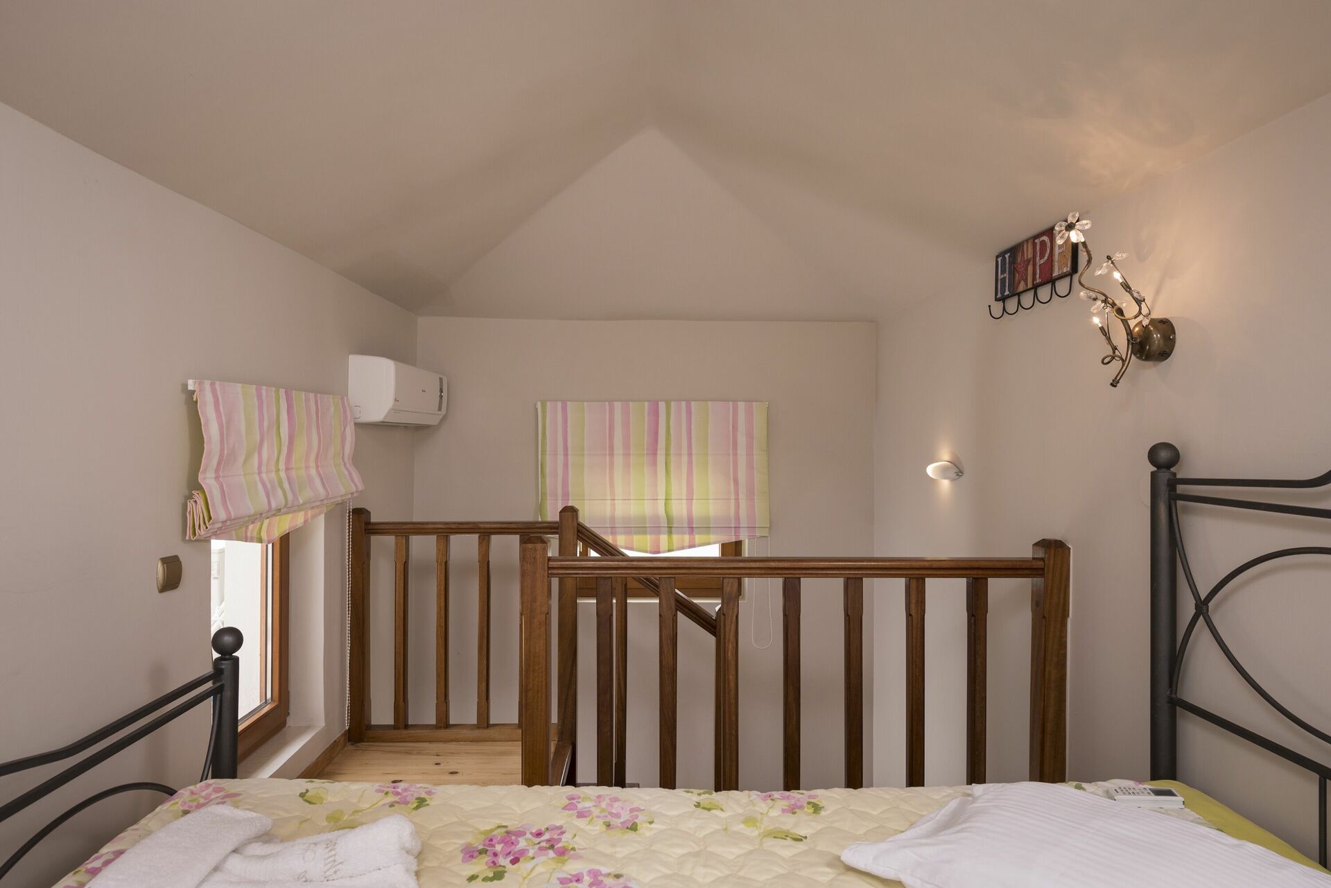 Eerste verdieping: tweepersoonsslaapkamer (kingsize, hemelbed), badkamer met bubbelbad.