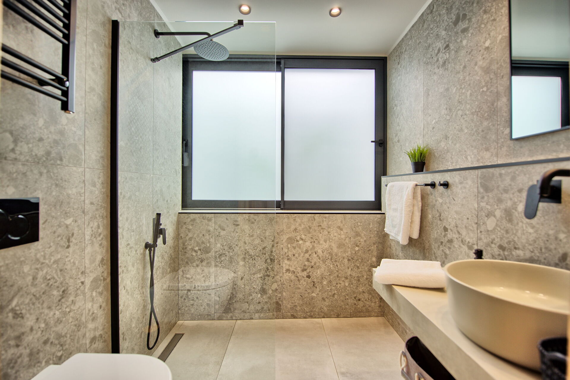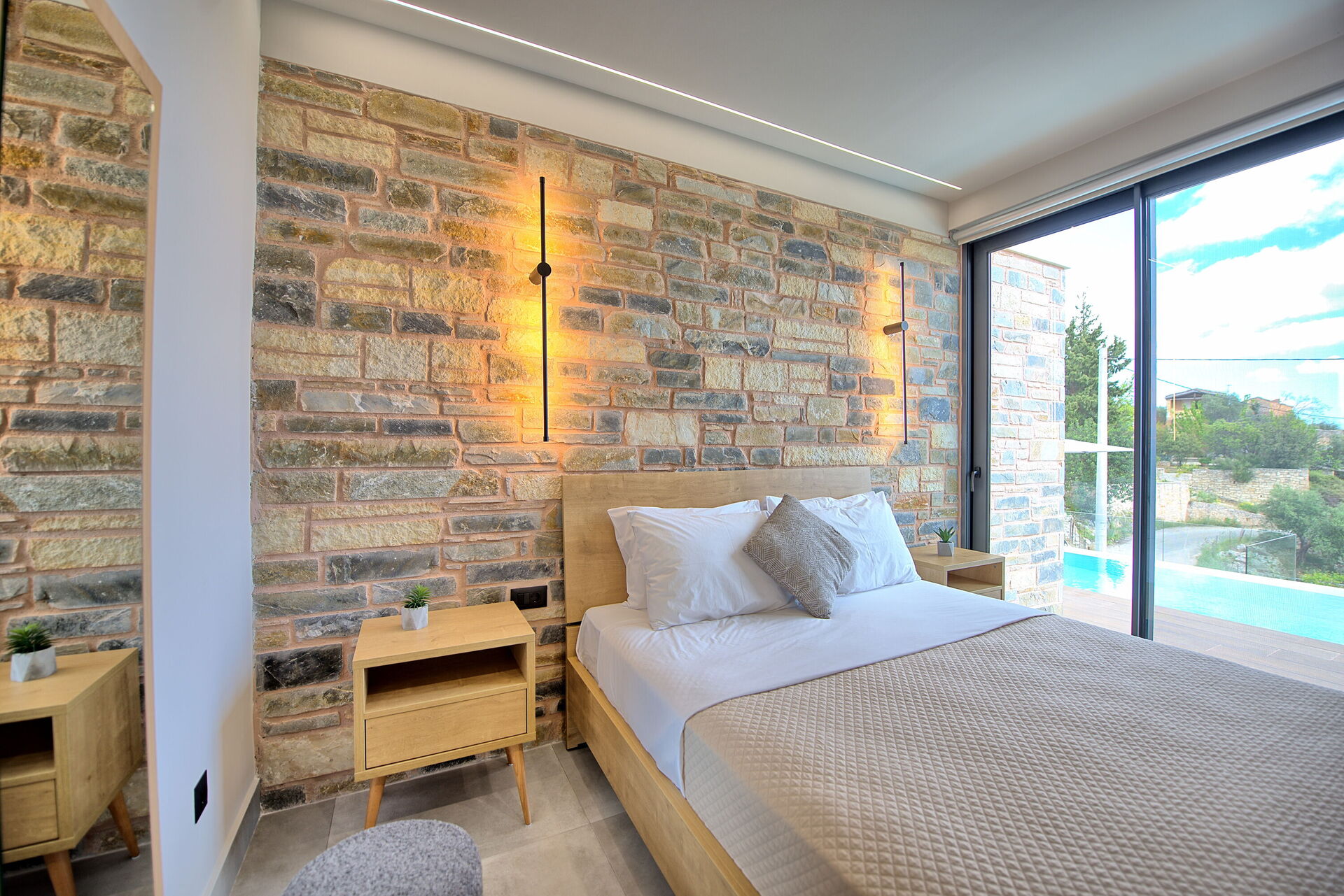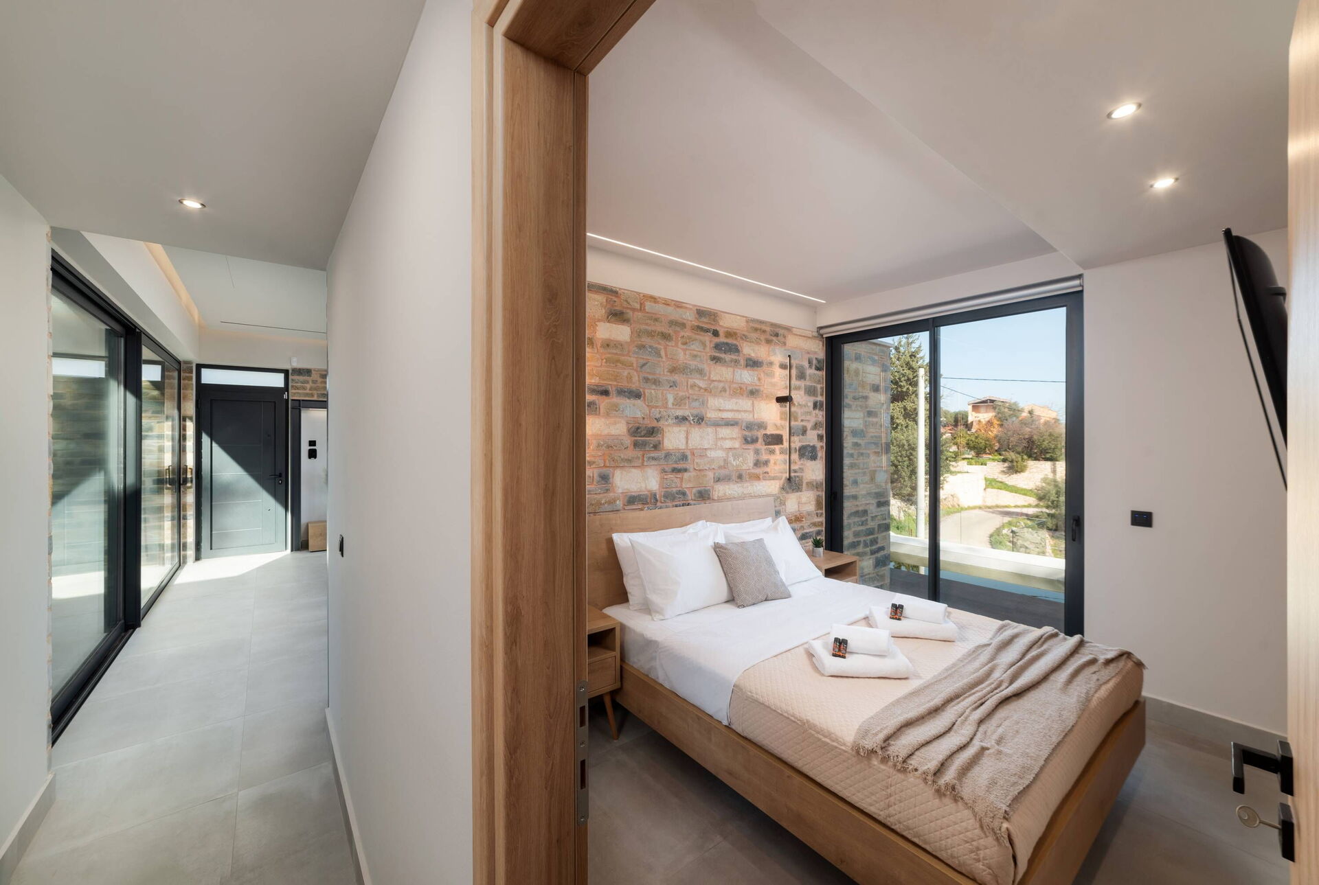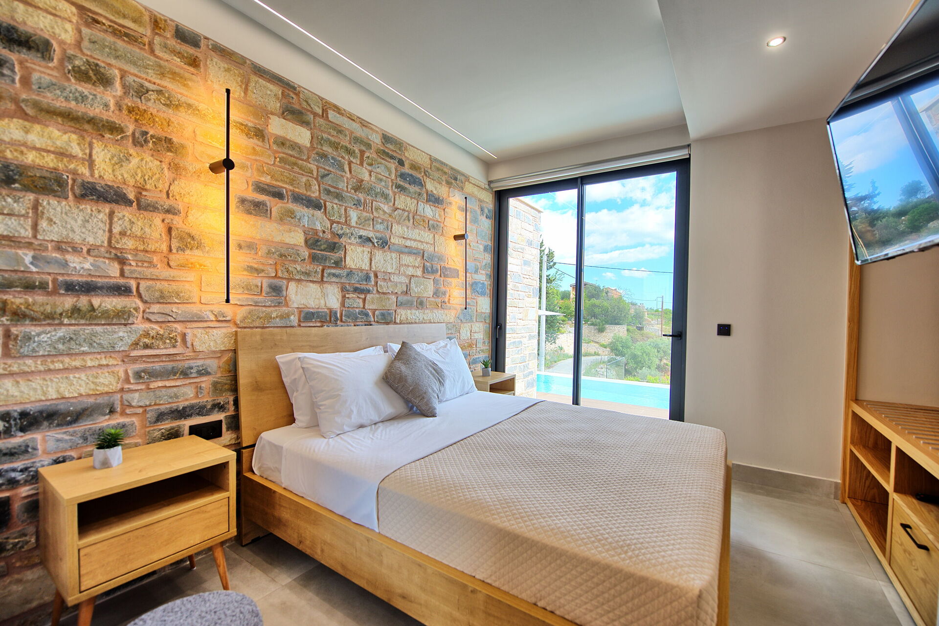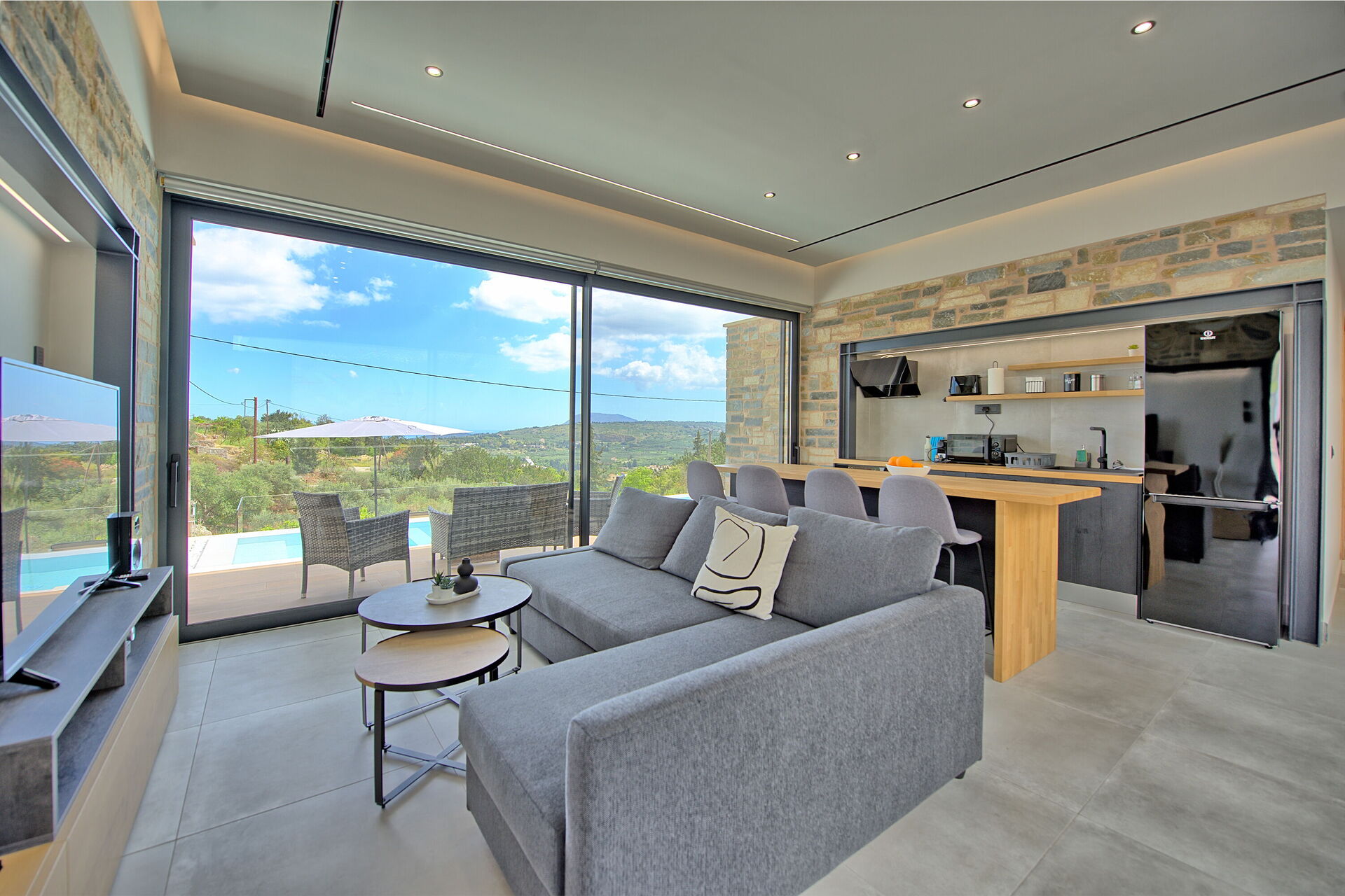 The villa was beautiful and modern. Excellent cleanliness plus the midweek clean exceeded exceptions.The bedrooms were a decent size, but both beds were creaky. Could have done with more hangers in the bedrooms. Pool was a good size with a lovely view. More remote than expected and we had to drive everywhere. The information before arrival was great and the owner was very friendly and welcoming when we arrived. It would be good to have more information in the welcome book e.g. the nearest supermarkets, tavernas, attractions and a reminder about not flushing paper down the toilet.