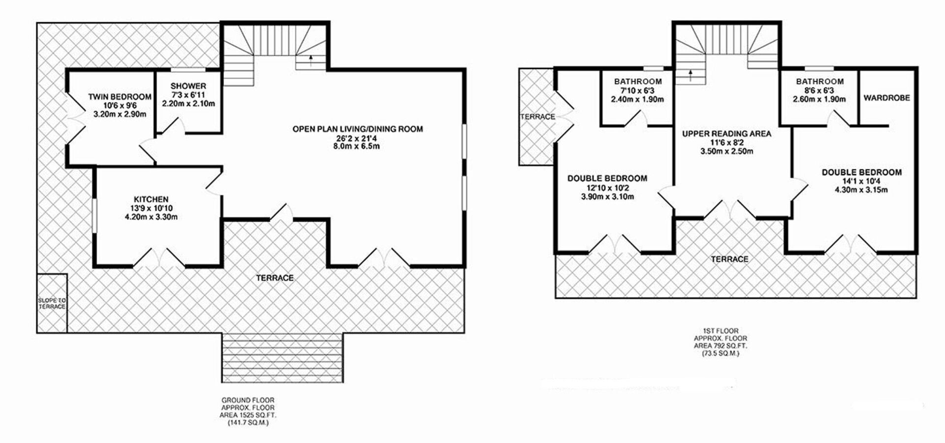 Eerste verdieping: slaapkamer met tweepersoonsbed en eigen badkamer met ligbad; tweepersoonsslaapkamer met bubbelbad.