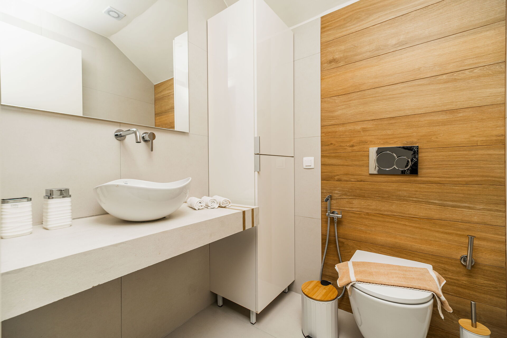 Begane grond: lichte woonkamer met eethoek en keuken (oven, vriezer, vaatwasser), WC, 2 slaapkamers met tweepersoonsbed, elk met een eigen badkamer met douche.