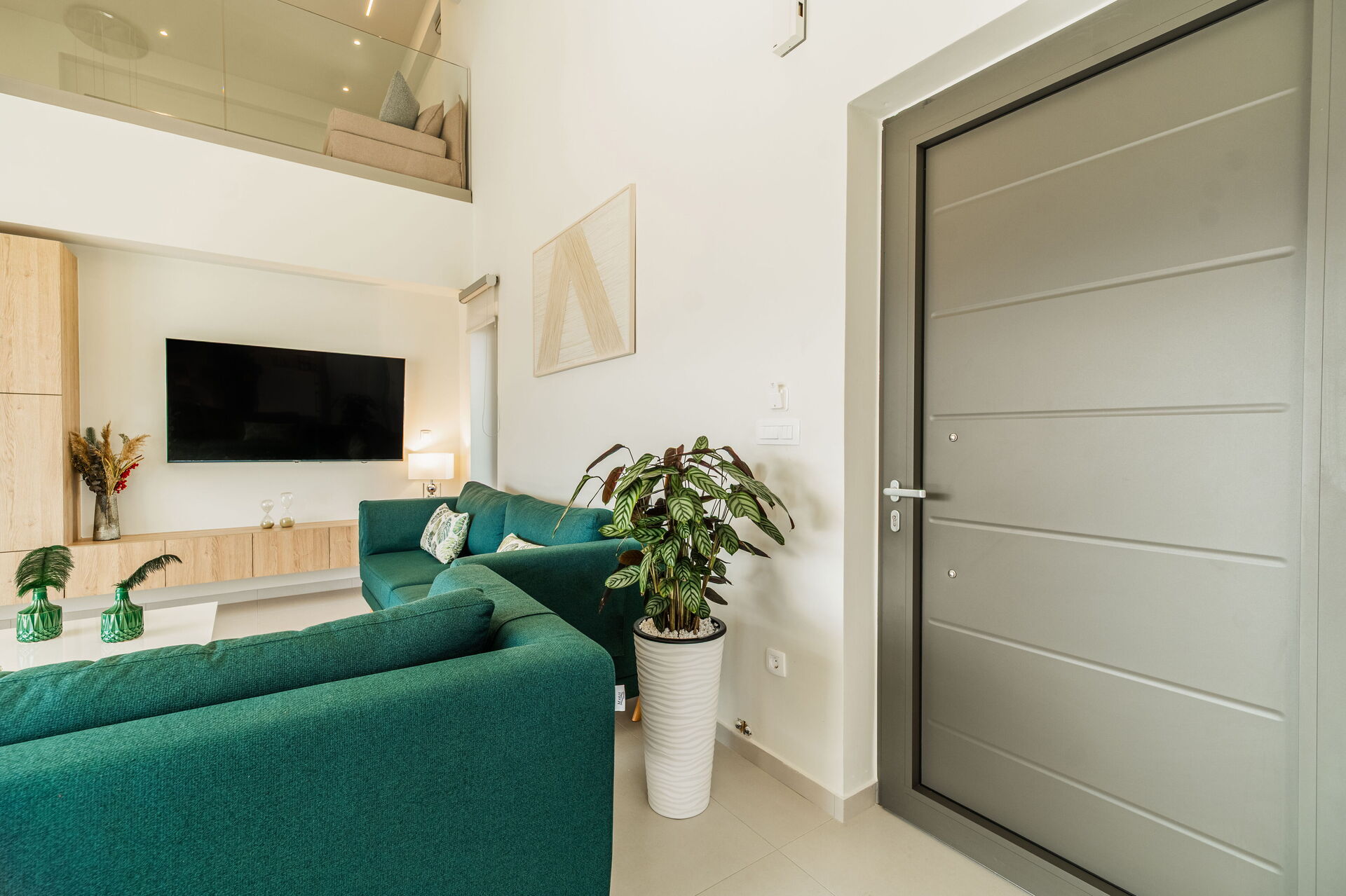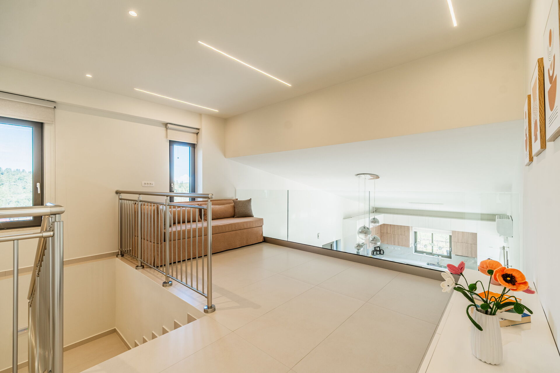 Eerste verdieping: Tweepersoonsslaapbank in een woonhoek met uitzicht over de verdieping eronder, 2 tweepersoons slaapkamers met elk een eigen badkamer met douche en toegang tot een gedeeld schilderachtig balkon.