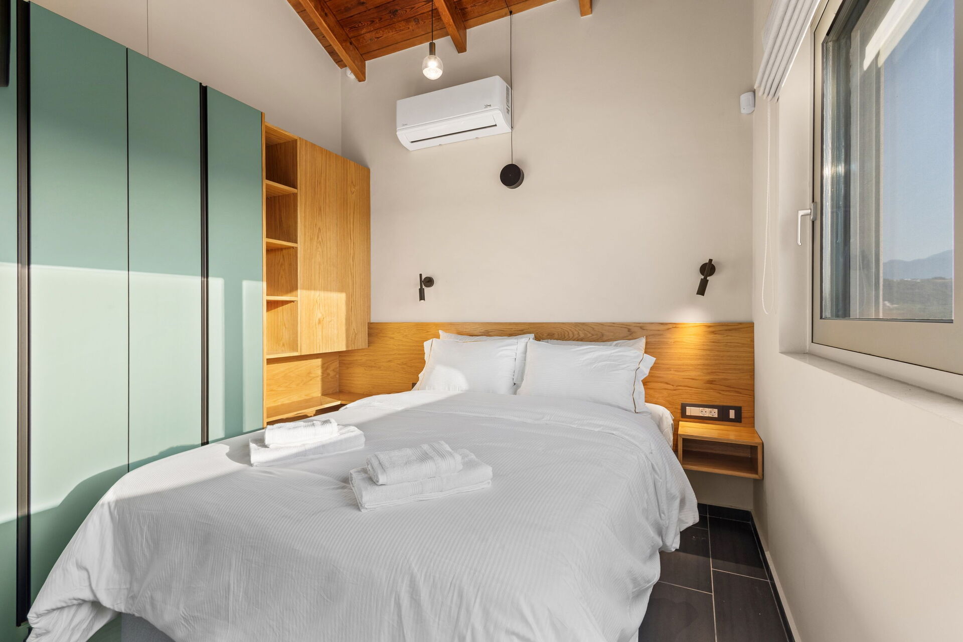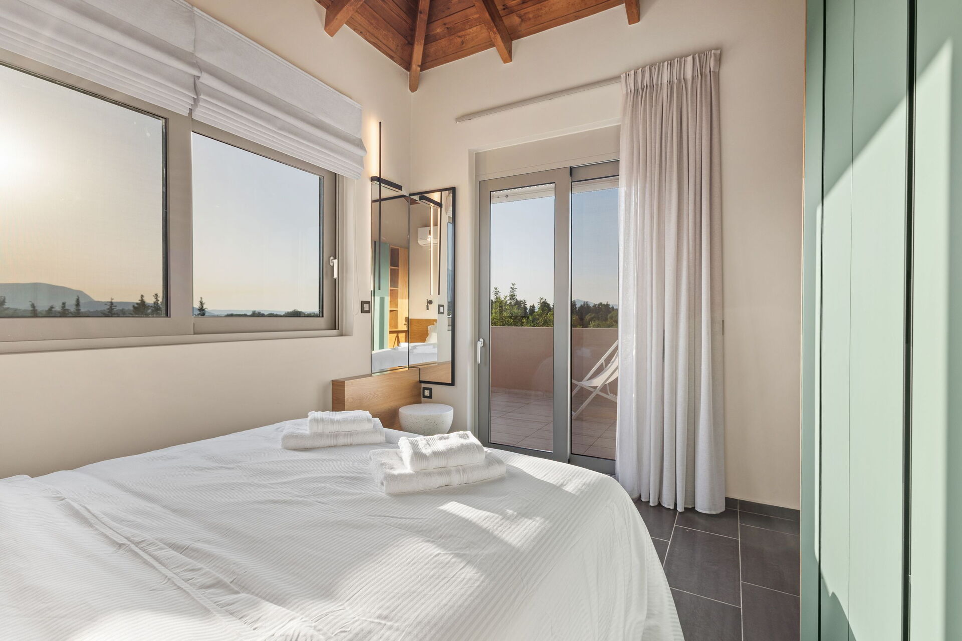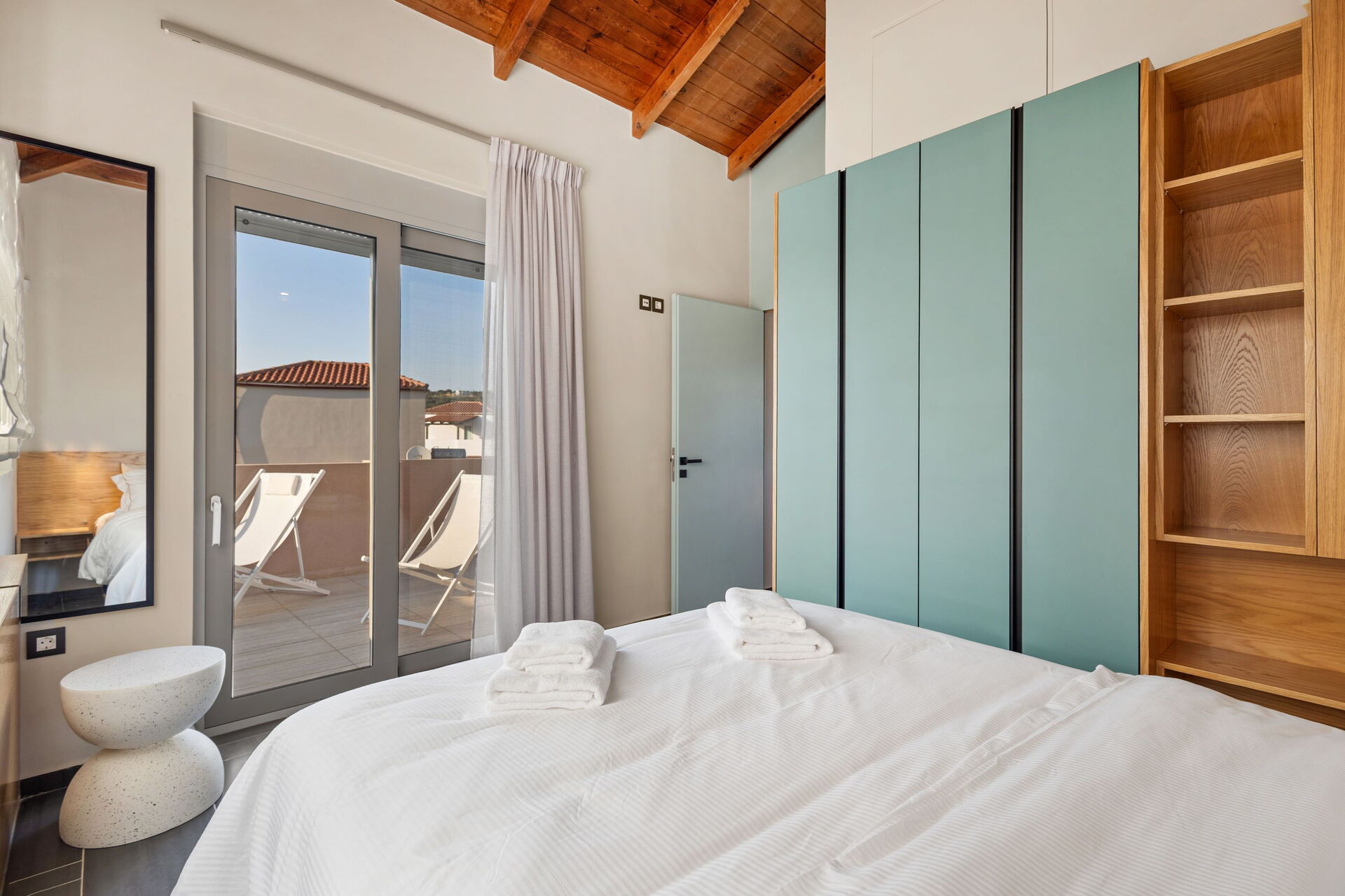 Eerste verdieping: tweepersoonsslaapkamer met eigen badkamer met douche, toegang tot het terras.