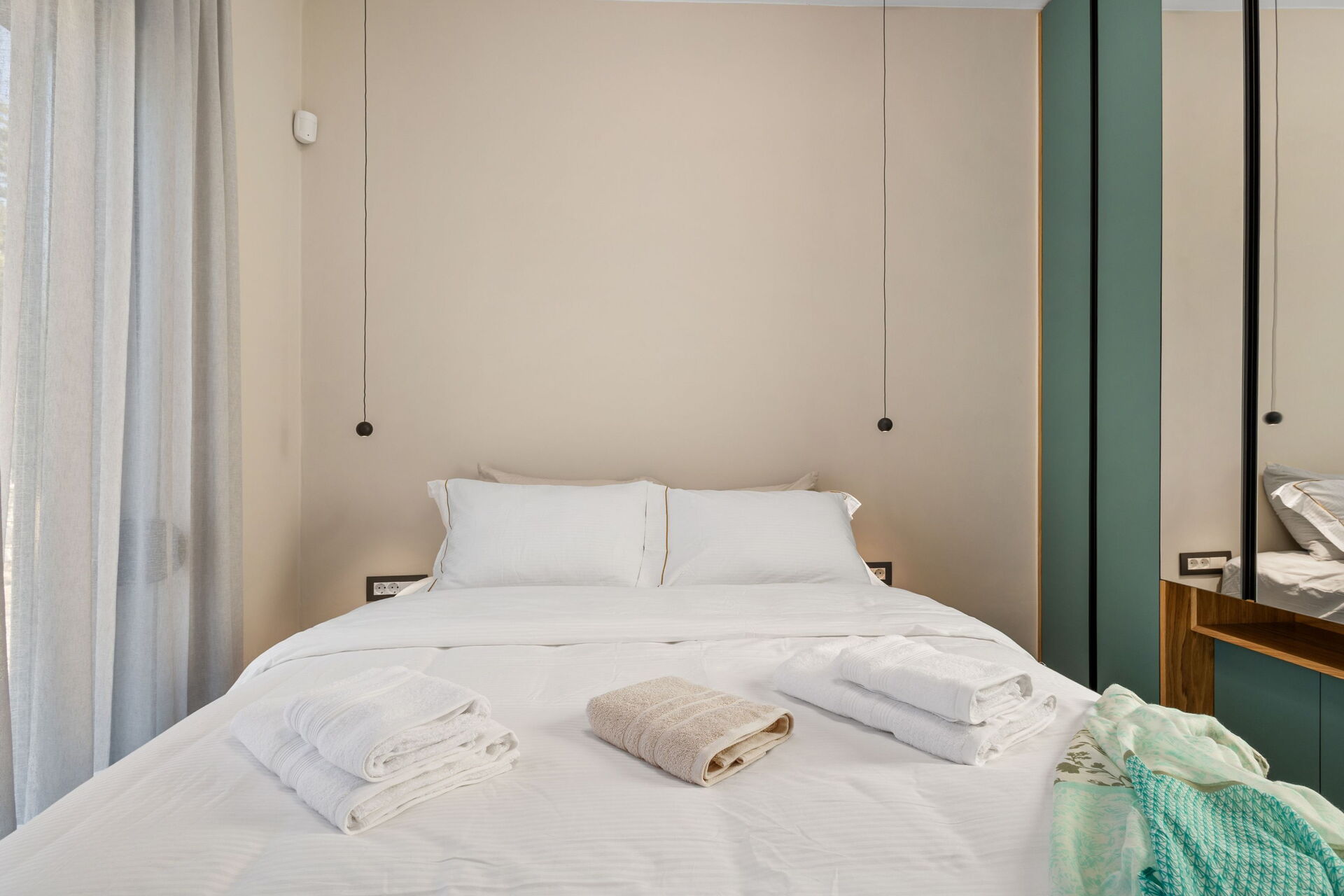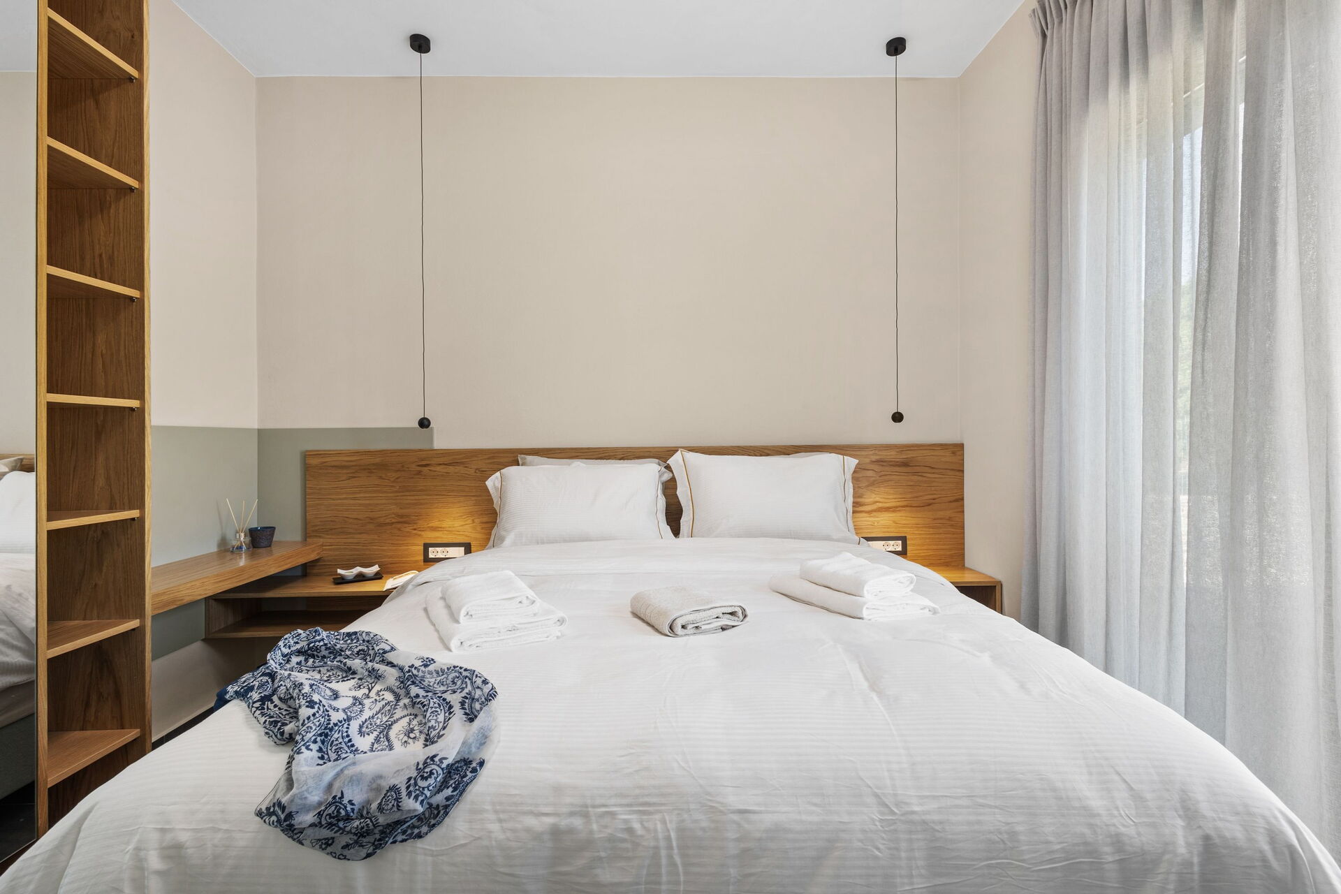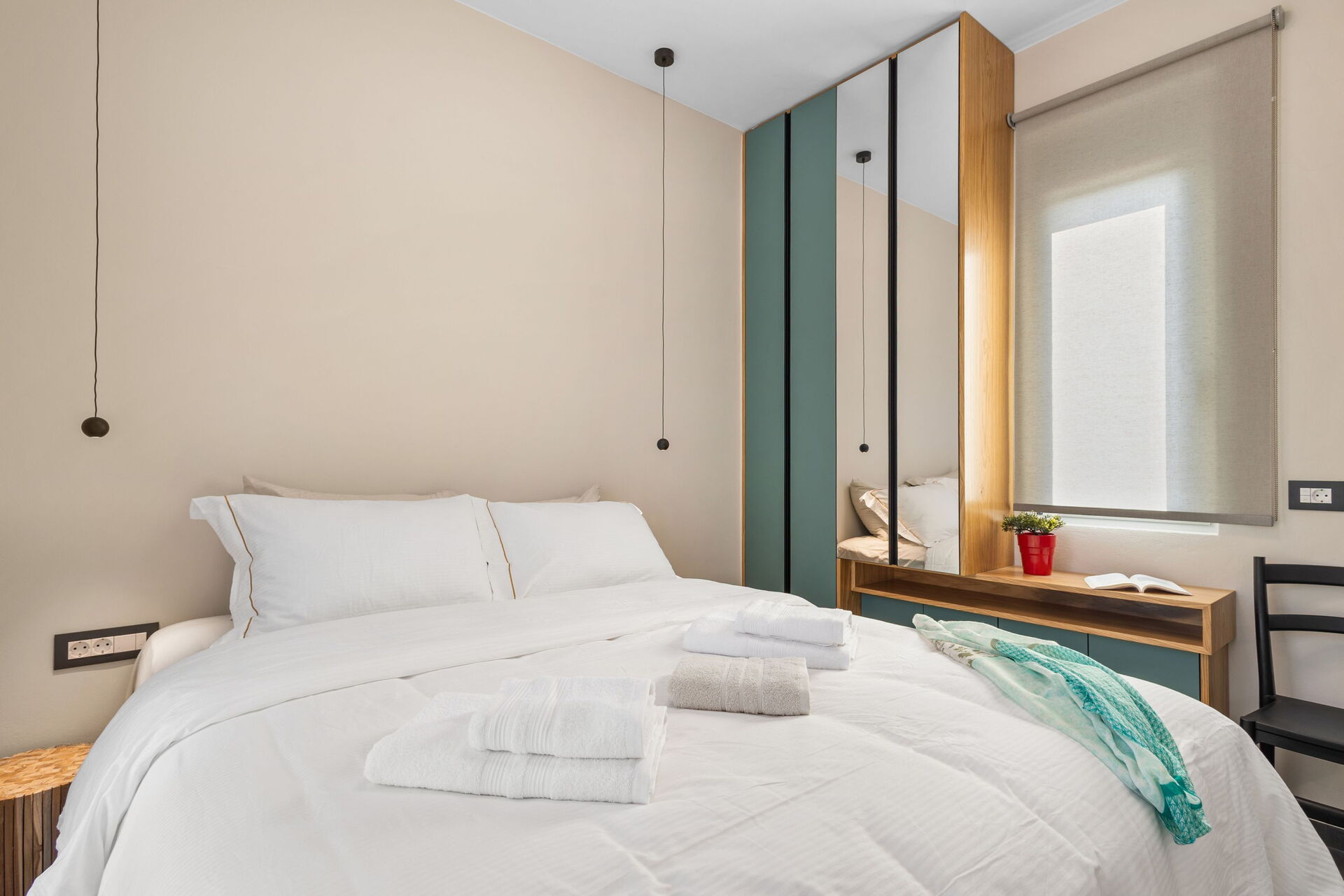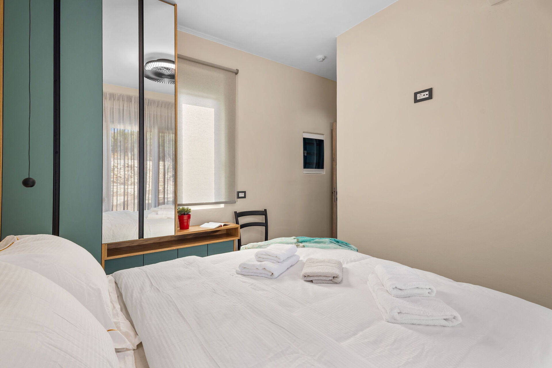 Eerste verdieping: tweepersoonsslaapkamer met eigen badkamer met douche, toegang tot het terras.