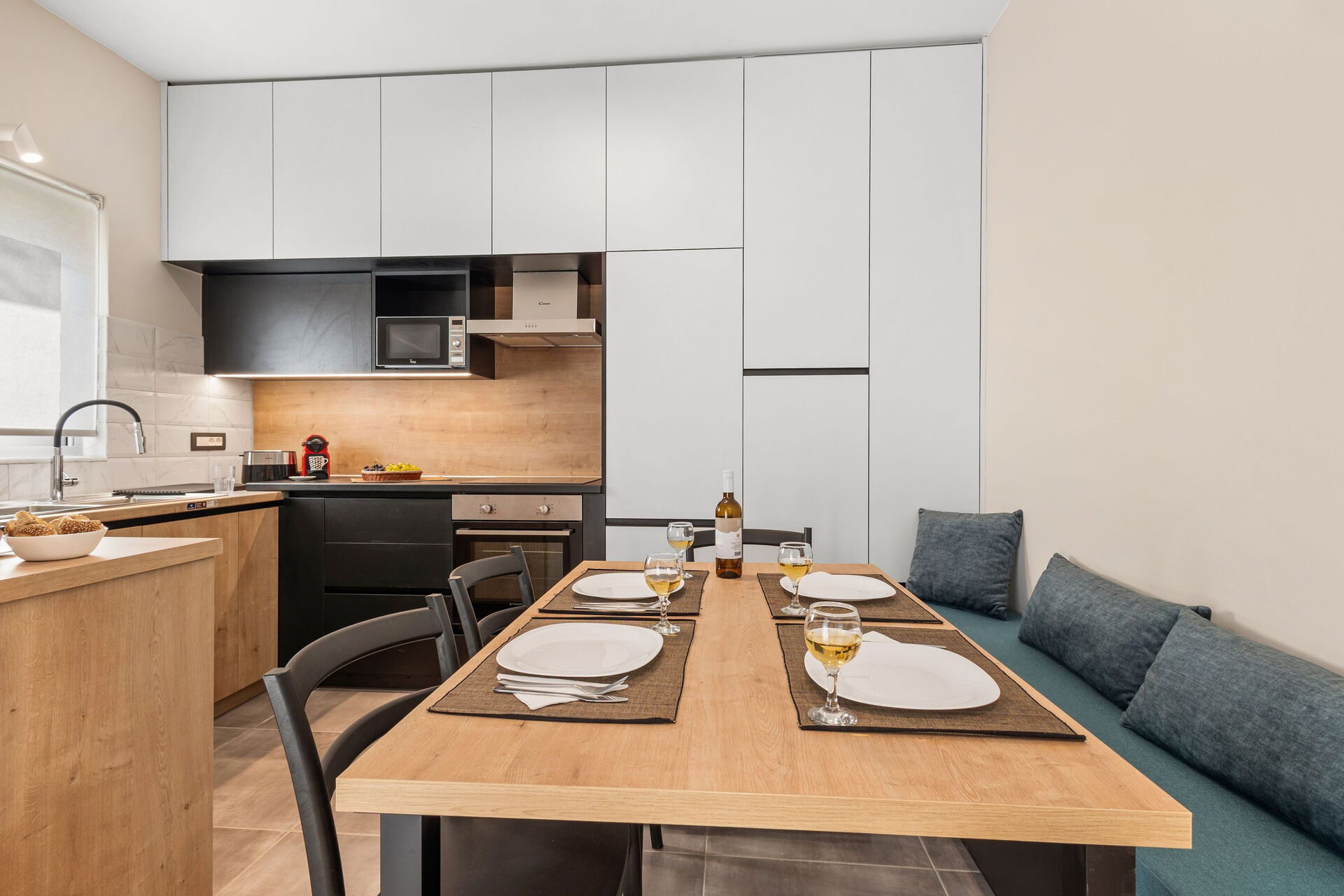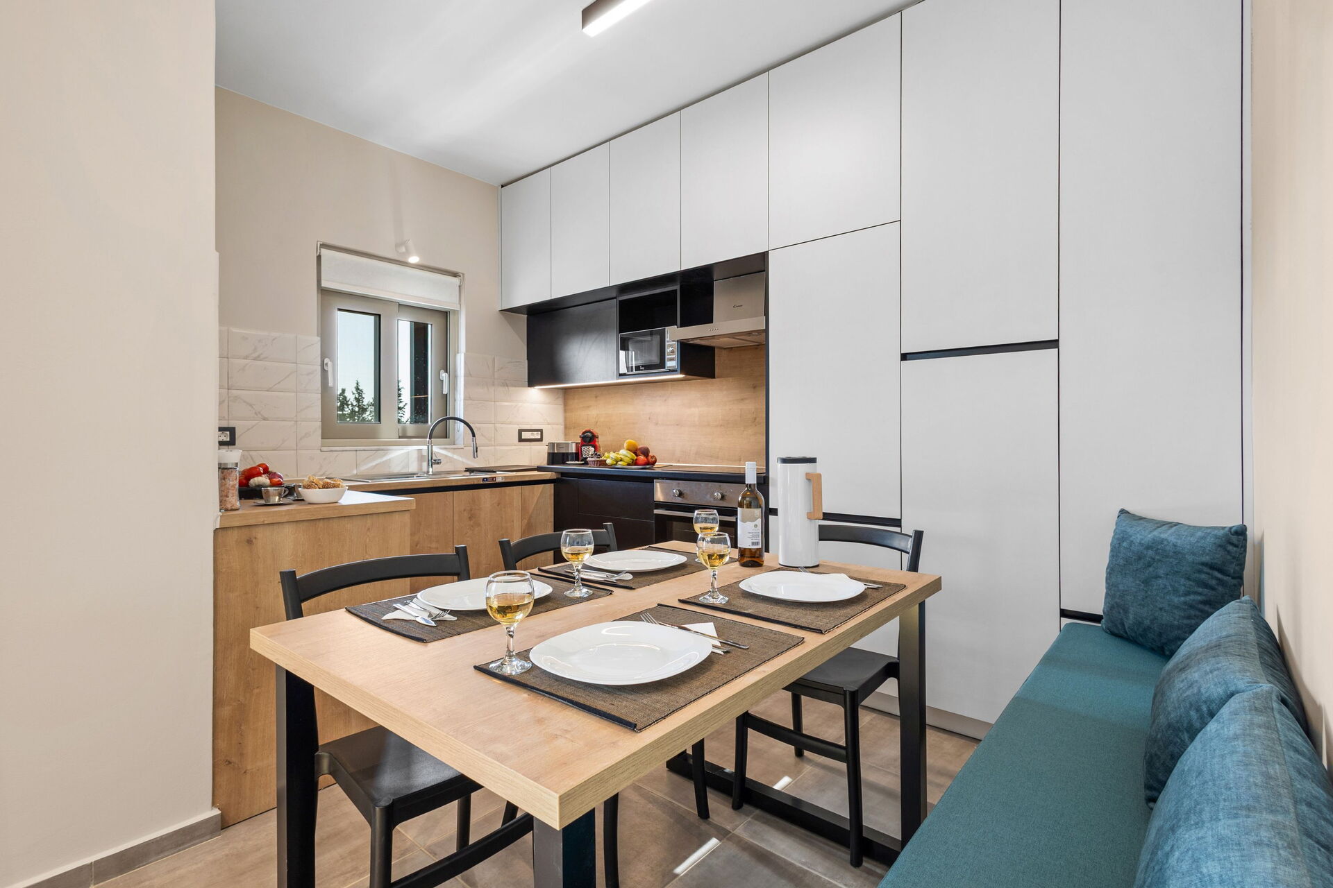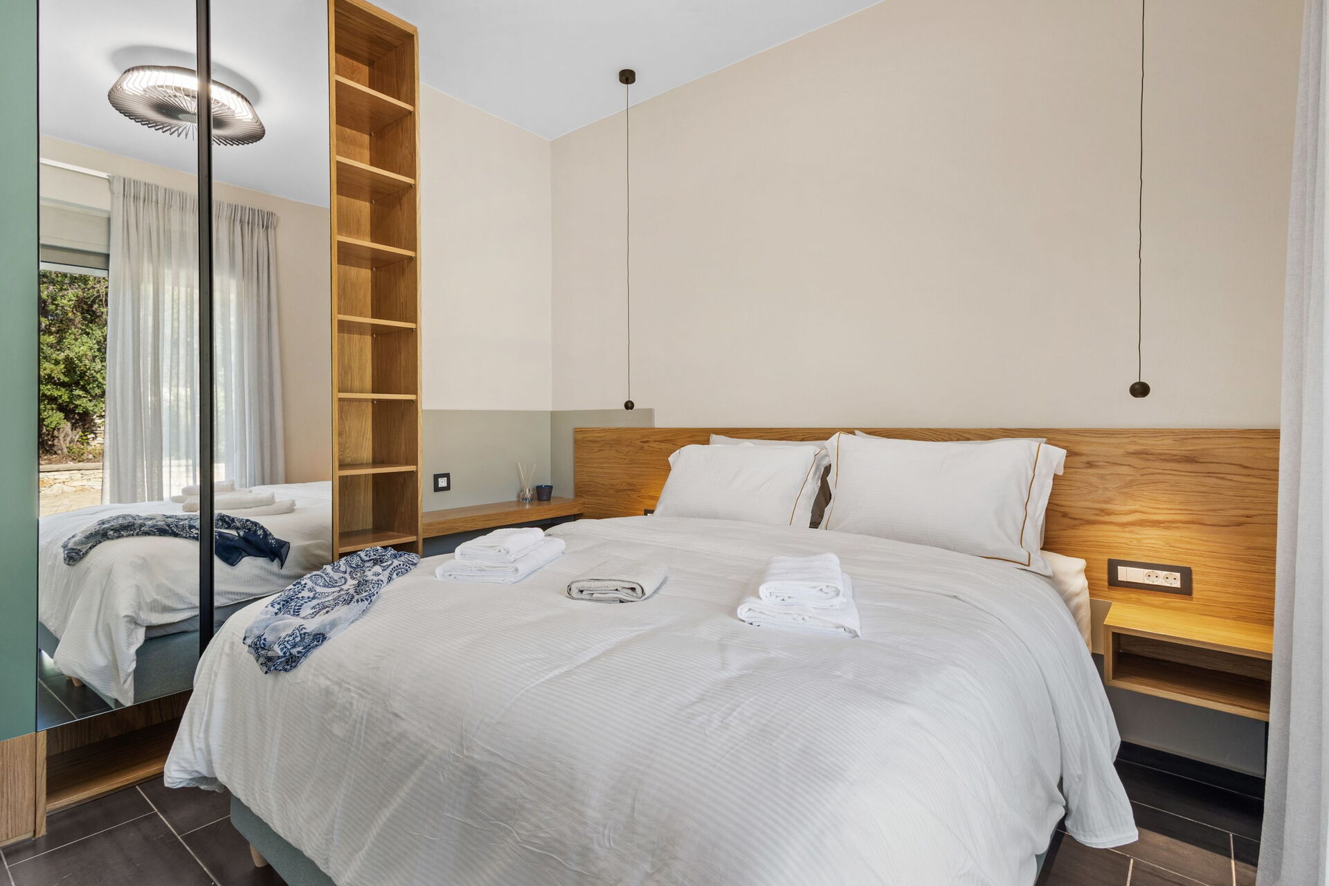 Begane grond: lichte woonkamer met eethoek en keuken (oven, vriezer, koelkast, kookplaat, vaatwasser, magnetron, broodrooster, espressomachine), 2 tweepersoonsslaapkamers, 2 badkamers met douche.