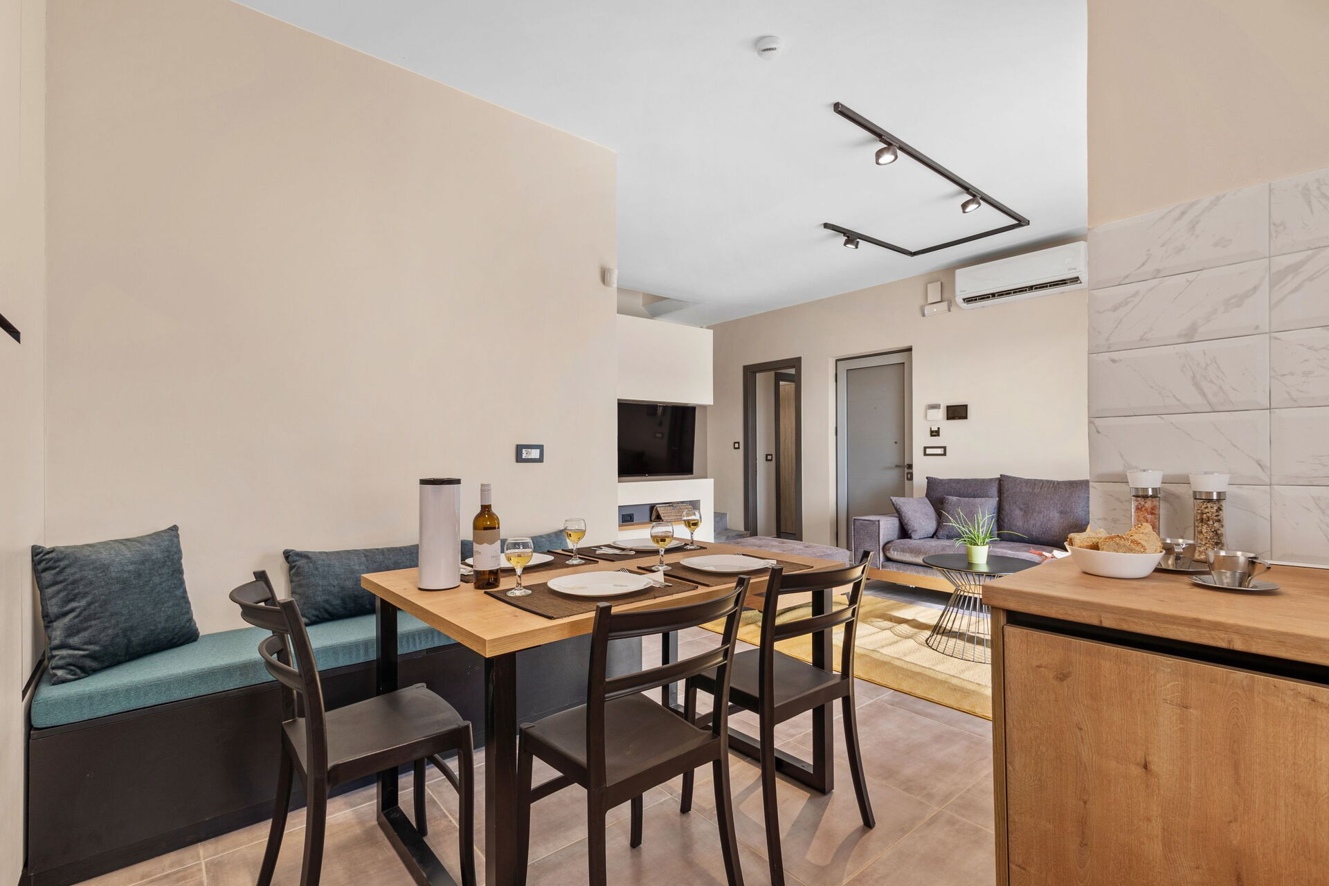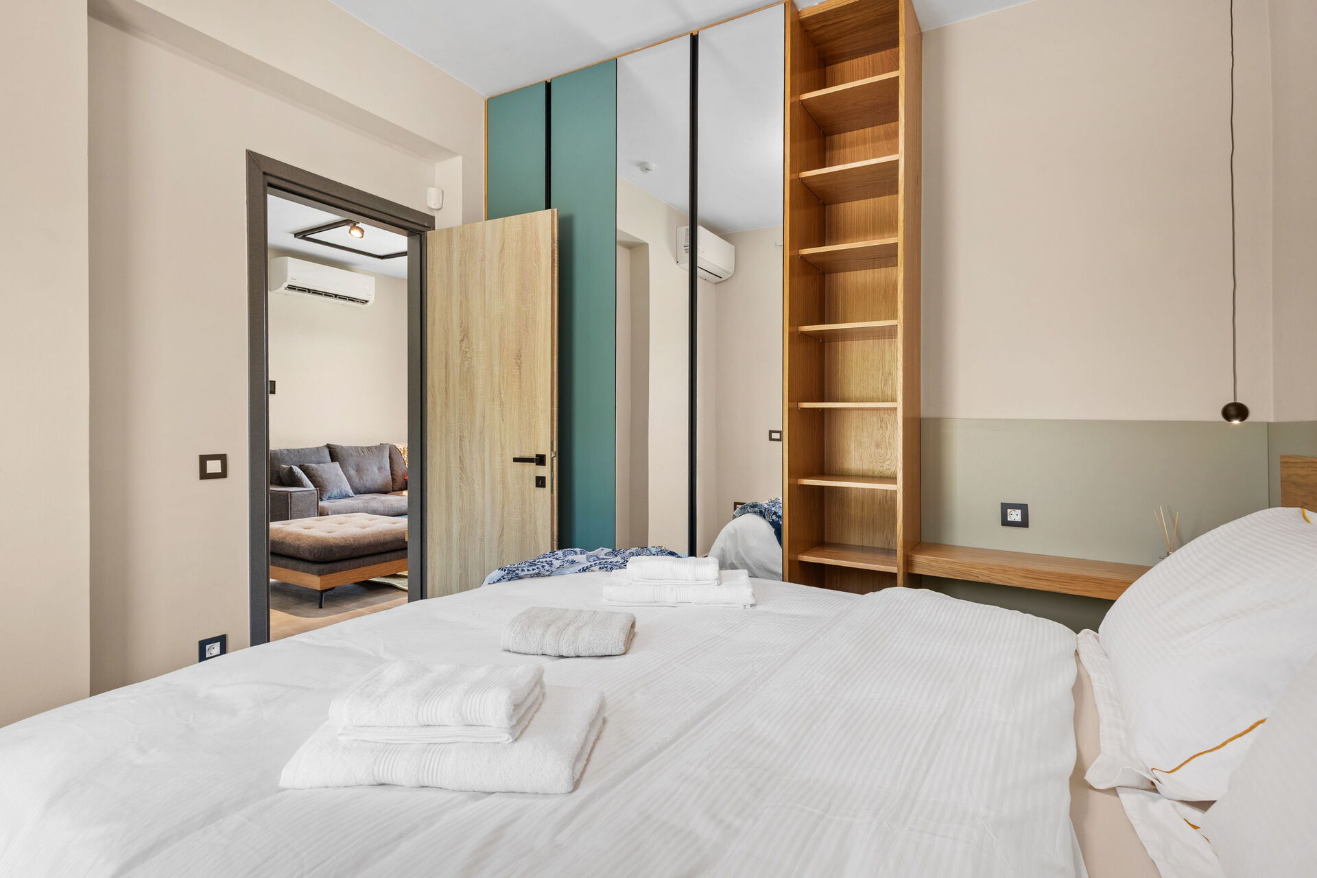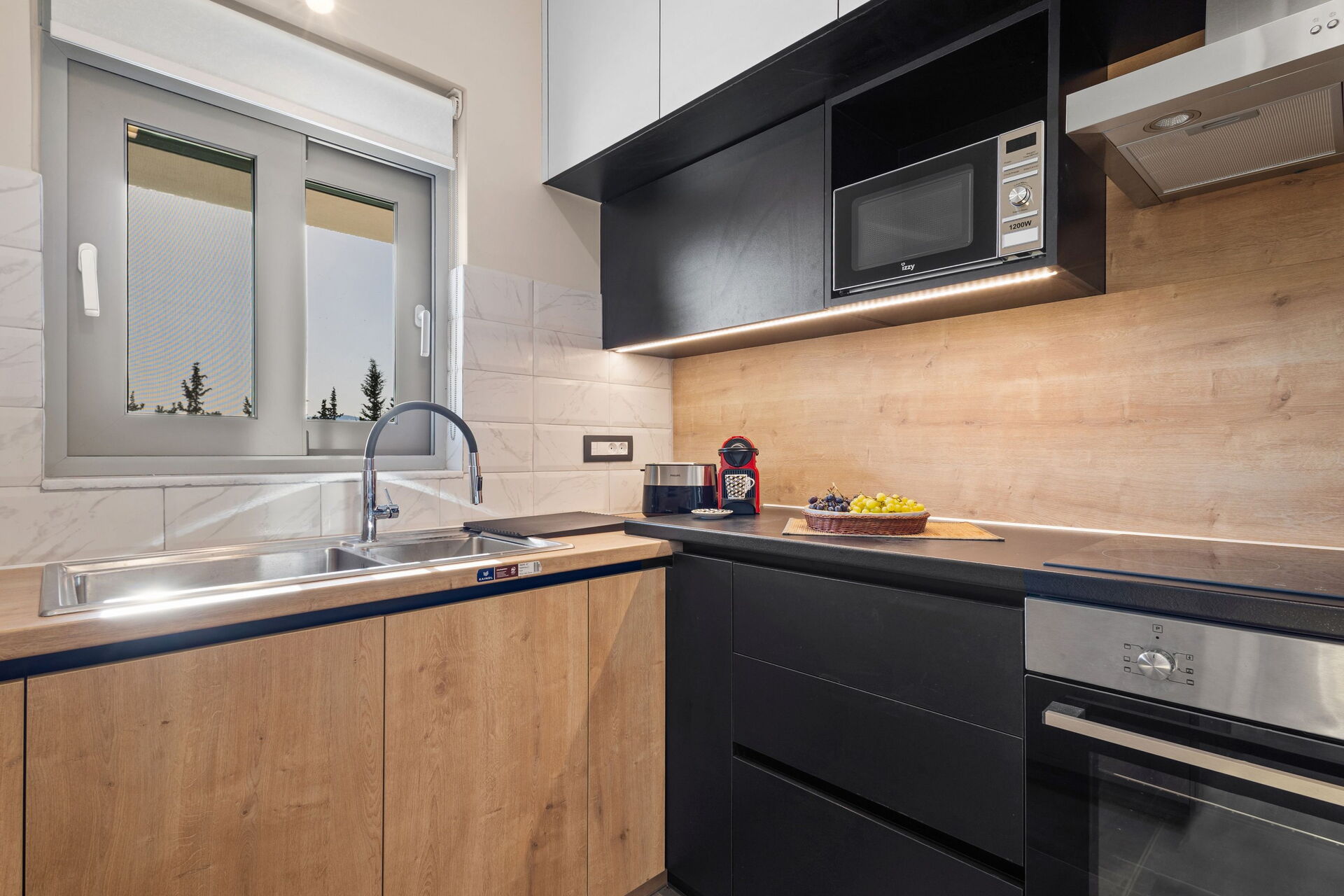 Begane grond: lichte woonkamer met eethoek en keuken (oven, vriezer, koelkast, kookplaat, vaatwasser, magnetron, broodrooster, espressomachine), 2 tweepersoonsslaapkamers, 2 badkamers met douche.