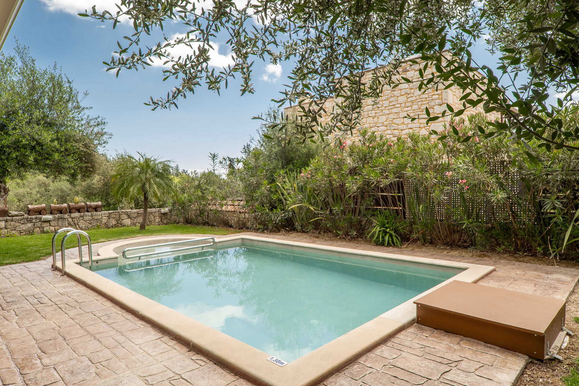 Buiten wordt Villa Nipos omgeven door goed onderhouden tuinen met een gazon, mediterrane struiken en bloemen. Een echte oase om urenlang te luisteren naar het geluid van de cicaden! Het privézwembad (met kindergedeelte) meet 6m x 4,5m en de diepte is tussen 0,4m en 1,5m. Comfortabele ligbedden en parasols zijn aanwezig voor de gasten om heerlijk te genieten in de zon. Een terras bij de ingang van de vakantievilla biedt ook uitstekende mogelijkheden om buiten te eten (met een bakstenen barbecue/oven voor uitstekende houtskool gegrilde maaltijden).