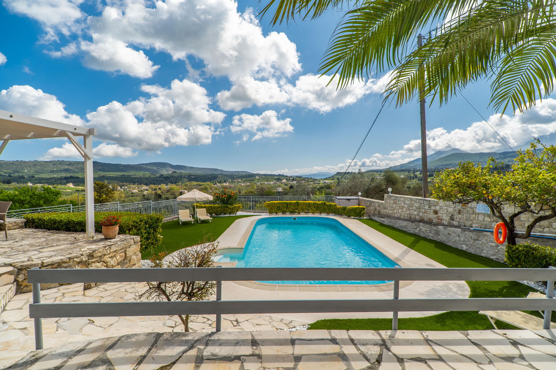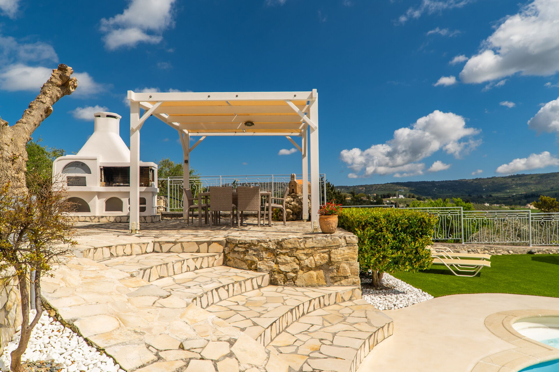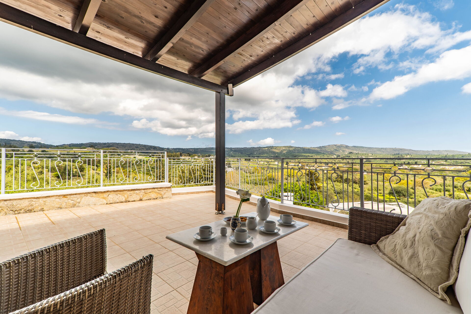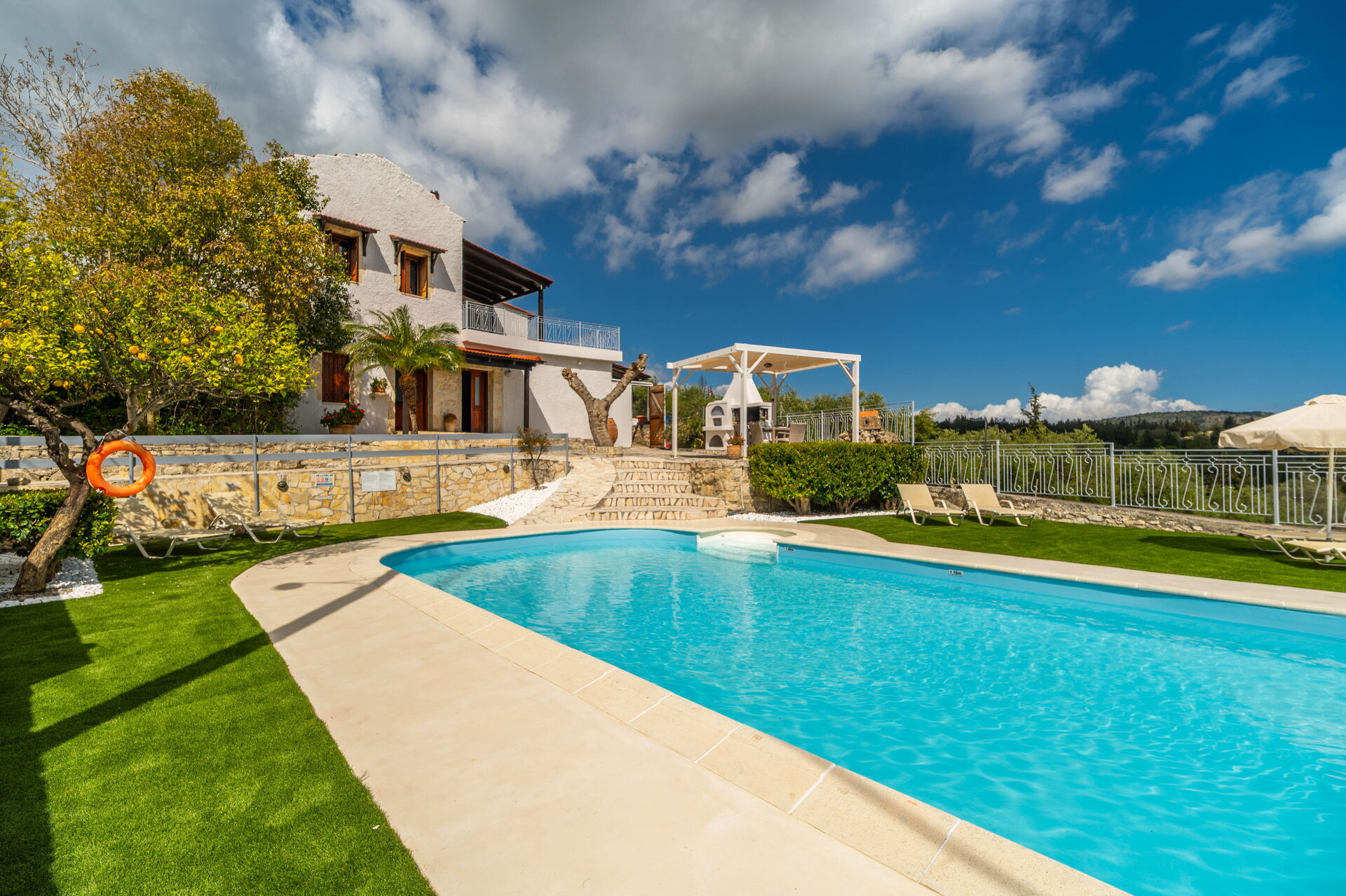 Buiten zijn er veel grote, schilderachtige ruimtes zoals de ruime terrassen en het zwembad, waar je kunt ontspannen met familie of vrienden. Het zwembad biedt uitzicht op de omliggende heuvels en het platteland: olijfbomen, cipressen en mediterraan struikgewas zullen je achtergrond zijn voor onvergetelijke momenten onder de Griekse zon.