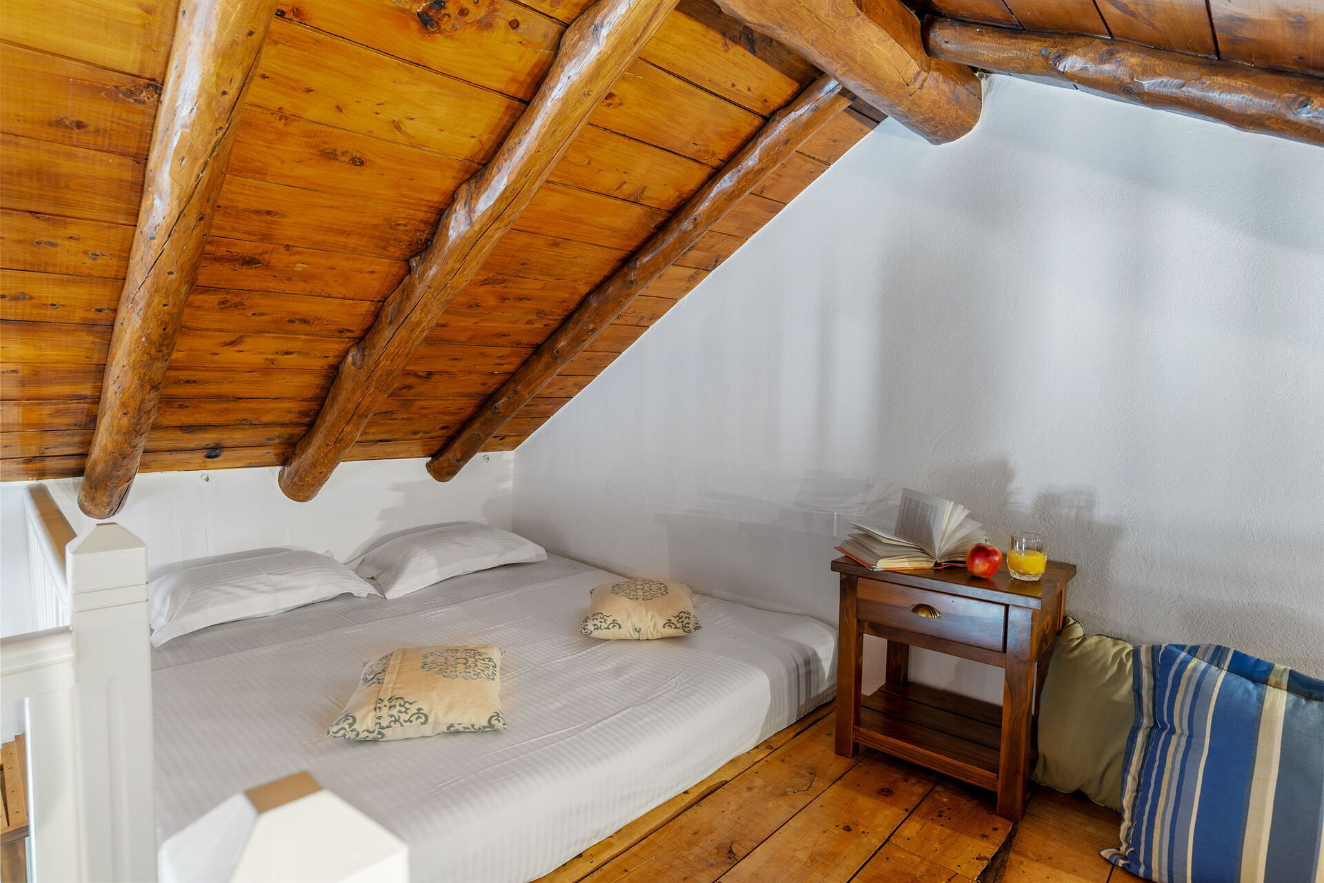 Eerste verdieping: hal met toegang tot het terras, slaapkamer op de vide met tweepersoonsbed (minimale hoogte: 0,65 meter; maximale hoogte: 1,70 meter), badkamer met bad, tweepersoonsslaapkamer.
