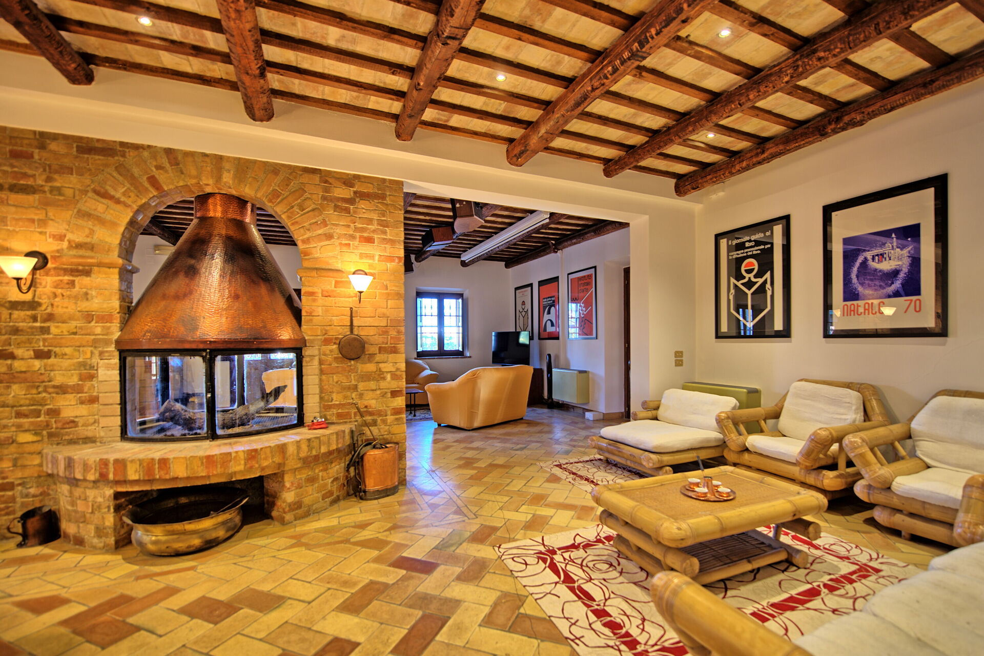 Binnen is een ruime woonkamer met een heerlijke open haard de perfecte plek om te ontspannen en een film op tv te kijken, of gebruik te maken van de projector met 300-inch scherm en professionele Bose-audiosysteem.