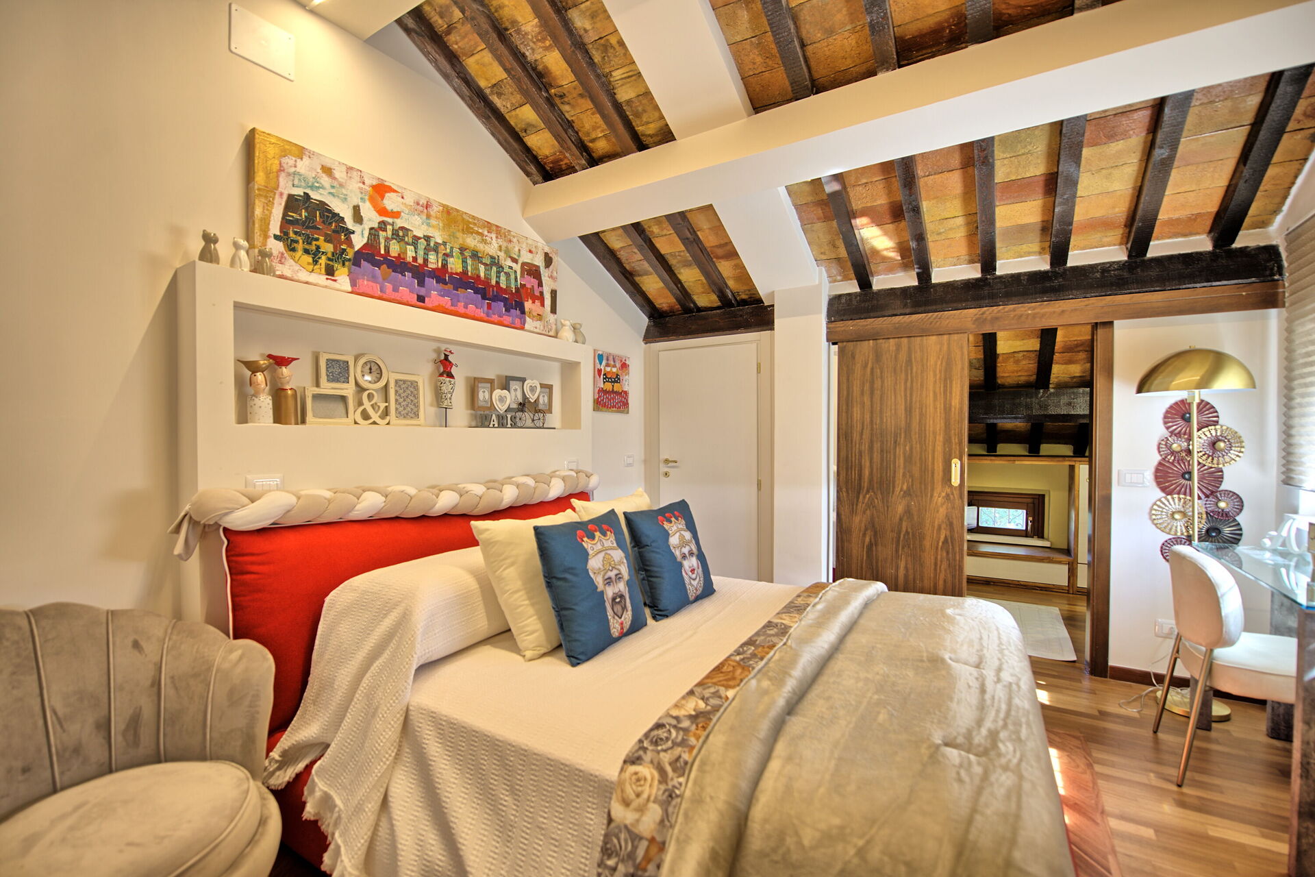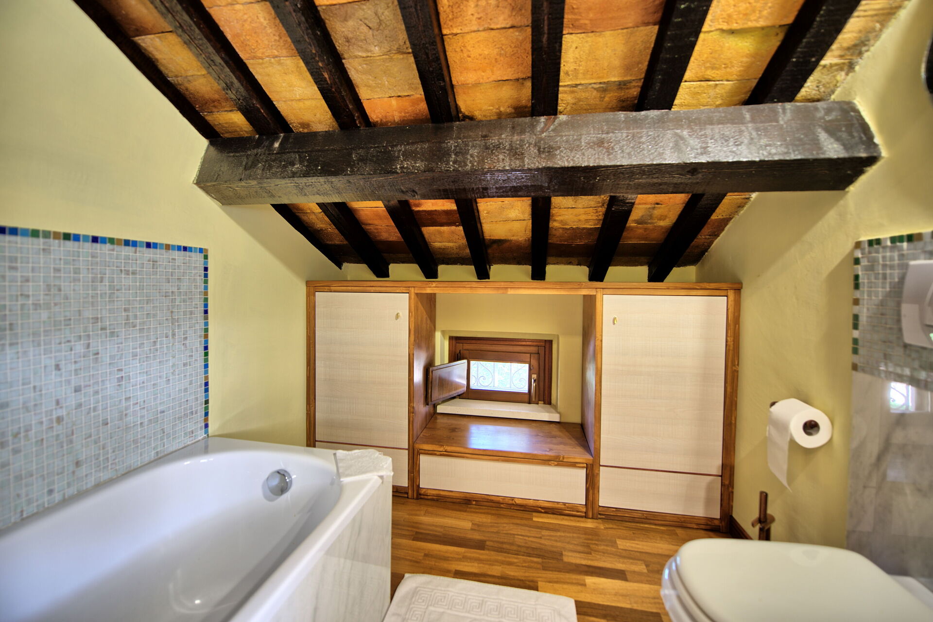 Eerste verdieping (bereikbaar via een interne trap in de buurt van de slaapkamers): slaapkamer met tweepersoonsbed (airconditioning, TV, parketvloer, balken en ventilator) met eigen badkamer met douche.