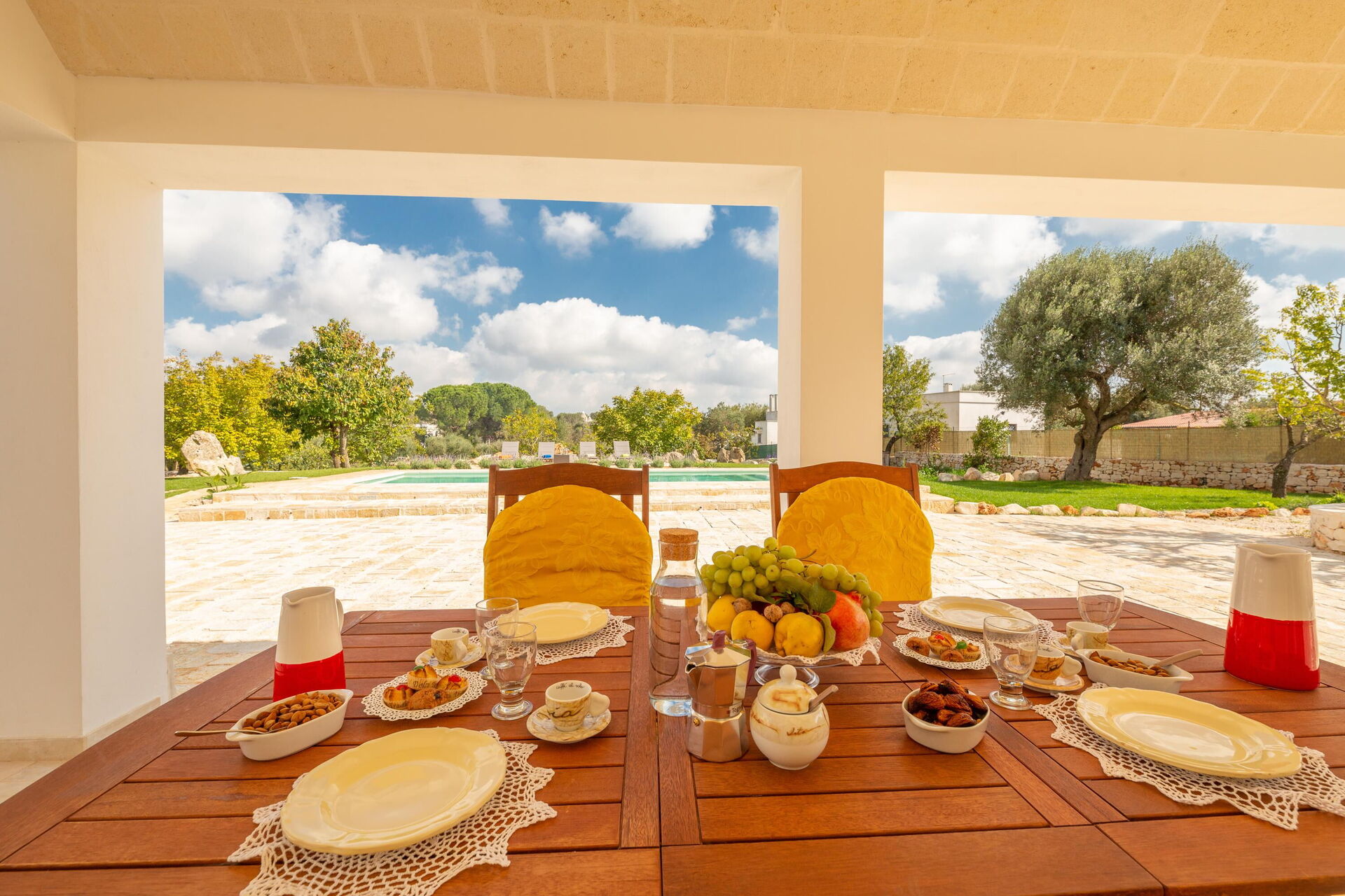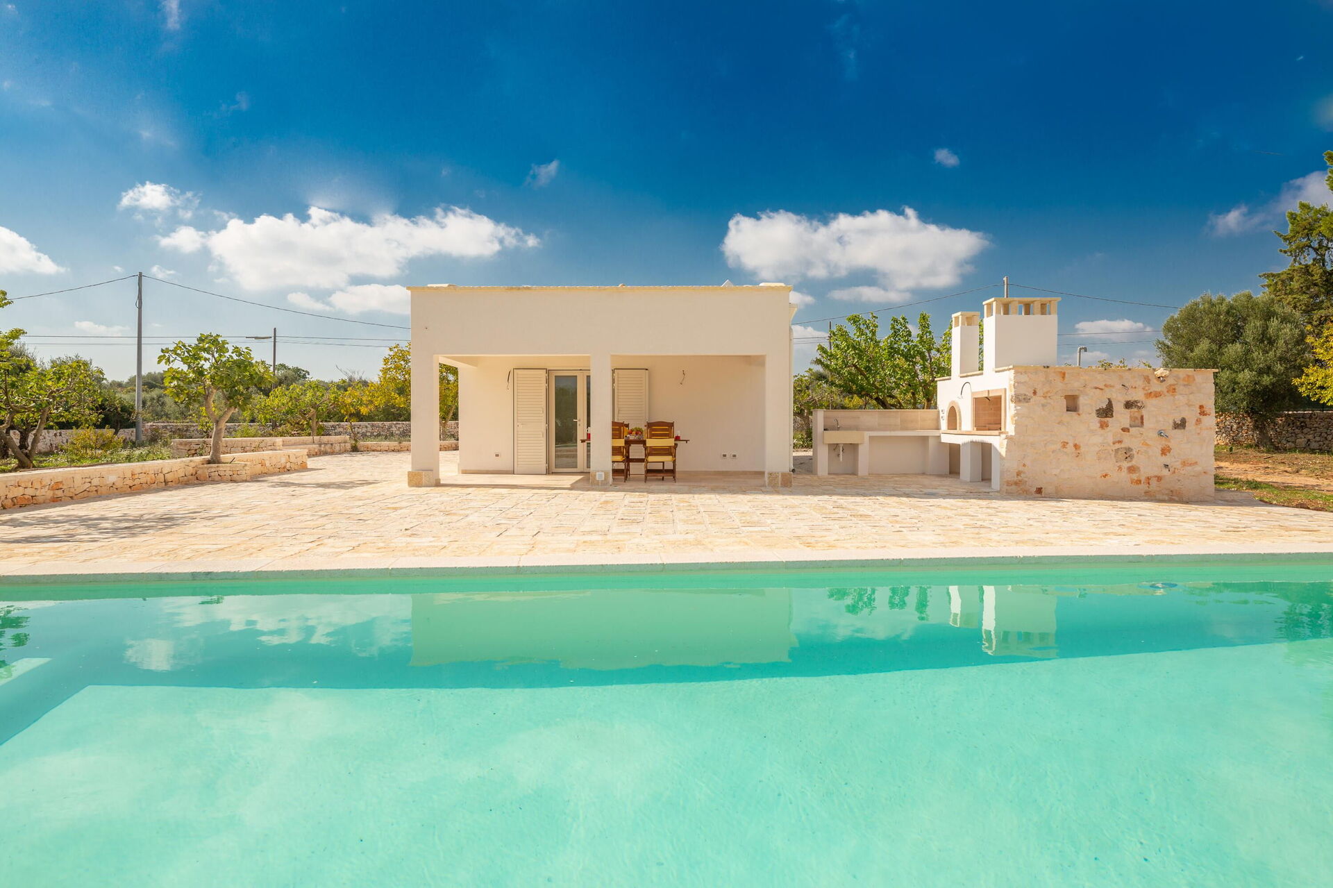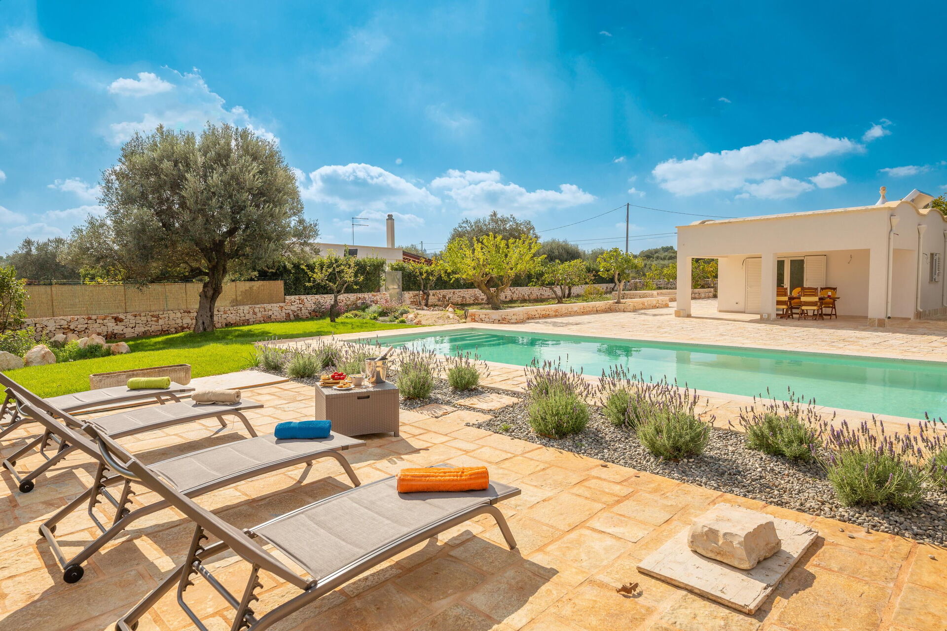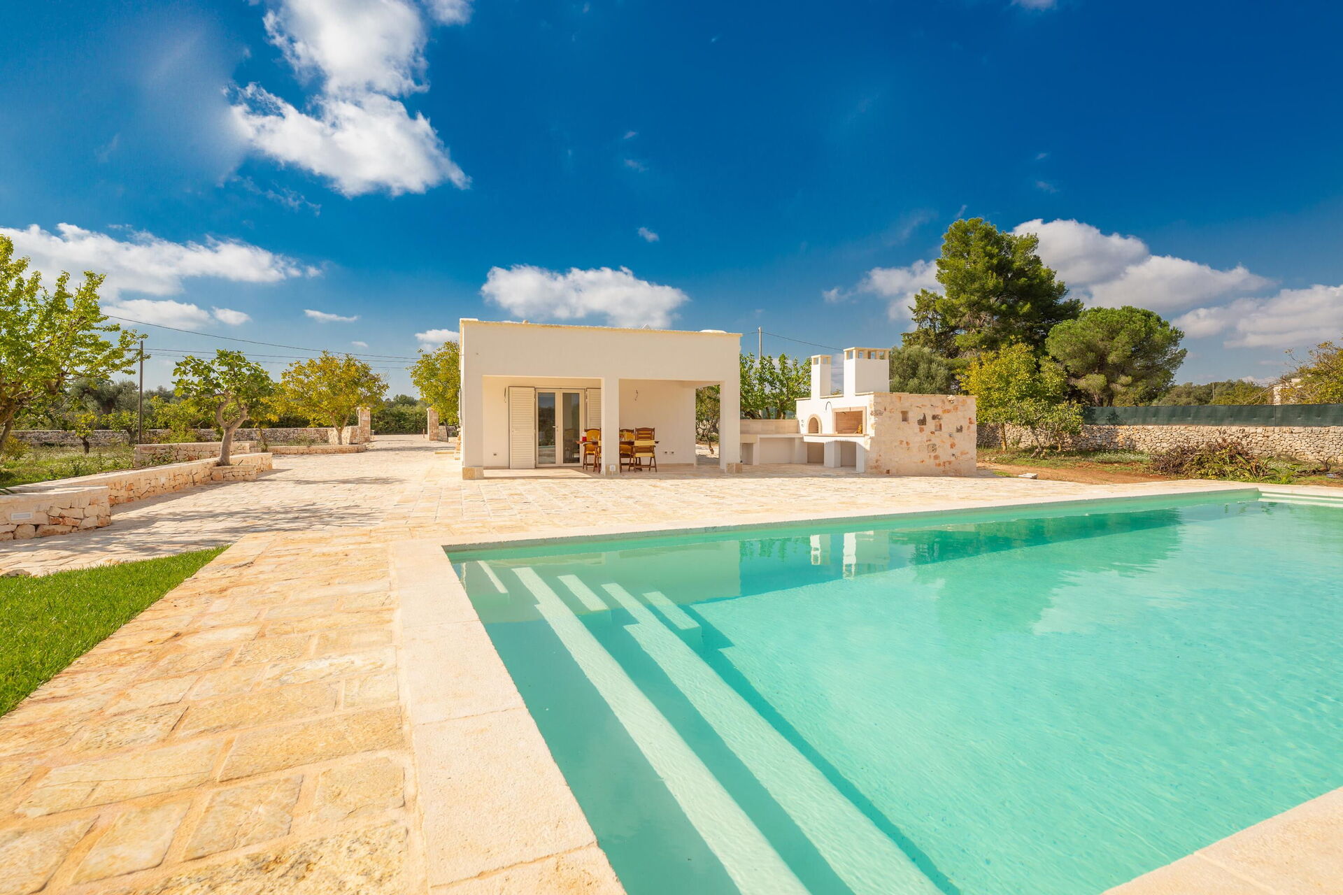 De villa is gelegen in een grote, omheinde tuin van ongeveer 4000 m2. Breng de warme Apulische zomerdagen buiten door, ontspannend bij het elegante privézwembad met Romeinse treden; genieten met je vrienden of familie op de veranda; en wandelen in het park tussen de olijfbomen.
